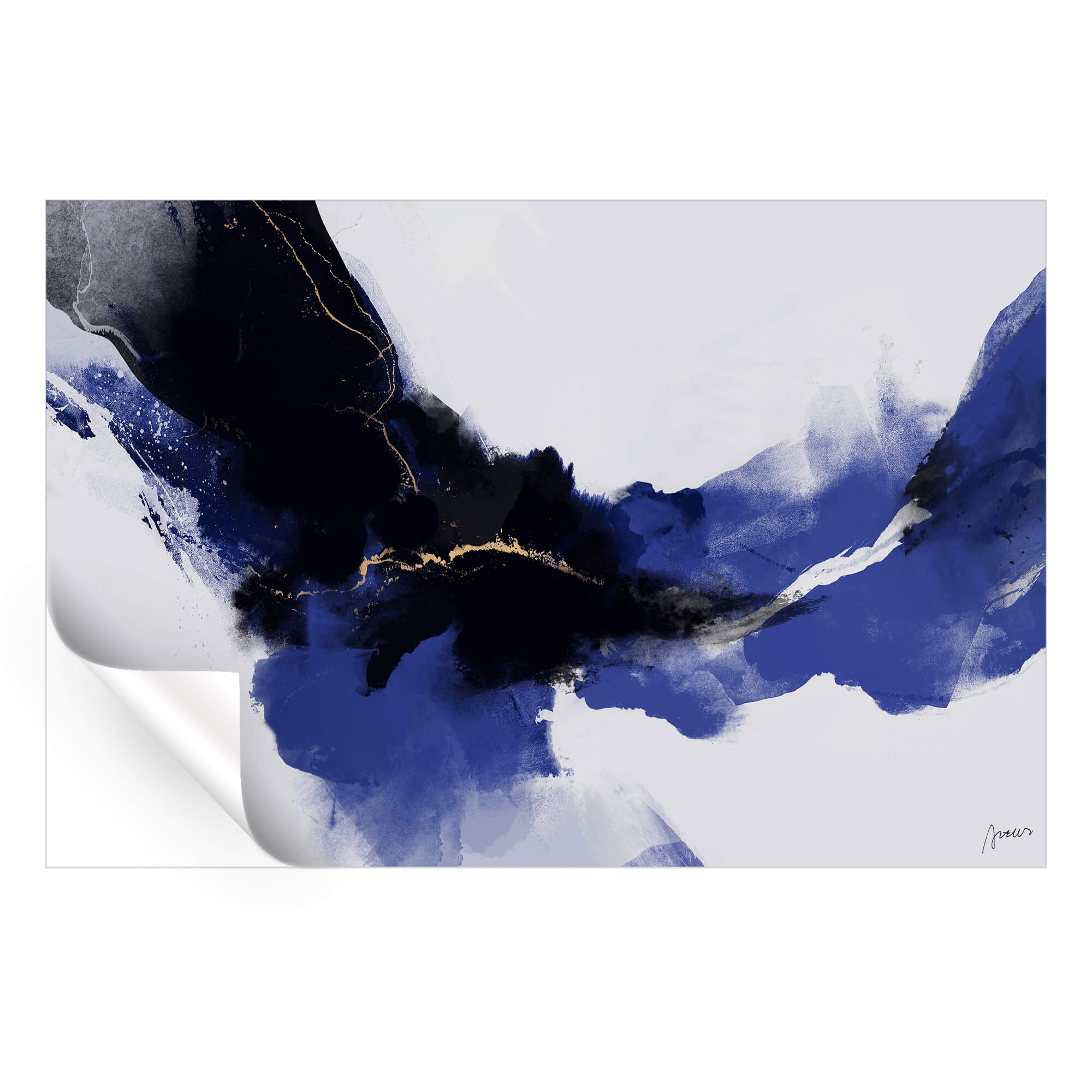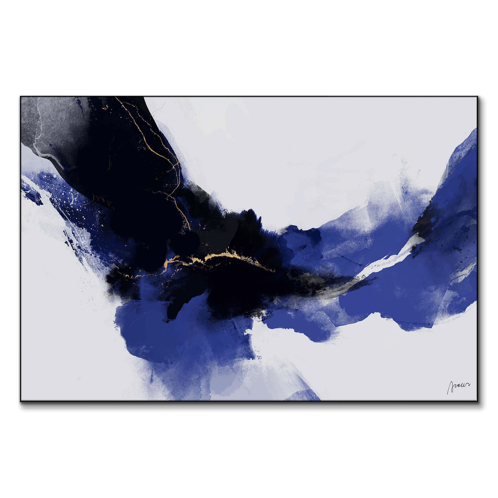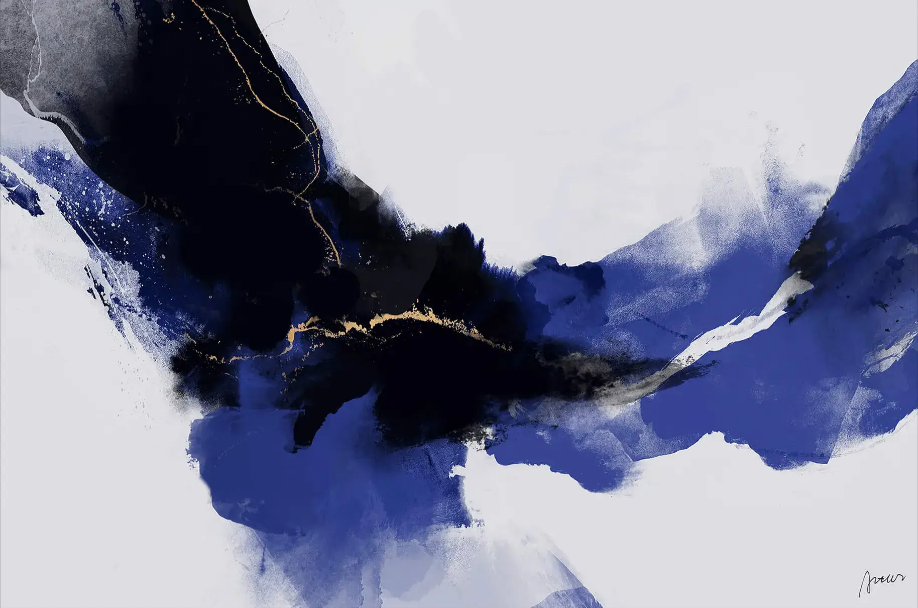 This abstract composition captures movement and emotion through deep navy tones, rich black textures, and delicate streaks of gold. The colors blend and collide like ink in water, creating a sense of both chaos and calm. The metallic lines add warmth and depth, hinting at light breaking through shadow.