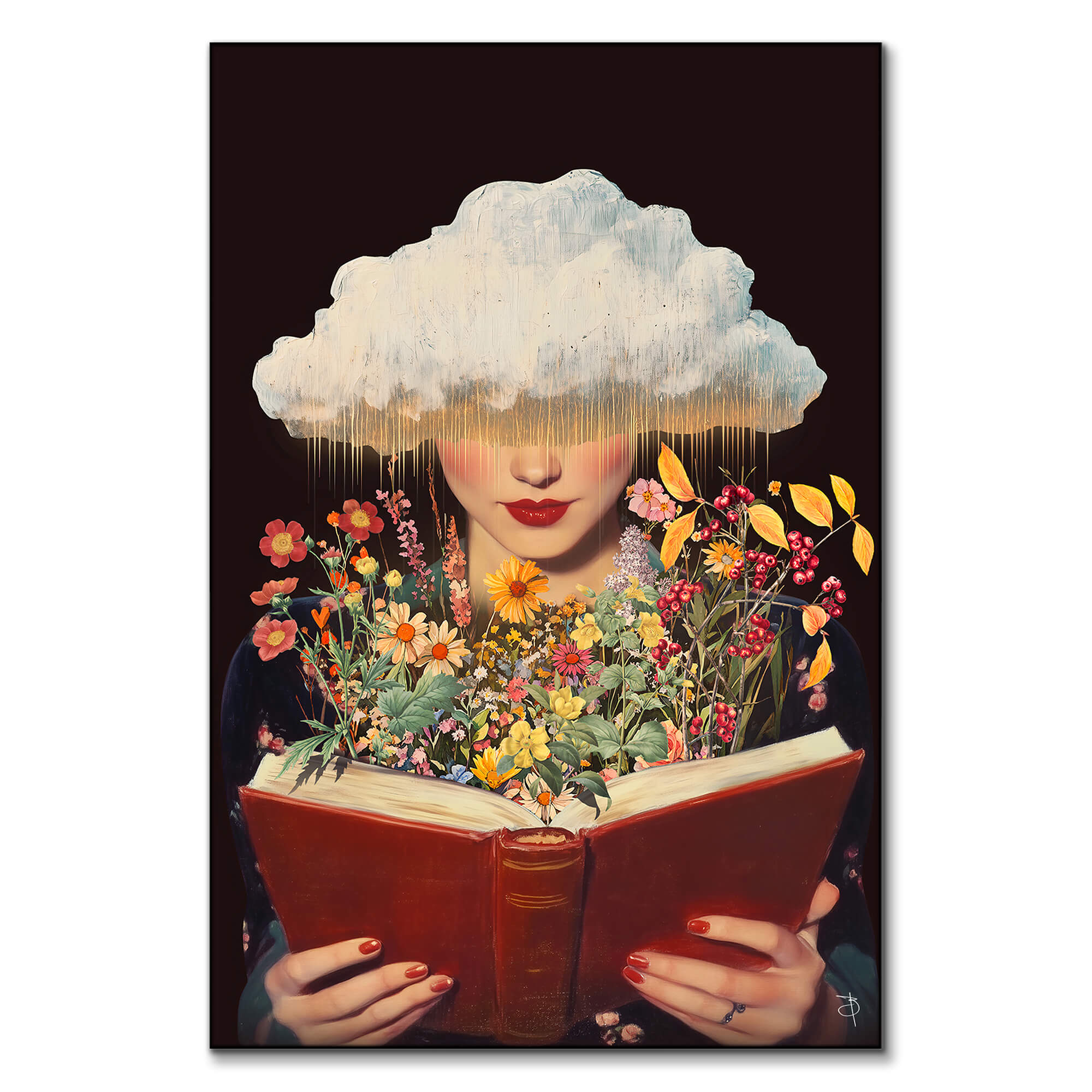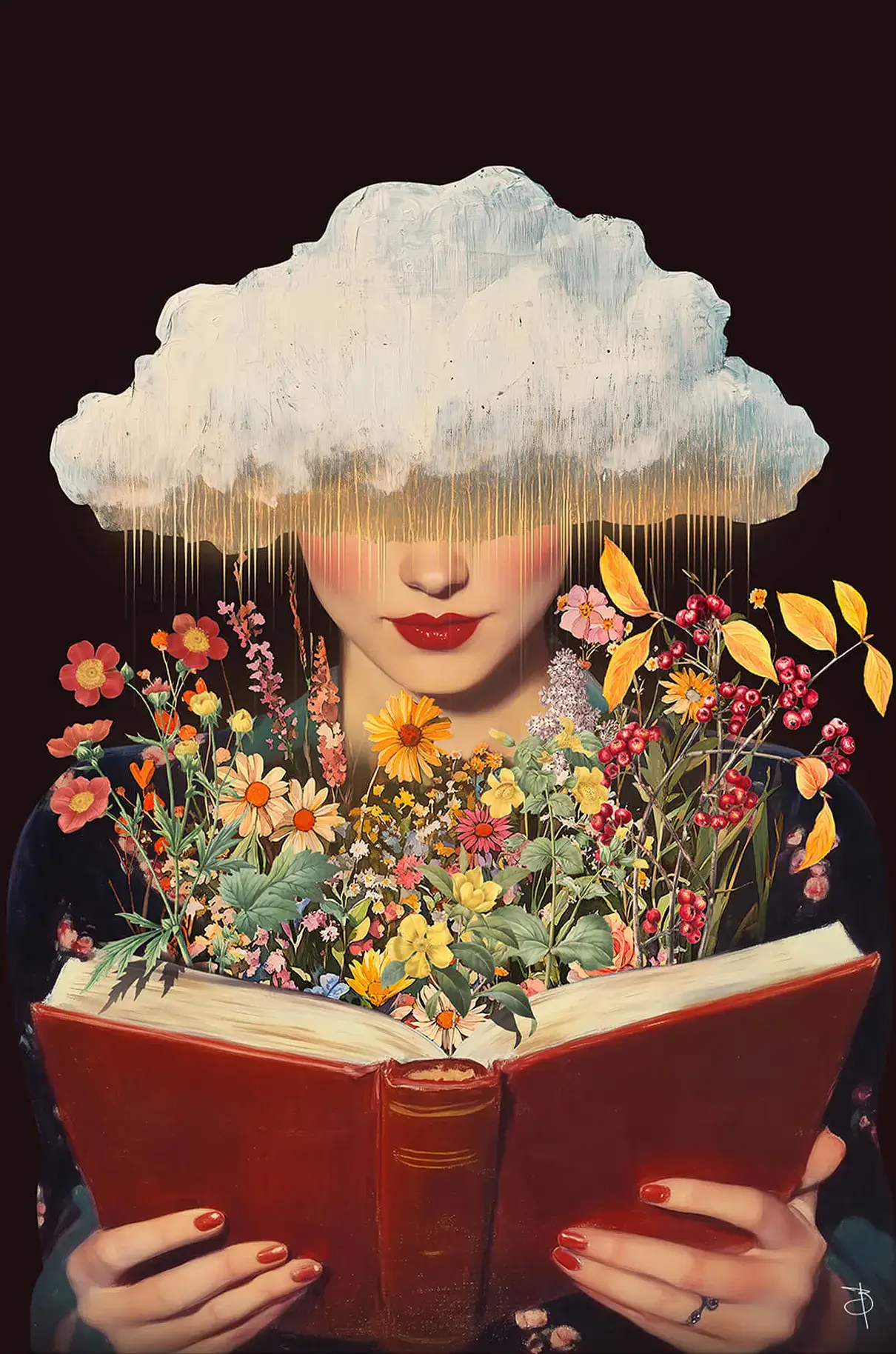 A symbolic and thought-provoking surreal artwork depicting a figure immersed in the act of reading, with flowers and plants blooming from the open pages of a book. The scene conveys the power of knowledge, intellectual growth, and personal transformation, with the figure’s eyes obscured by a floating cloud, symbolizing the mind’s connection to nature and wisdom.