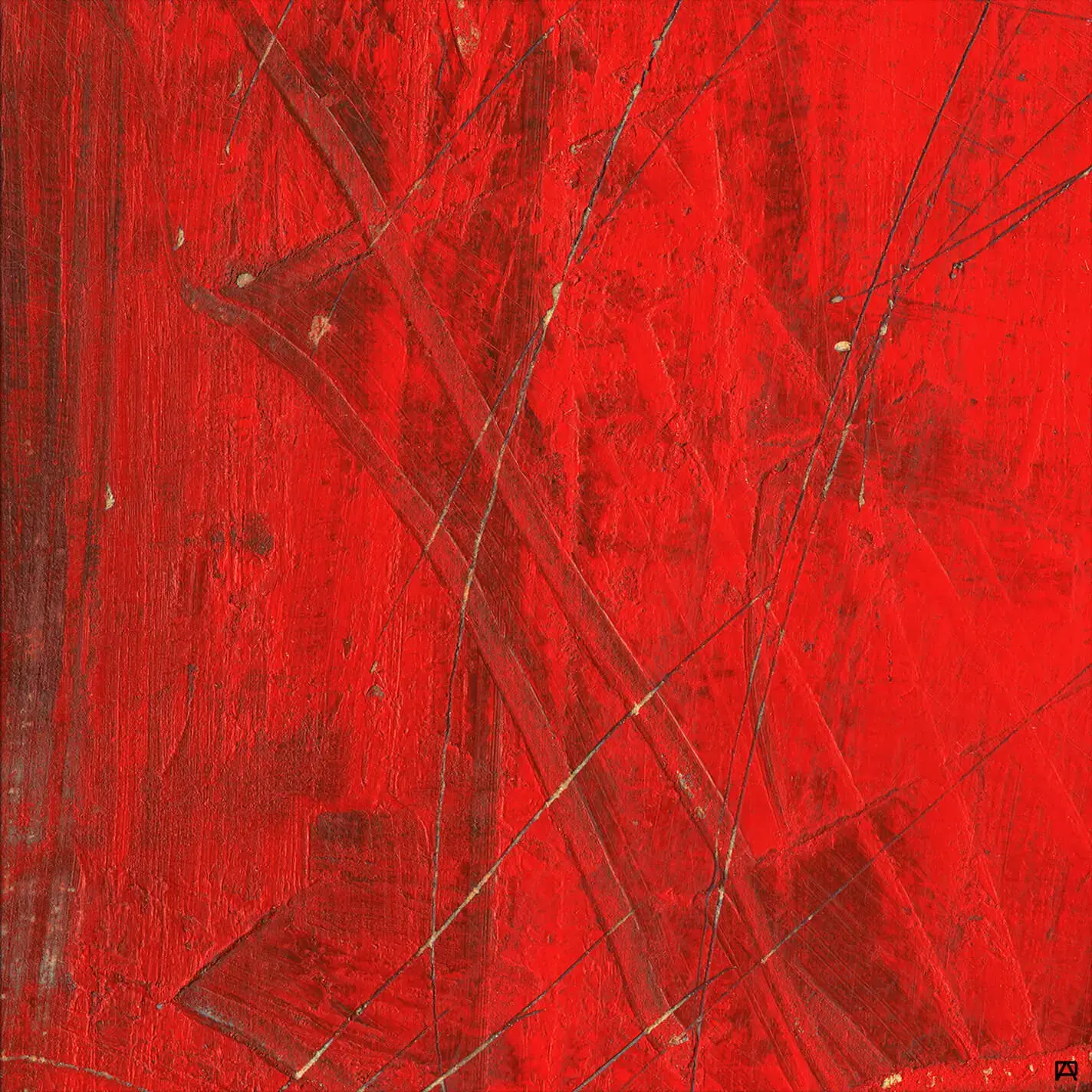 A vibrant red is intersected by bold marks throughout its composition. These lines are scraped into the surface, creating a rhythm.