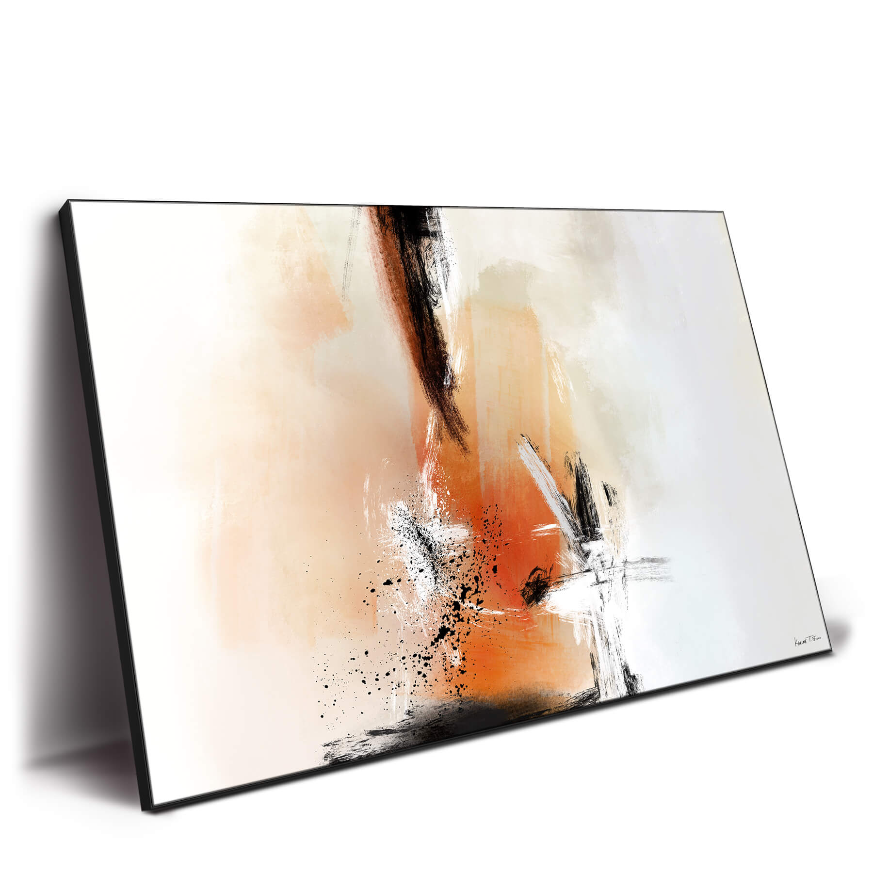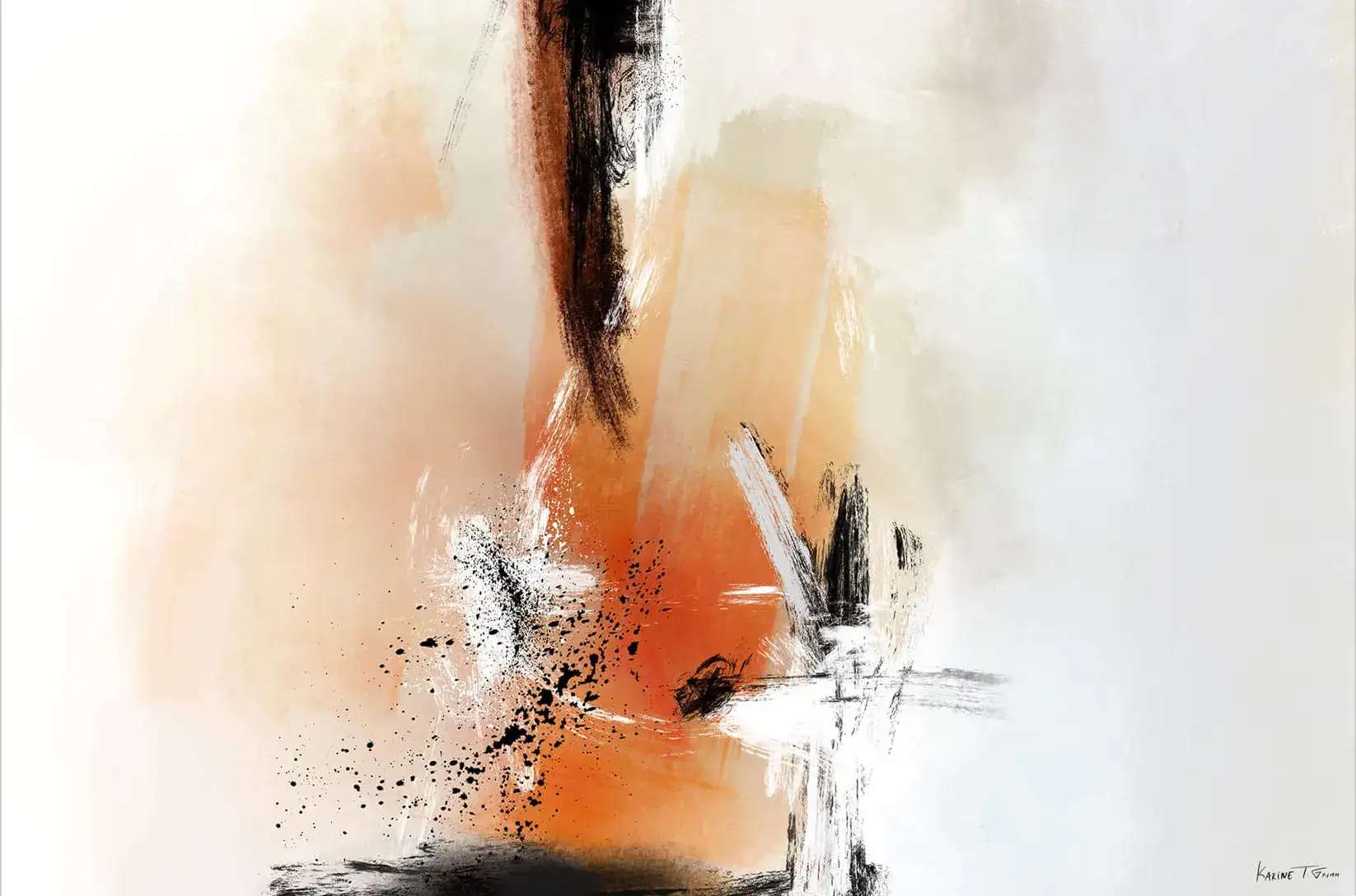 Harsh lines and soft washes of color coexist in a delicate balance, with a bold streak of umber cutting through the center like a rift in the earth. A warm, apricot hue emanates from beneath, giving the impression of an inner glow. Flecks of black are strewn across, while white strokes add contrast. These two elements create a focal point that draws the eye like a flash of insight amidst chaos.