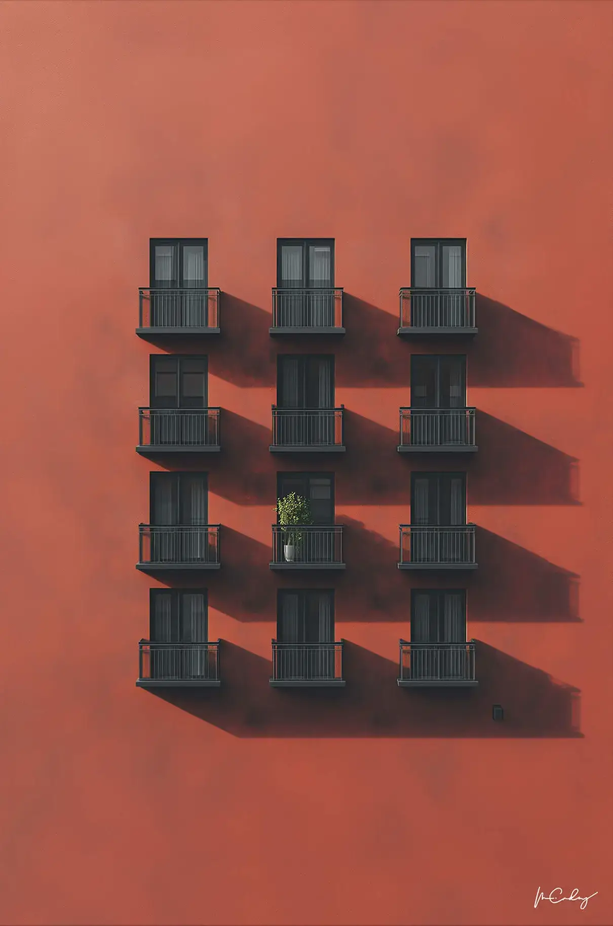 Dark balcony doors align in three precise columns against a rich, red wall. The matte surface absorbs light while the iron railings reflect a subtle gleam. Long diagonal shadows stretch down each section, adding depth to the otherwise flat plane. A single green plant on the center balcony interrupts the strict pattern in a quiet, calming way. The vertical format emphasizes height, leading the eye upward. Muted textures in the stucco contrast with the clean-lined architecture. The scene feels silent and almost cinematic, evoking a lonely city afternoon. Every angle is crisp, hinting at photographic rather than painted detail.