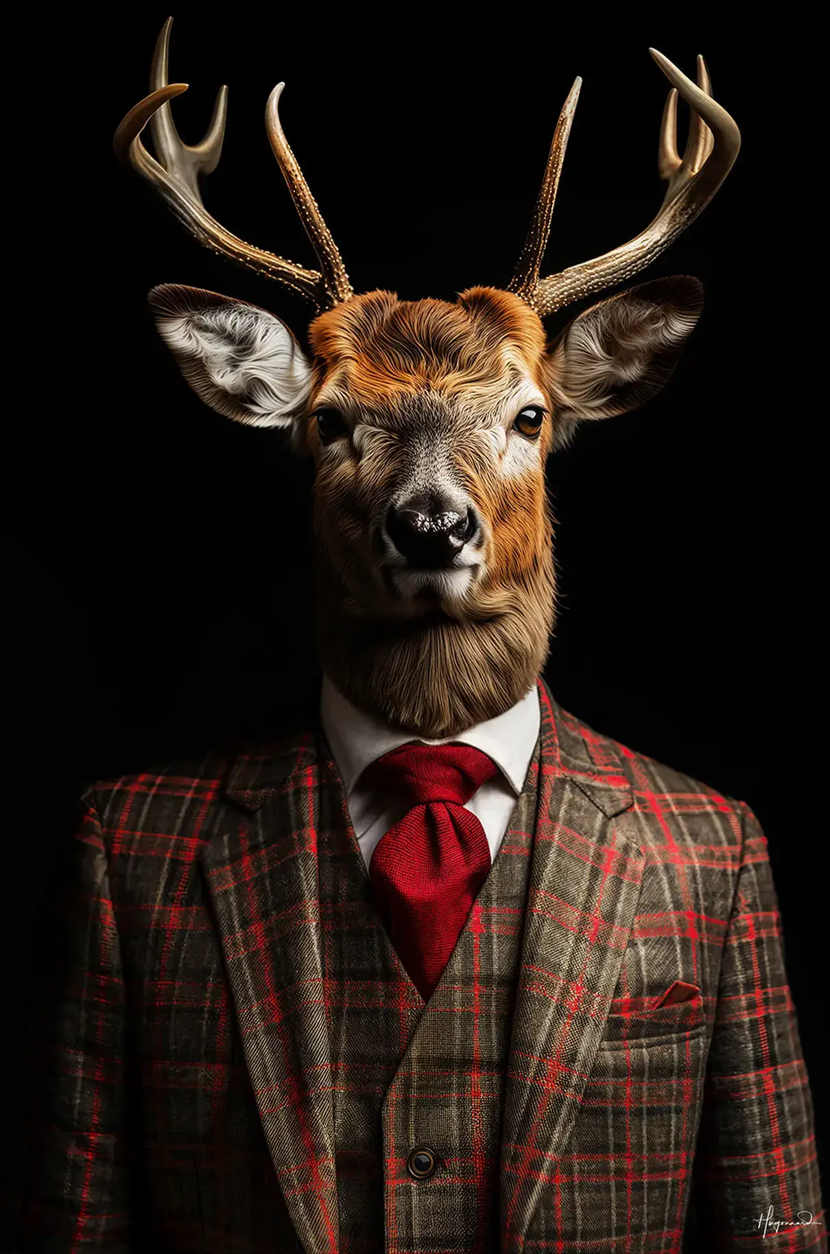 A deer wearing a stylish plaid suit embodies a unique blend of nature and fashion. The intricate details of the deer’s face and majestic antlers paired with the elegant outfit create a striking visual impact.