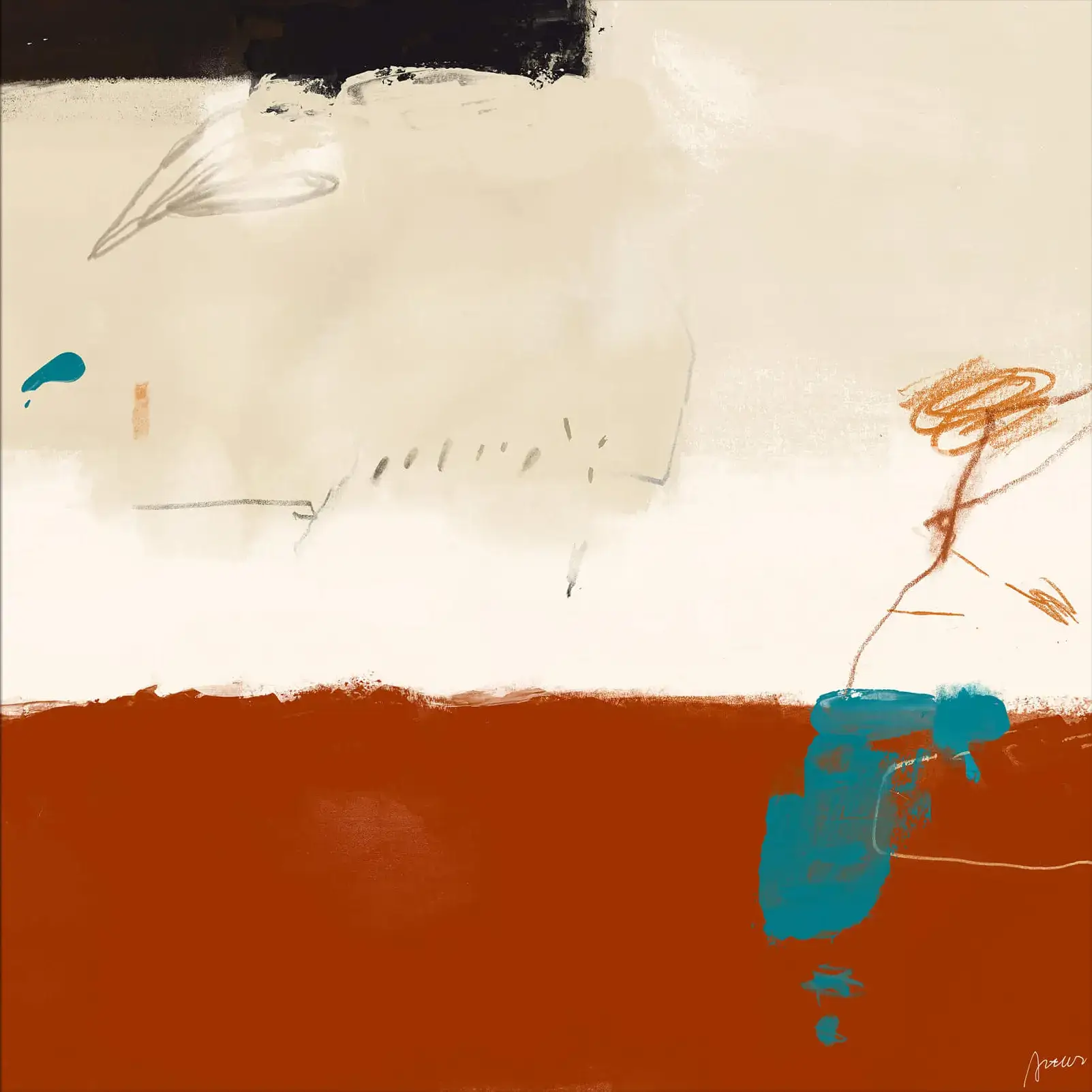 Another glance reveals a floating ivory cloud, a single turquoise drip and a spiraling line that might be a flower sketched by memory. Negative space remains generous, letting light breathe through the artwork and keeping the mood calm. The square layout allows the painting to sit harmoniously whether centered above a sofa or layered in a gallery grouping. Hints of black along the top edge echo the optional black Infinity Frame, making the print feel finished even before framing. From afar the rust reads earthy and warm, up close the teal accents read as tiny sparks, reminding you that stillness can be playful.