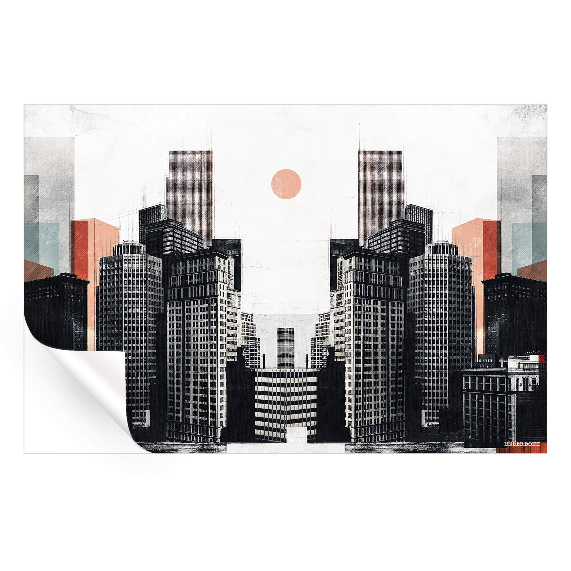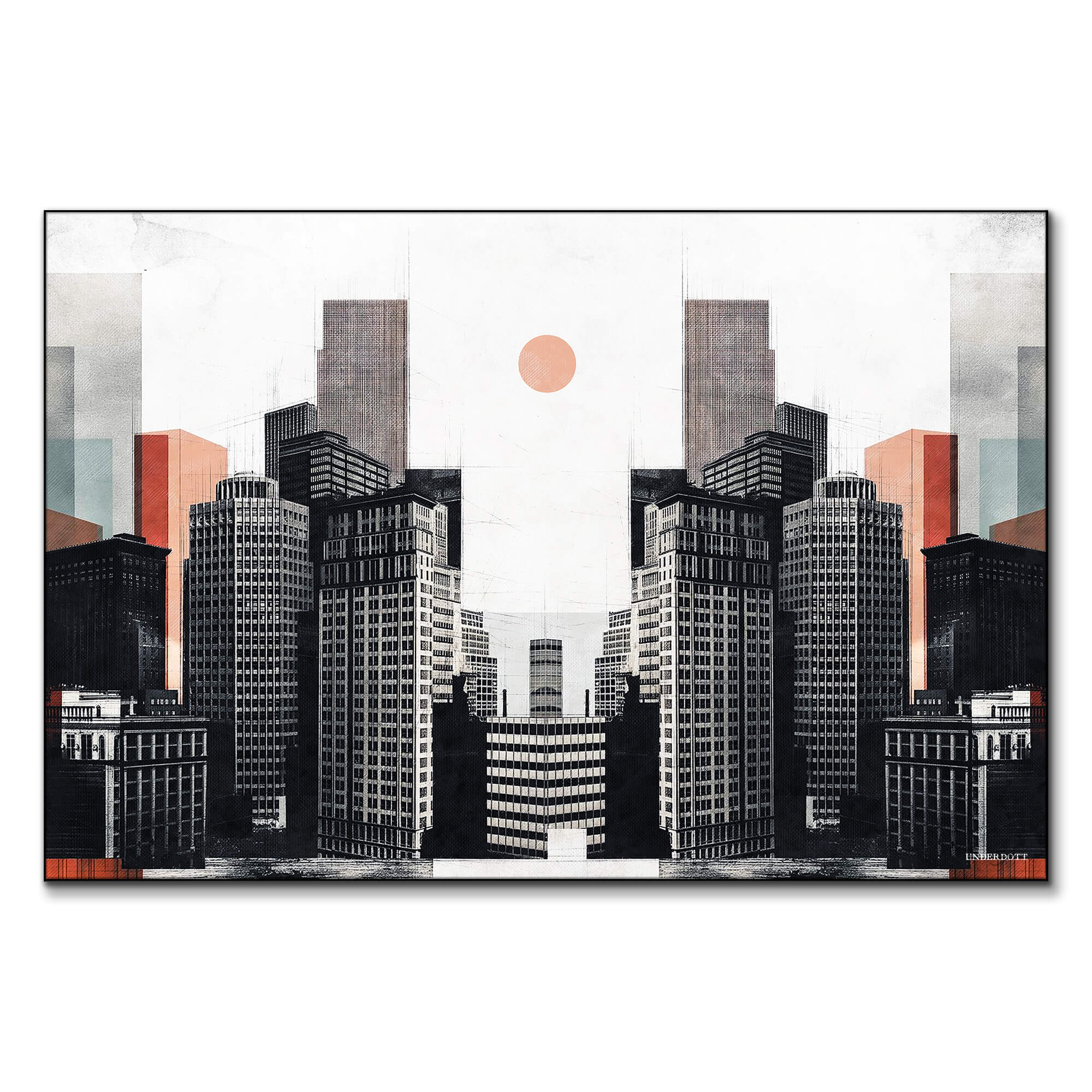 Symmetrical towers rise like twin guardians, their façades drawn in sharp black and white grids. Blocky pastel panels drift behind the skyline in muted coral, mint, and taupe, hinting at distant buildings fading into haze. A single apricot sun floats at the center of the pale sky, casting a calm glow over the concrete canyon. Each window and ledge is rendered with fine ink-like precision, yet the city appears to fold inward, creating a mirrored corridor that feels dreamlike.