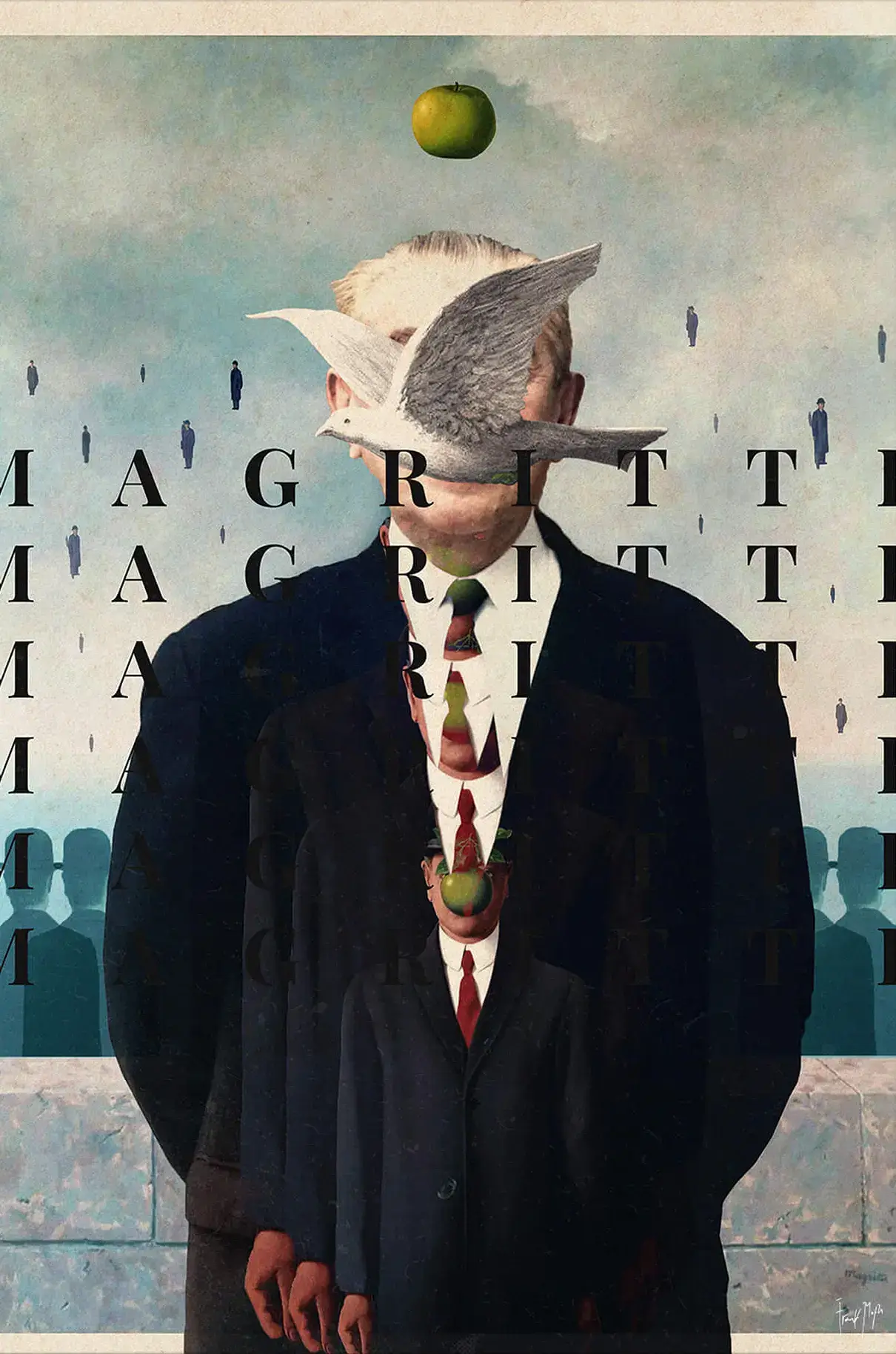 A surreal homage to the world of art, this piece reimagines a classic surrealist composition through layered repetition and bold typography. A suited figure stands beneath a floating apple and a hovering bird, surrounded by faint silhouettes and subtle visual echoes. The repeated name text forms a rhythmic pattern across the piece, giving it a modern pop-art energy.