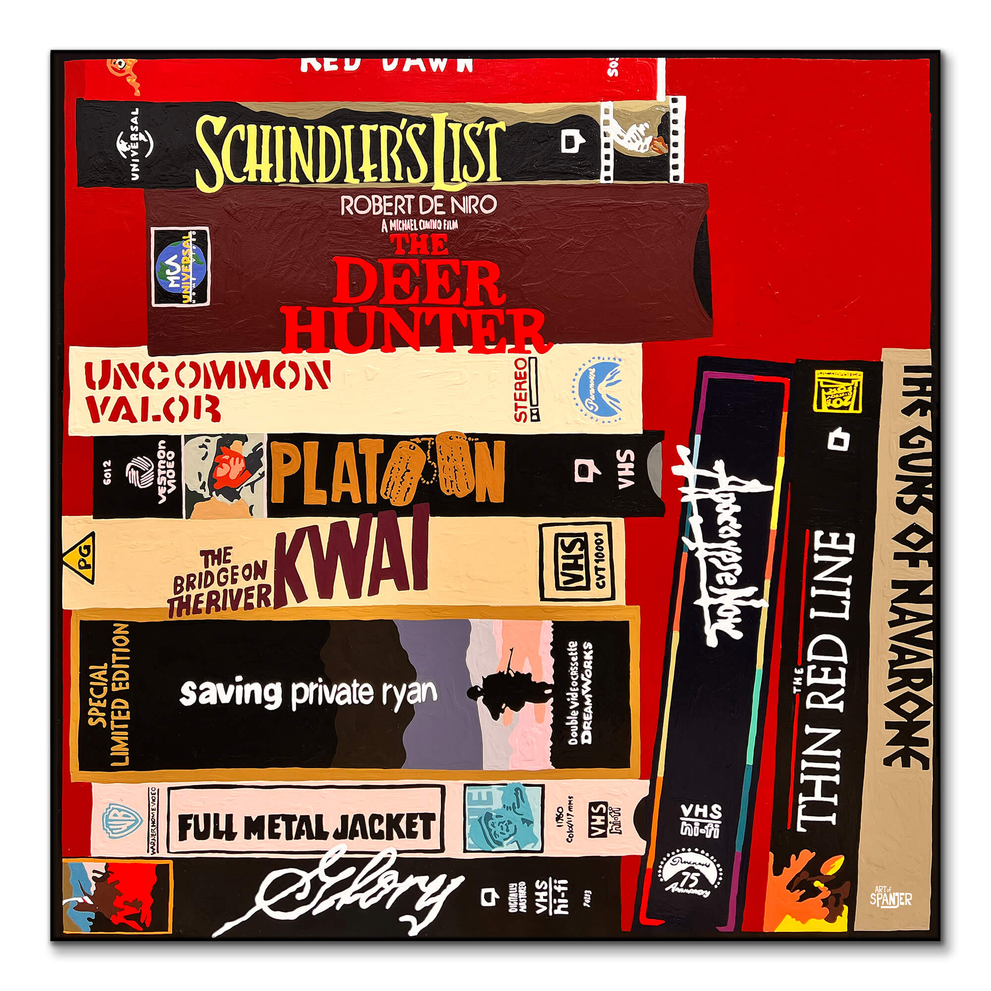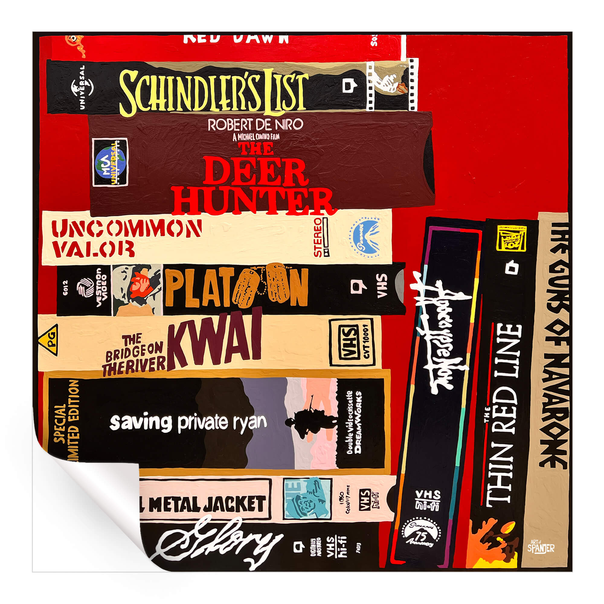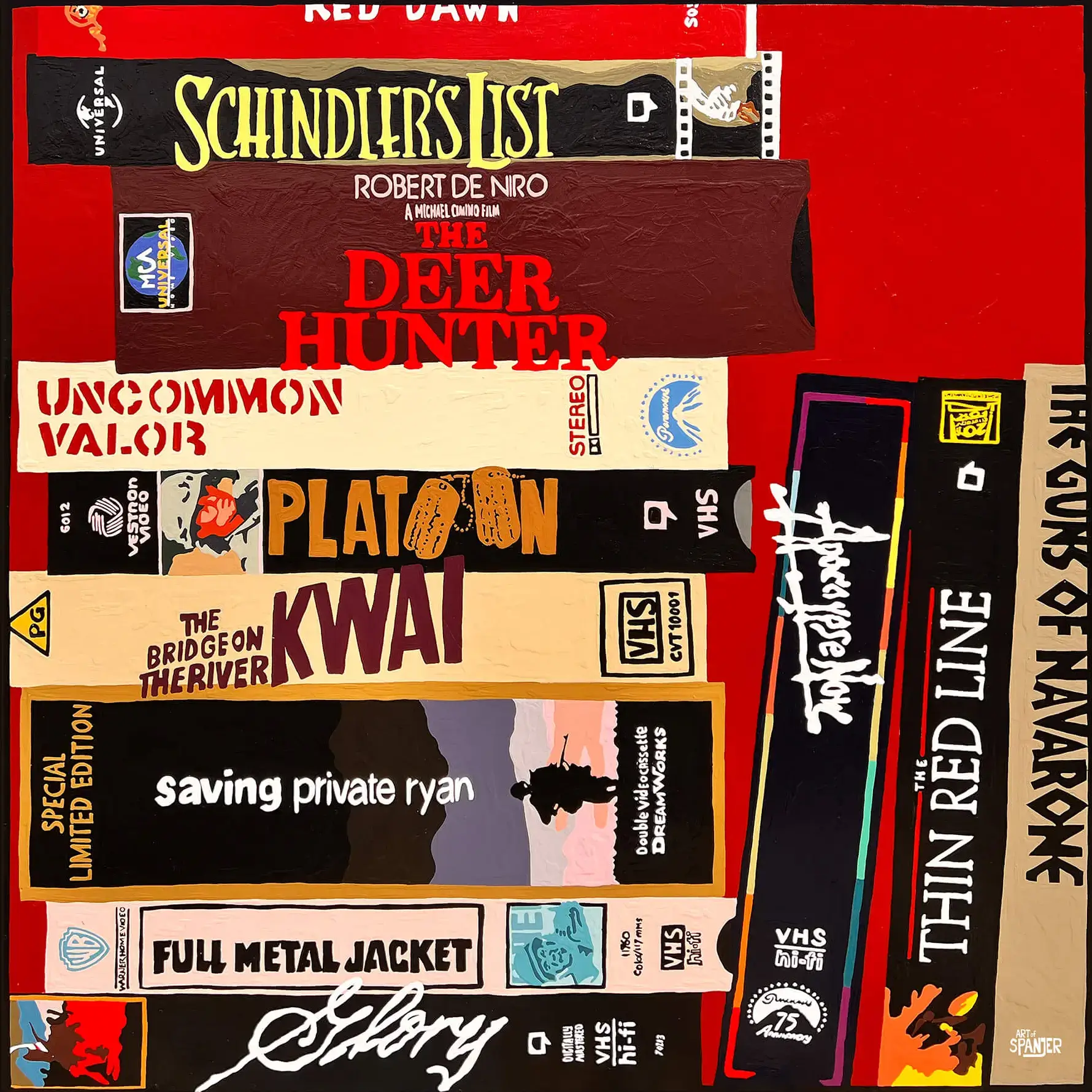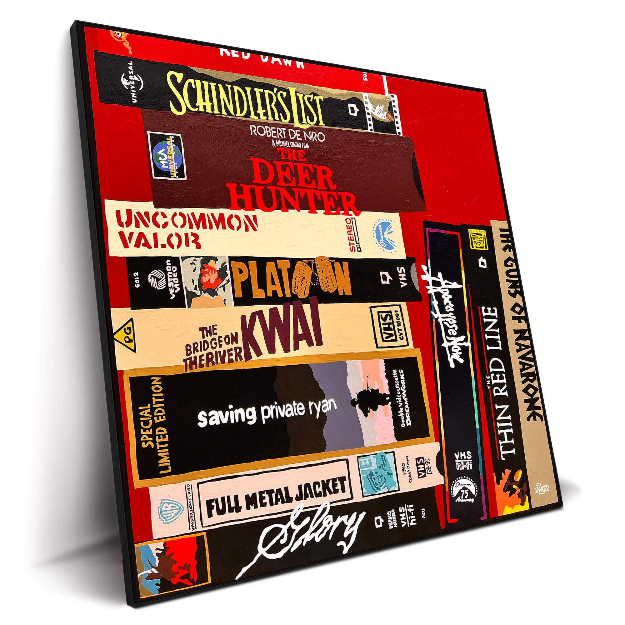 Relive the excitement of classic action films with this dynamic artwork showcasing a collection of iconic VHS covers. Featuring titles like “Schindler’s List,” “Platoon,” and “Saving Private Ryan,” this piece captures the essence of the action genre. Its bold colors and striking design make it a must-have for movie enthusiasts and collectors alike.
