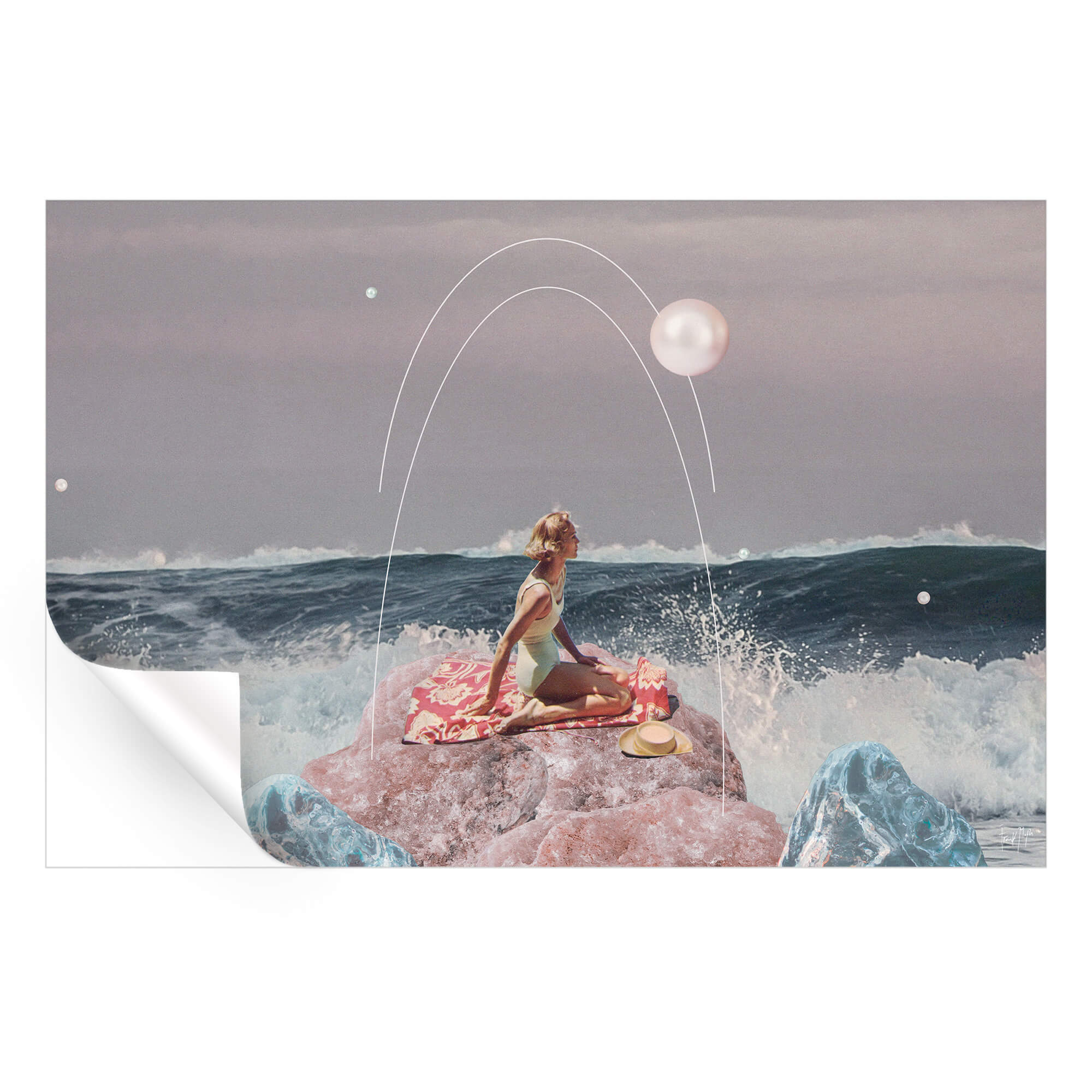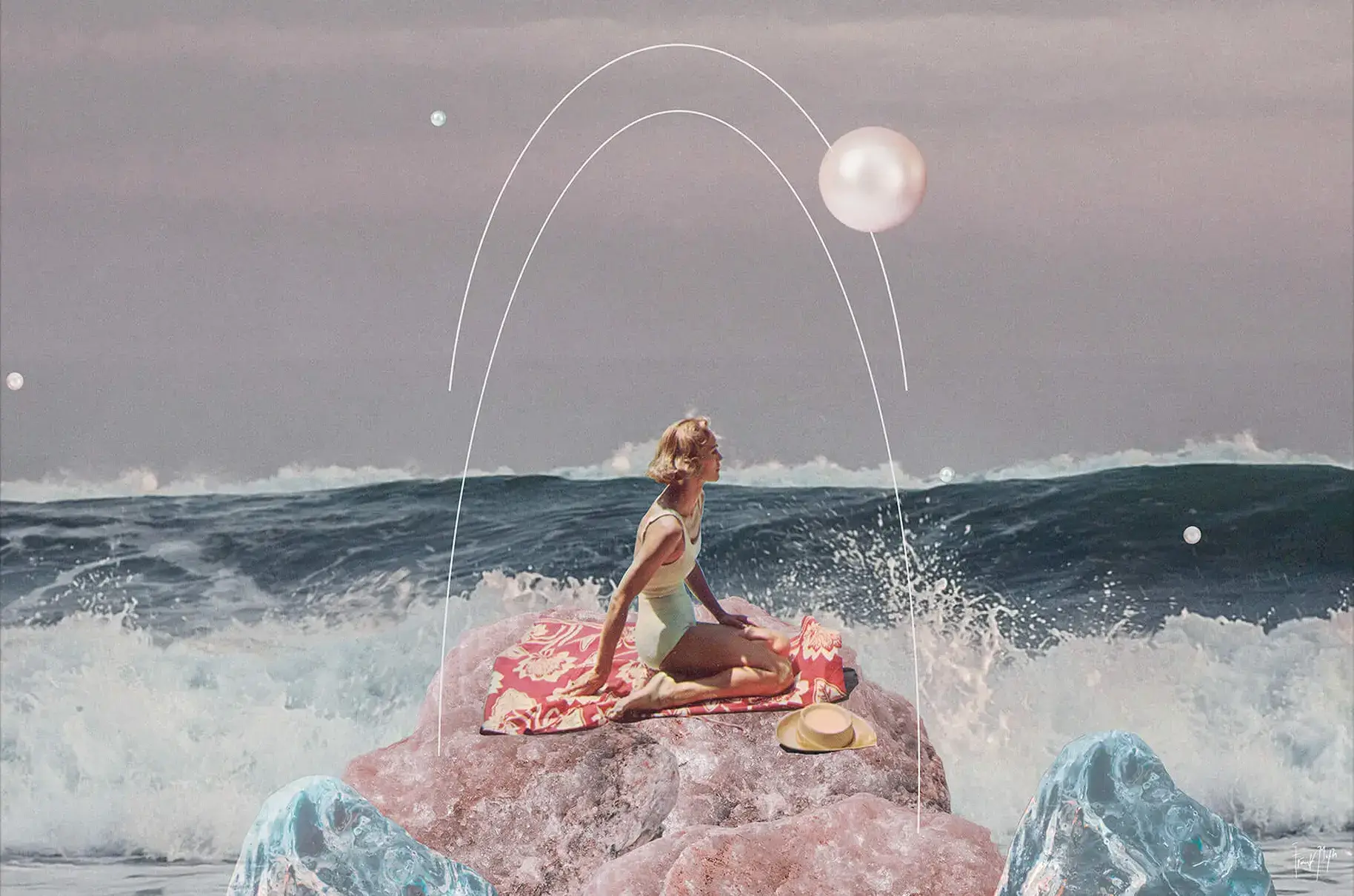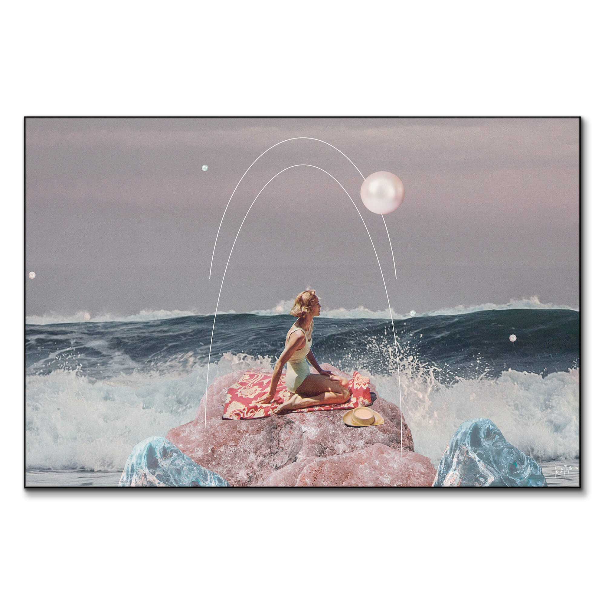 This piece turns a vintage beach scene into a surreal, modern dreamscape. A woman sits calmly atop a pink rock in the middle of crashing waves, framed by soft pastel skies and glowing spheres that arc above her. The composition feels both peaceful and otherworldly—balancing natural motion with dreamlike stillness.