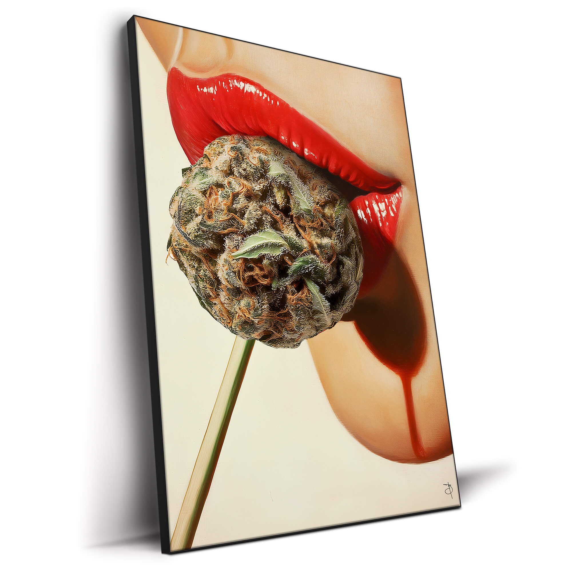 The bright, glossy finish of her lips contrasts with the earthy tones of the cannabis, giving the piece an alluring, edgy feel. The background features a smooth gradient of soft colors that enhance the retro aesthetic, drawing inspiration from mid-20th century pop art while incorporating a modern twist of cannabis culture.