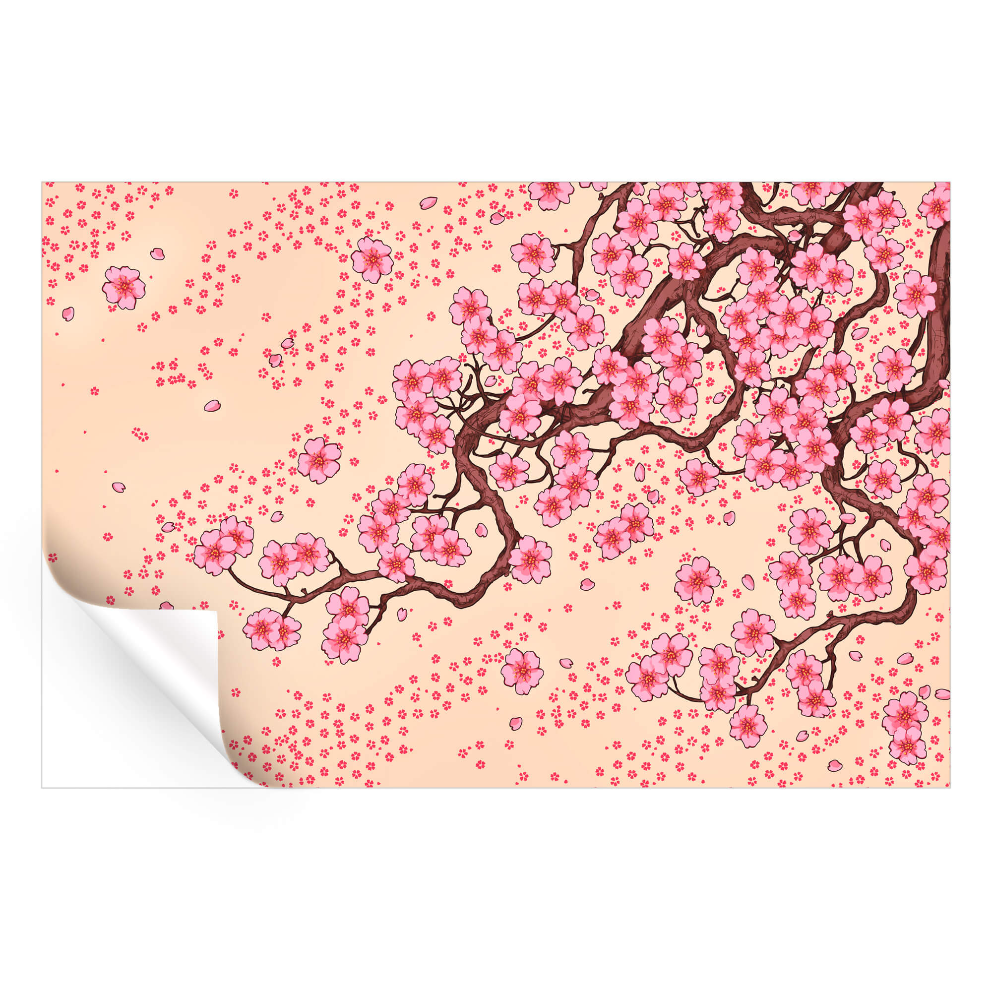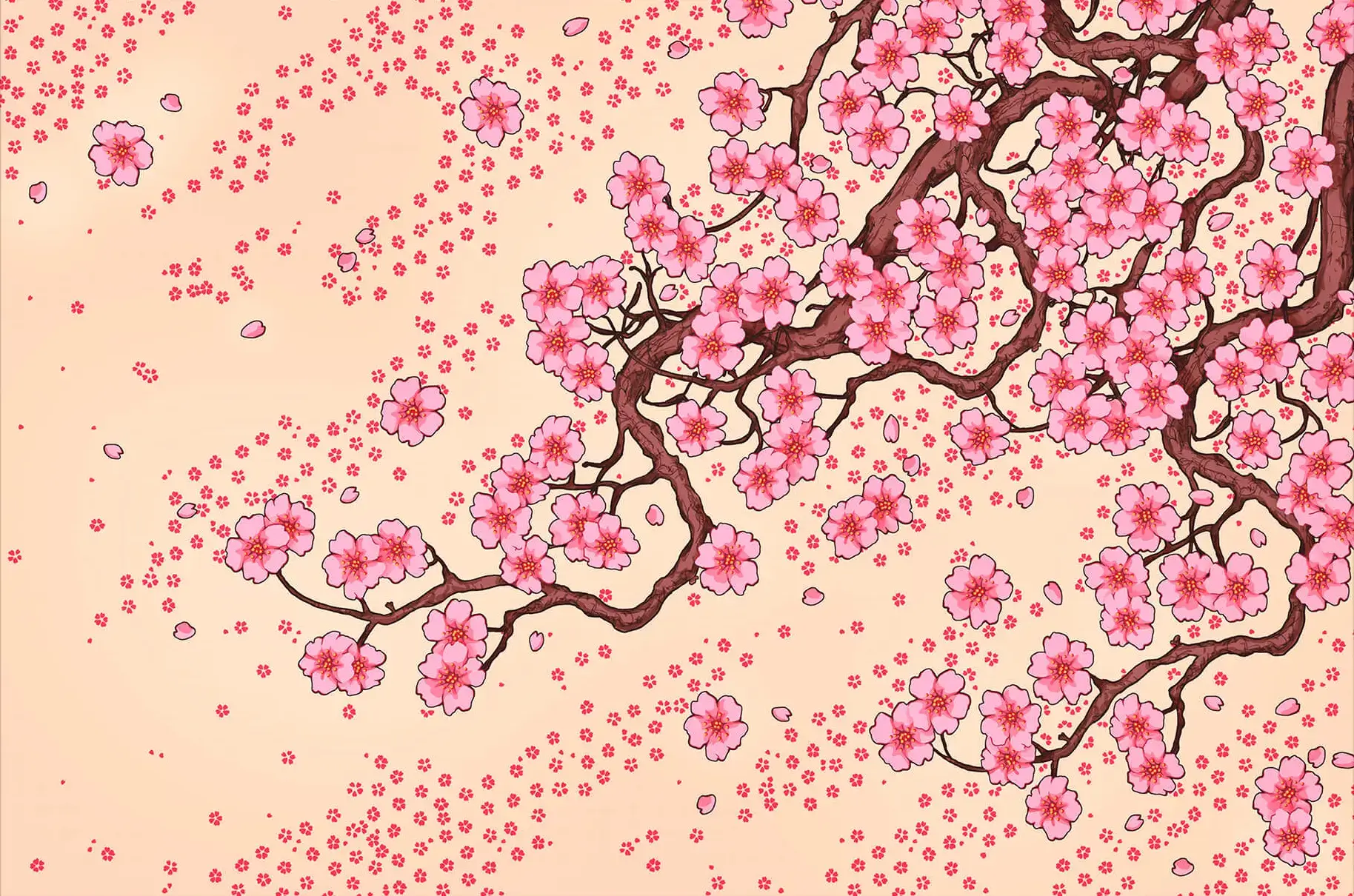 Blooming cherry blossom branches extend gracefully across the scene. Each blossom is intricately detailed, with some petals gently falling, adding a natural element to the composition. The background is a soft hue, providing a subtle contrast that highlights the vibrant pinks of the flowers and the dark brown of the branches.