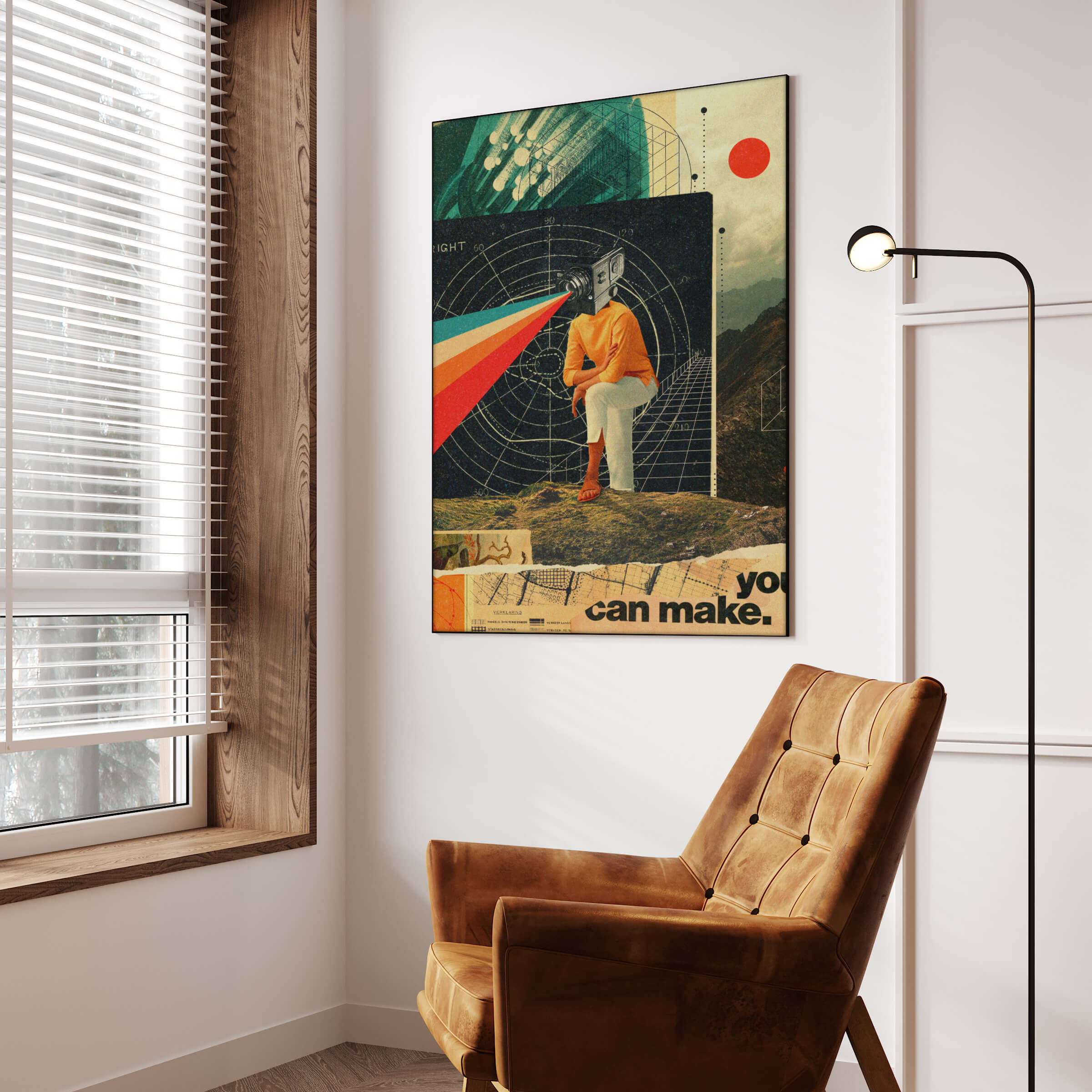 It feels like catching a moment of clarity, that instant where everything connects and you finally see it. The muted yellows, deep greens, and soft grain give it that nostalgic print look, almost like a forgotten textbook meets a surreal daydream. The visual mix of analog tech, nature, and quiet symbolism makes this piece super intriguing without trying too hard.