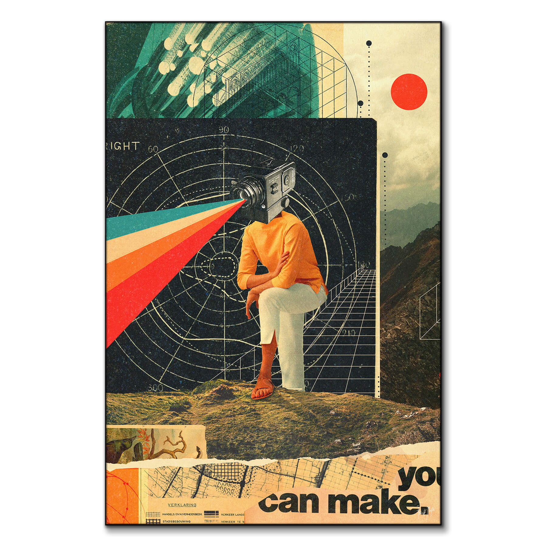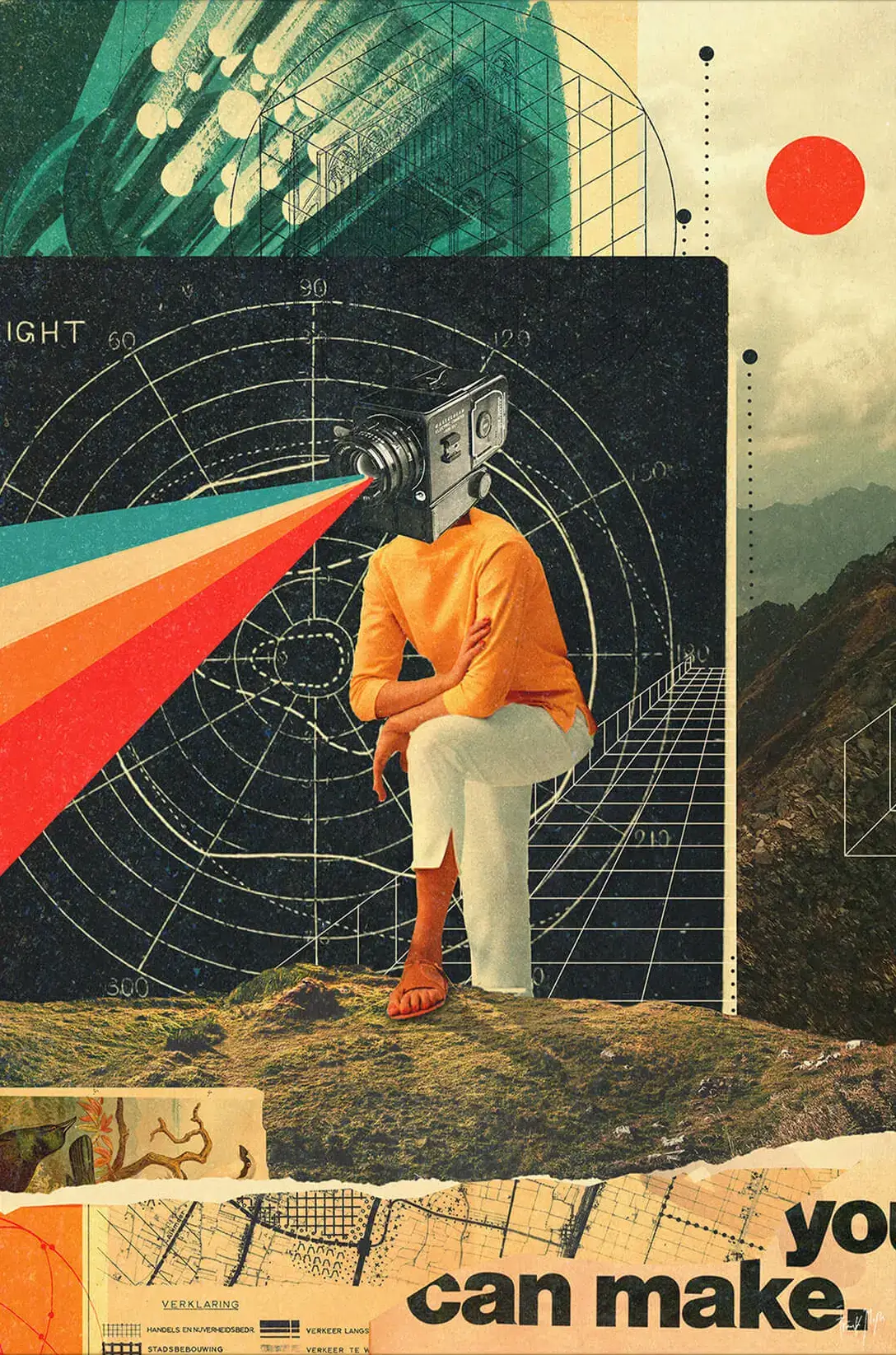 A figure sits calmly on a rocky hill, but instead of a head, there’s an old-school camera pointing forward, shooting out a bold rainbow beam like a thought made visible. The scene feels half-dream, half-retro science class, radar charts, vintage diagrams, and faded textures layer behind them like a peek inside someone’s mind. Earthy mountains and warm sunlight ground the scene, while the bright beam cuts through it with futuristic energy.