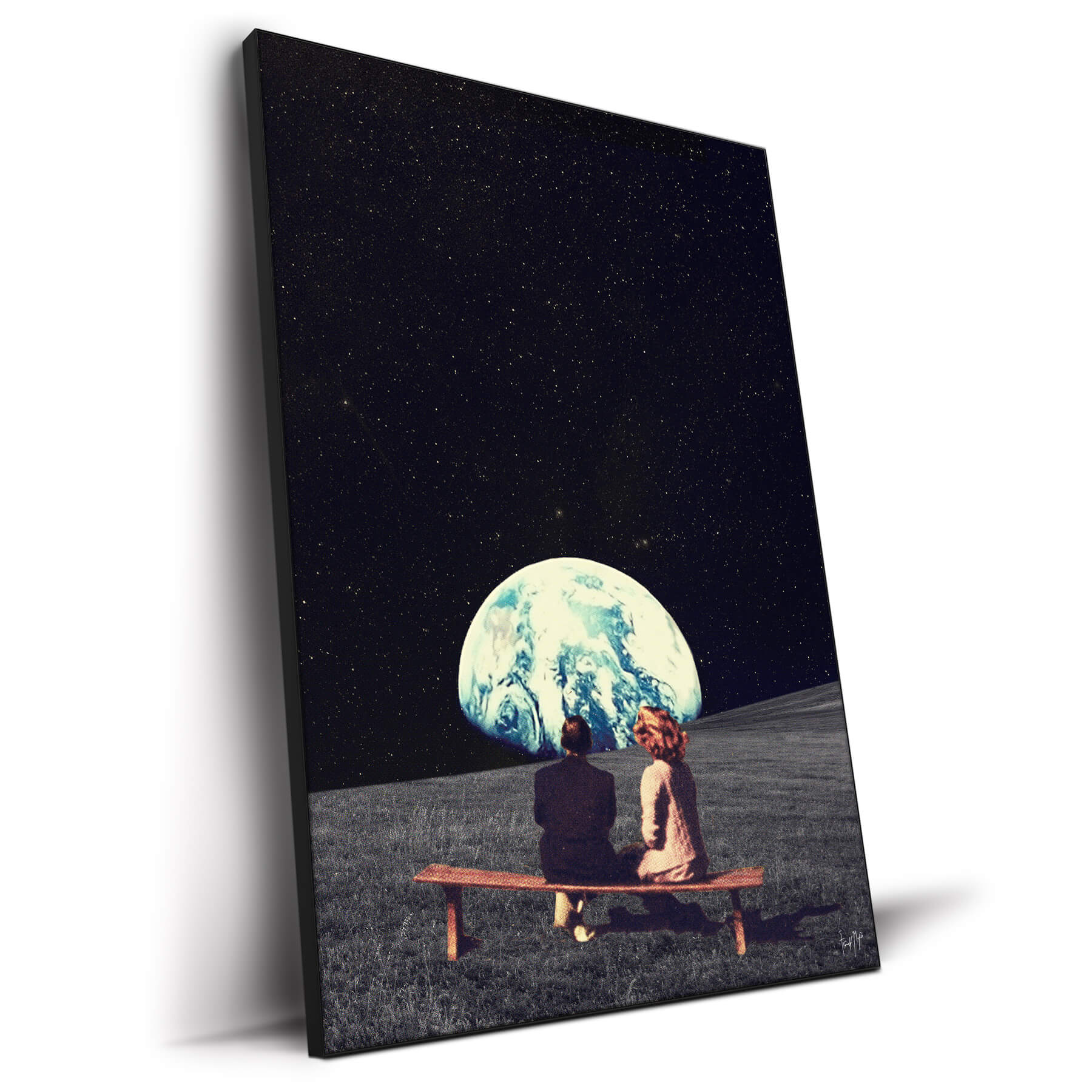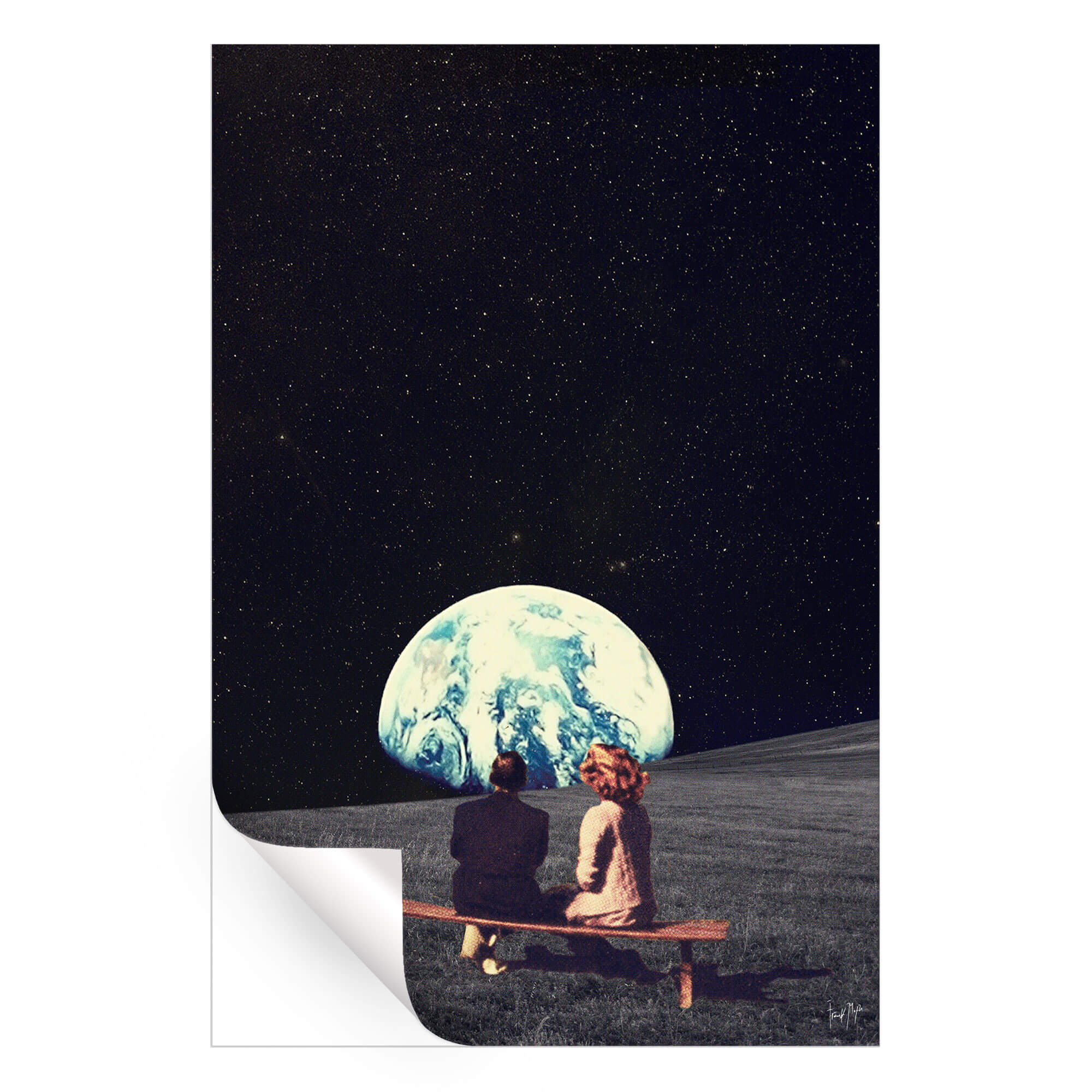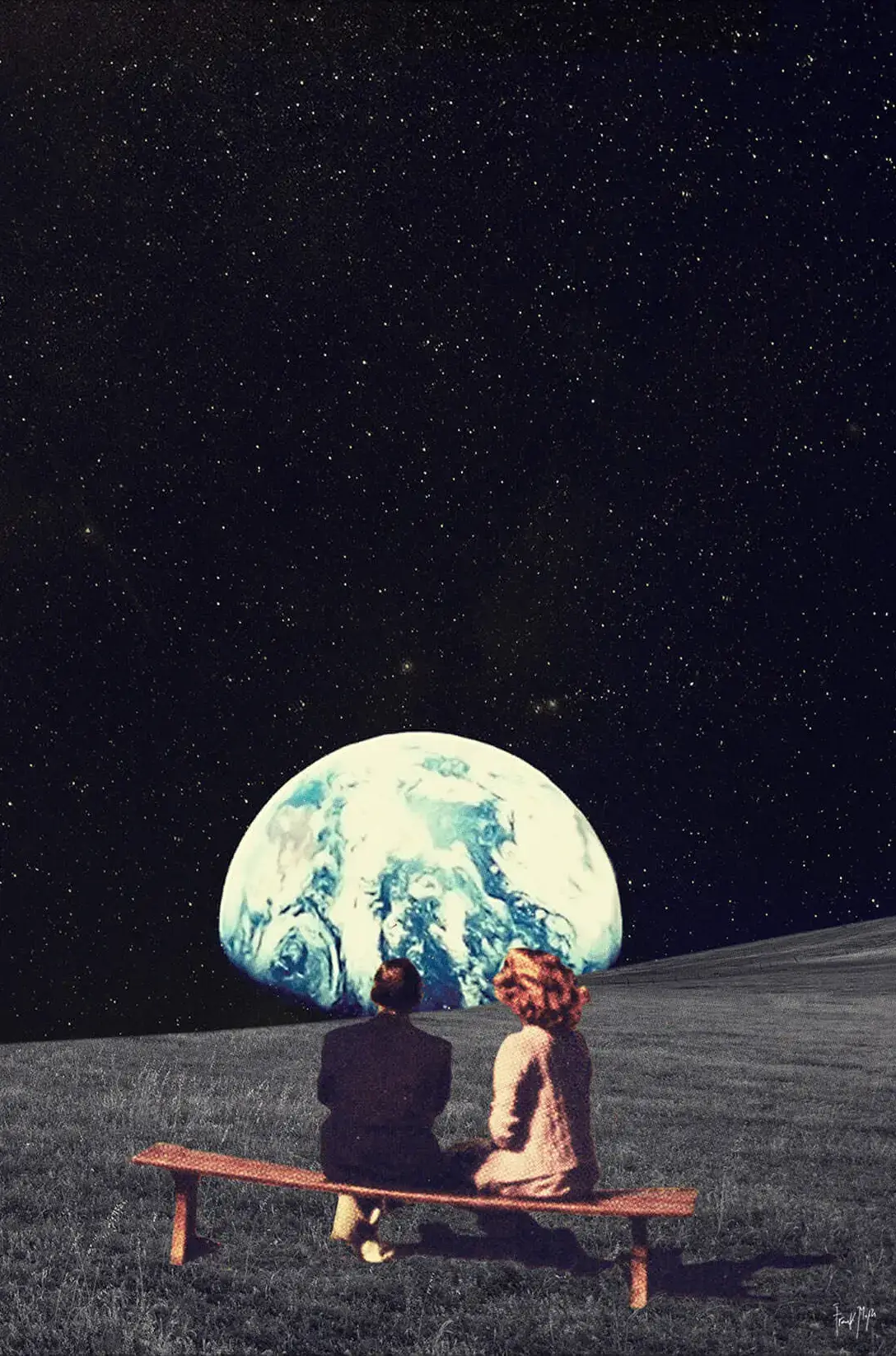 This dreamy collage depicts a quiet moment of connection against the vastness of space. Two figures sit together on a bench, gazing out at Earth glowing softly in the distance. The dark sky, filled with stars, contrasts beautifully with the pale blue planet below, creating a scene that feels cinematic yet intimate.