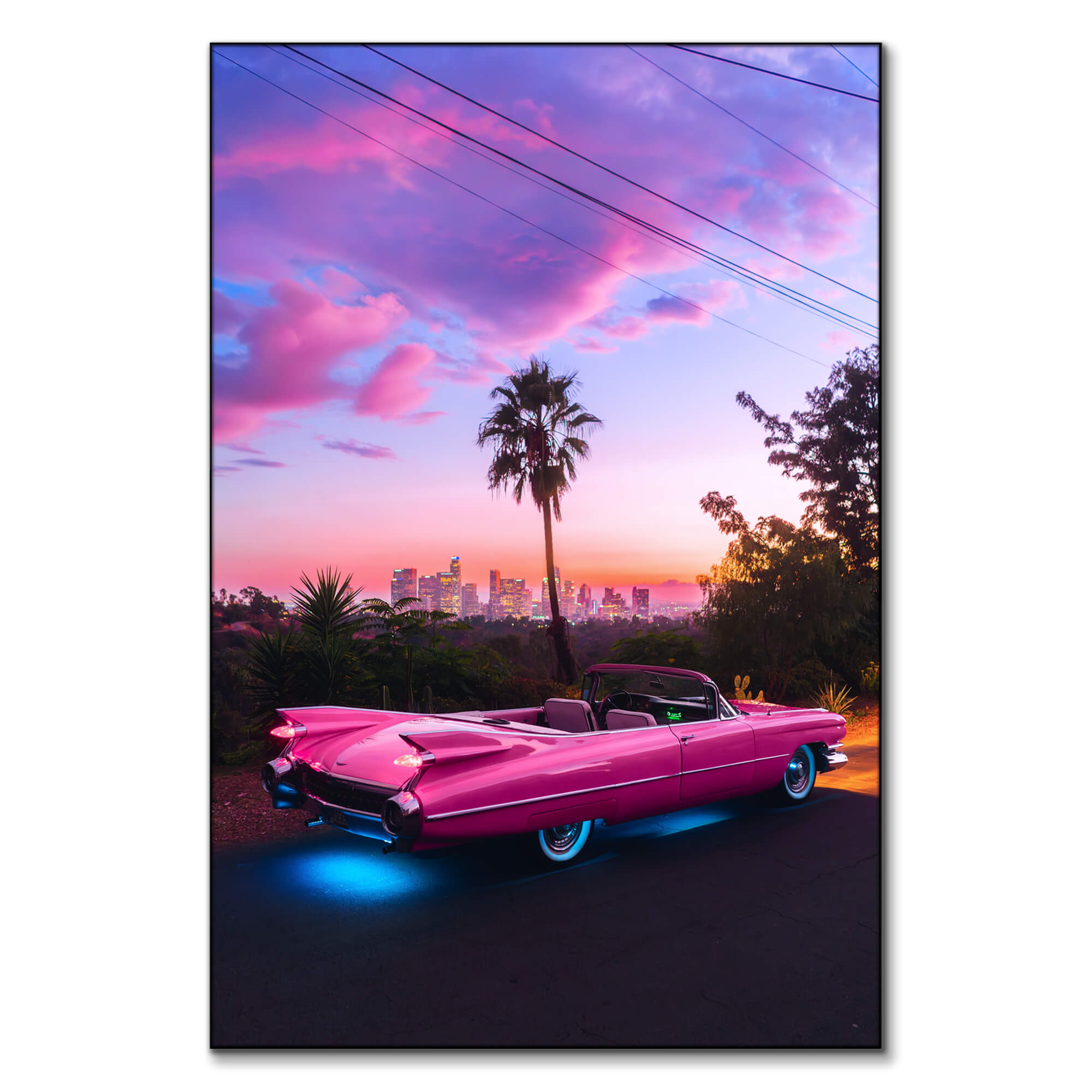 Parked on a hill that overlooks the city, a retro pink Cadillac Series 62 stands out against the twilight sky. Its classic lines and tailfins are a nod to a time when cars were as much about style as they were about getting from here to there.