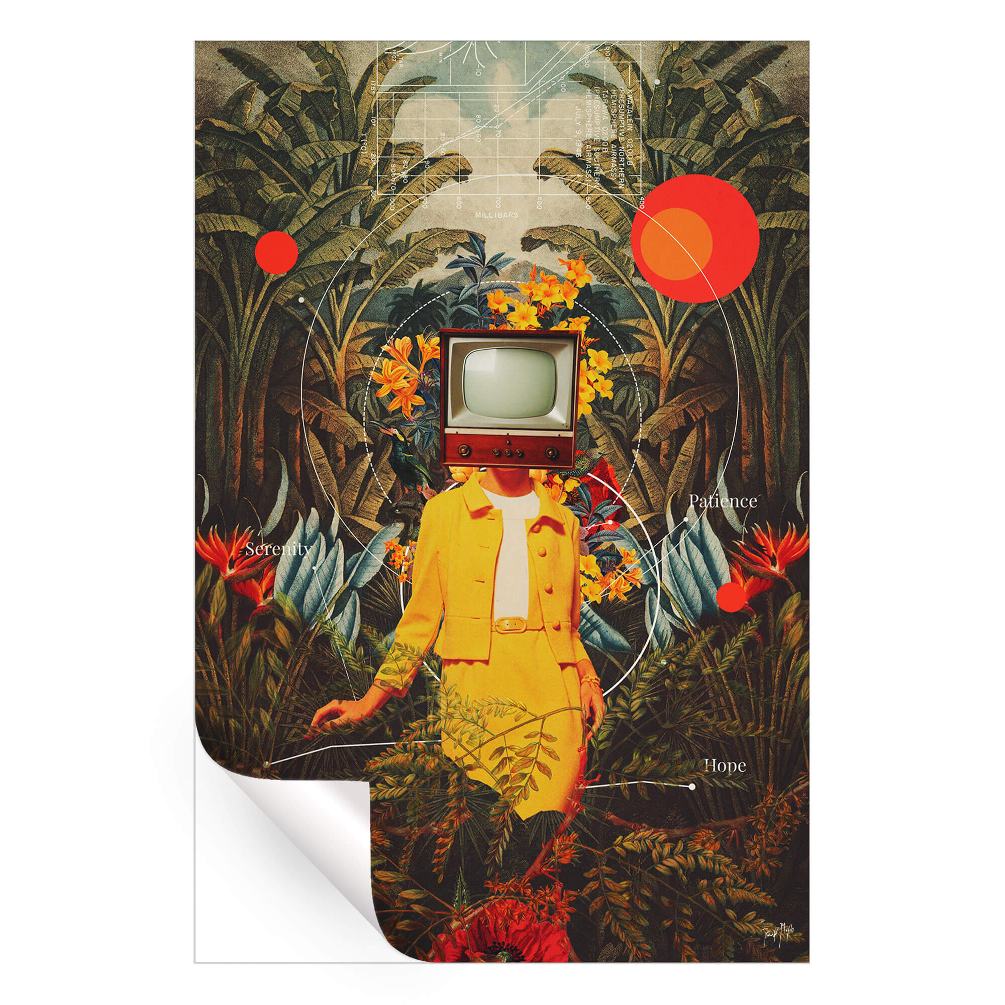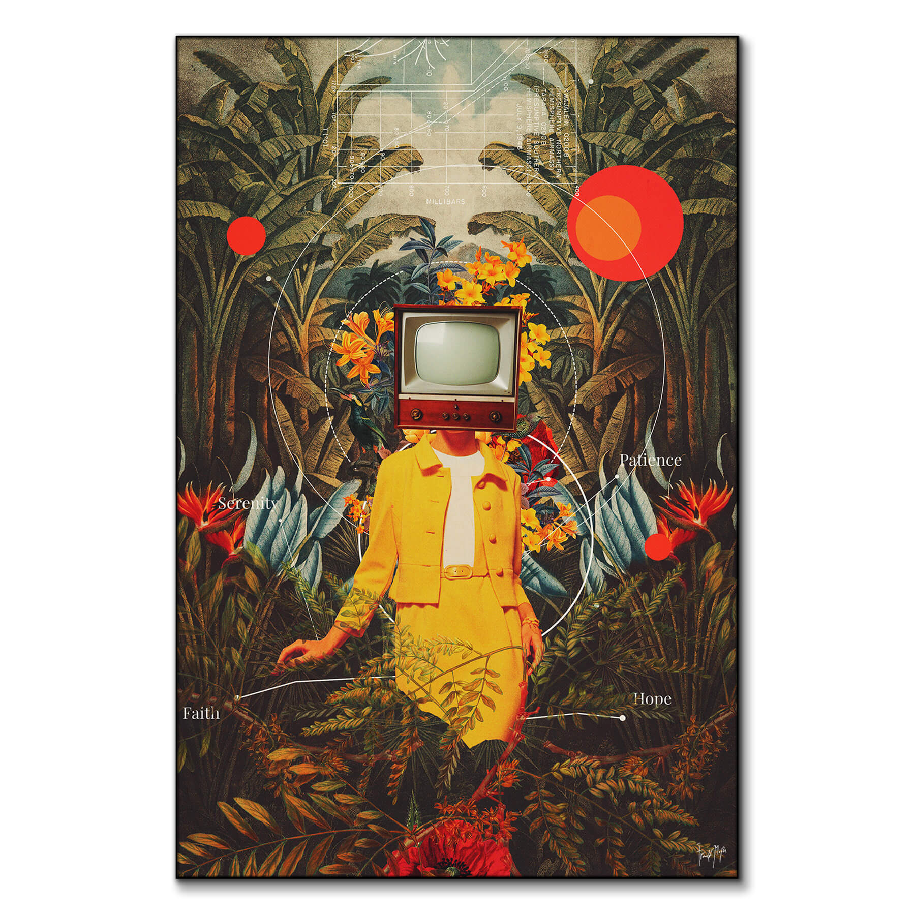 A woman stands in a lush jungle scene, dressed in a bold yellow skirt suit that pops against deep green tropical foliage. Her head is replaced by a vintage television, giving the piece a surreal, retro-meets-future feel. Bright flowers, layered leaves, and hints of botanical drawings surround her, while thin white lines arc across the scene like quiet energy paths or orbit patterns. Scattered around her are the words Serenity, Patience, Faith, and Hope, appearing almost like guiding thoughts floating through the air.