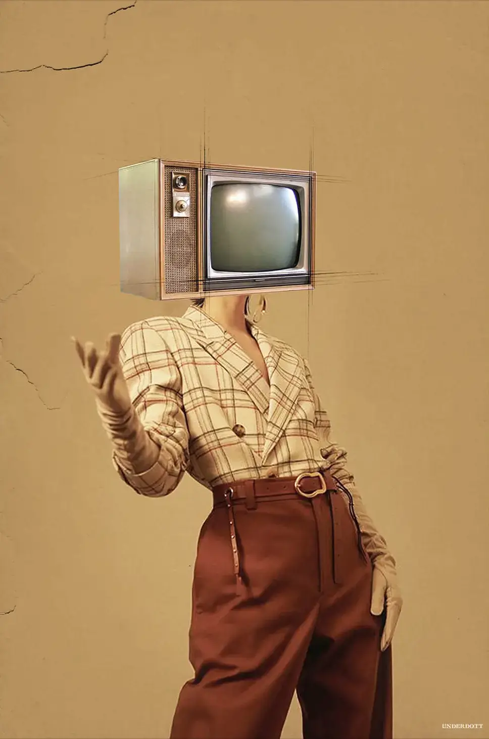 Surreal and conceptual, a person stands dramatically with a vintage television set for a head. The body is dressed in a plaid, fitted blazer and high-waisted trousers in a sepia-toned palette, evoking a retro aesthetic. A fine texture is veiled over the entire piece, adding texture.