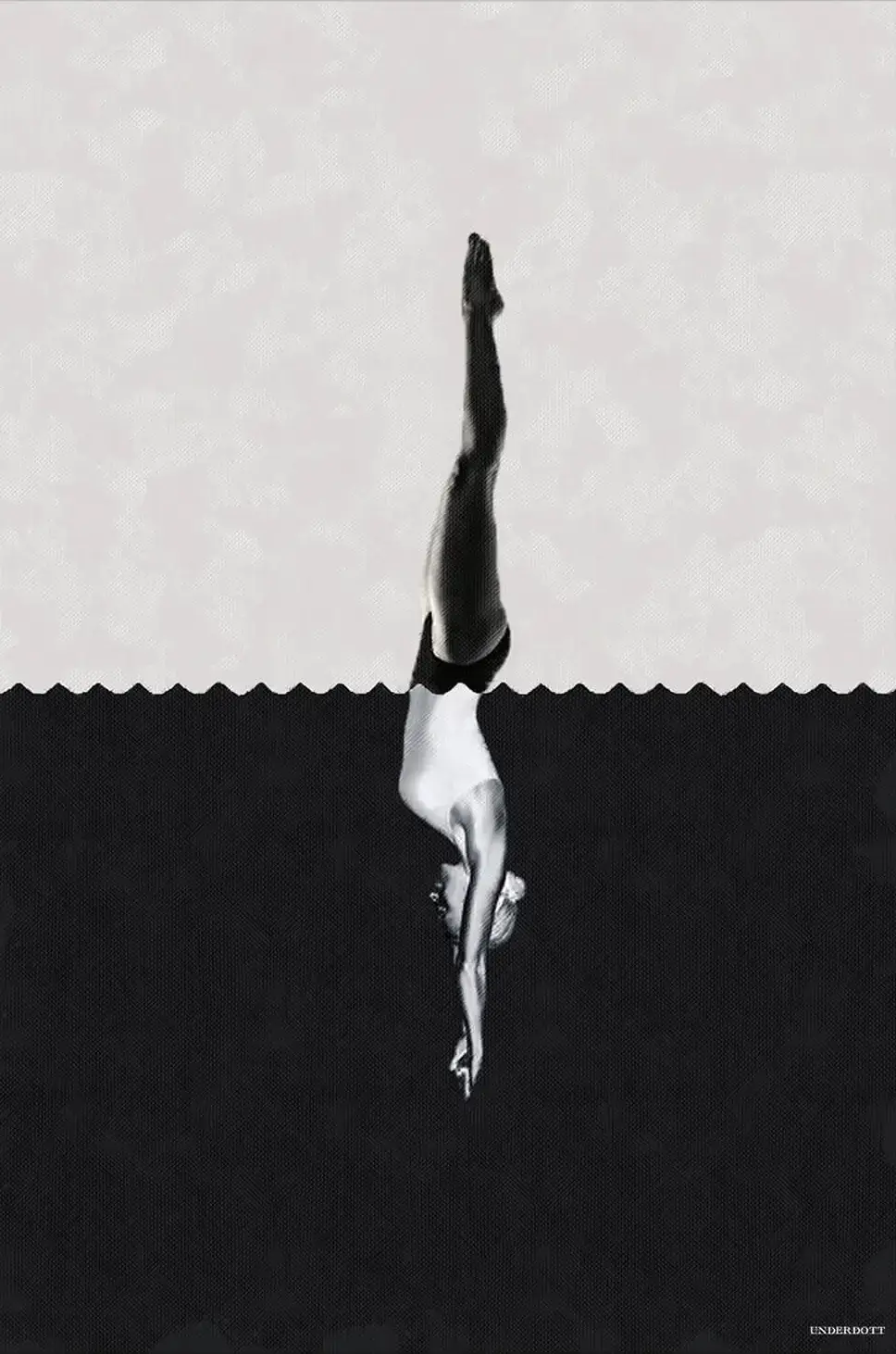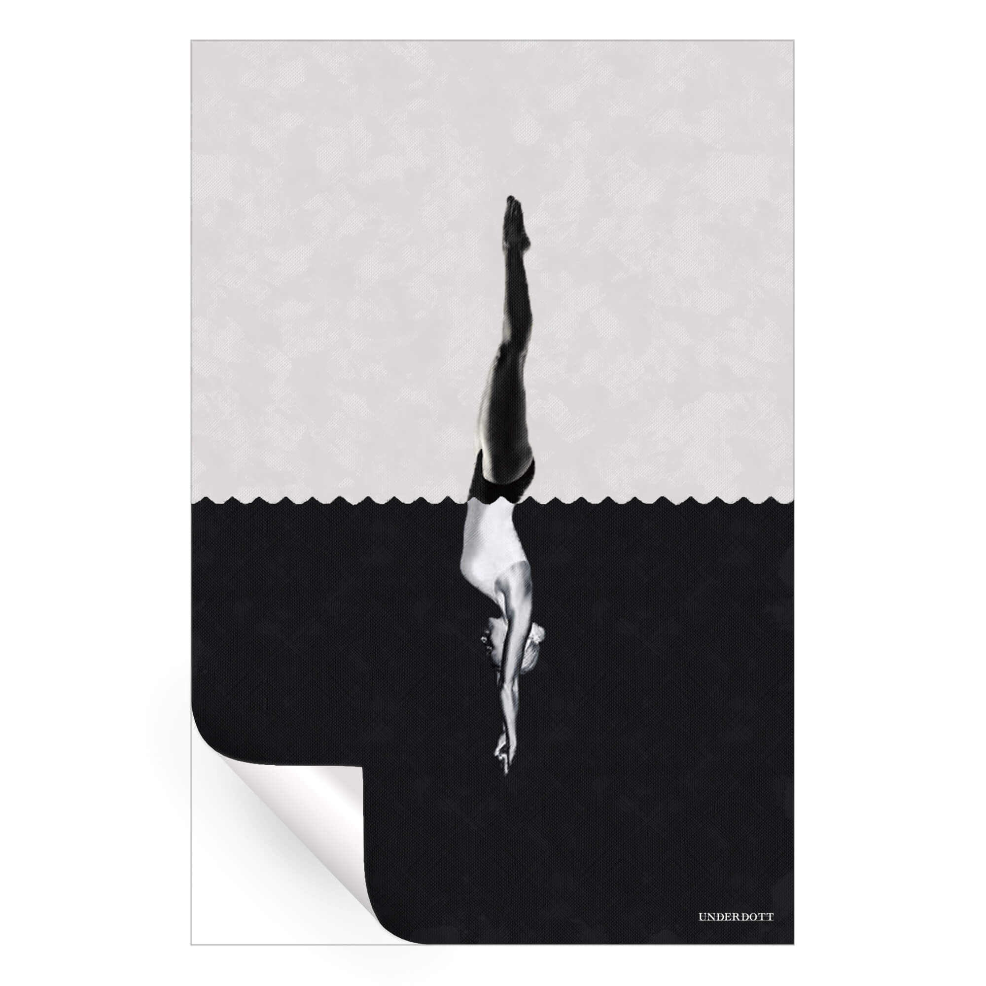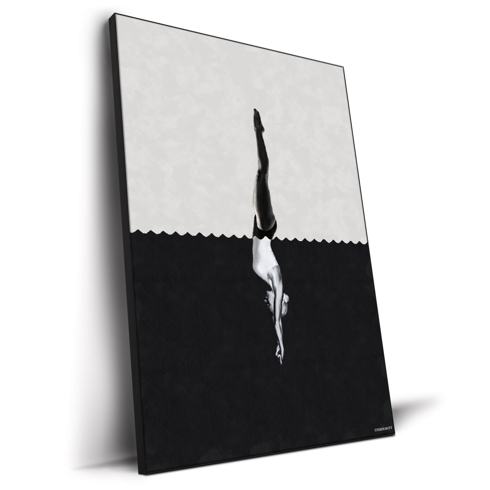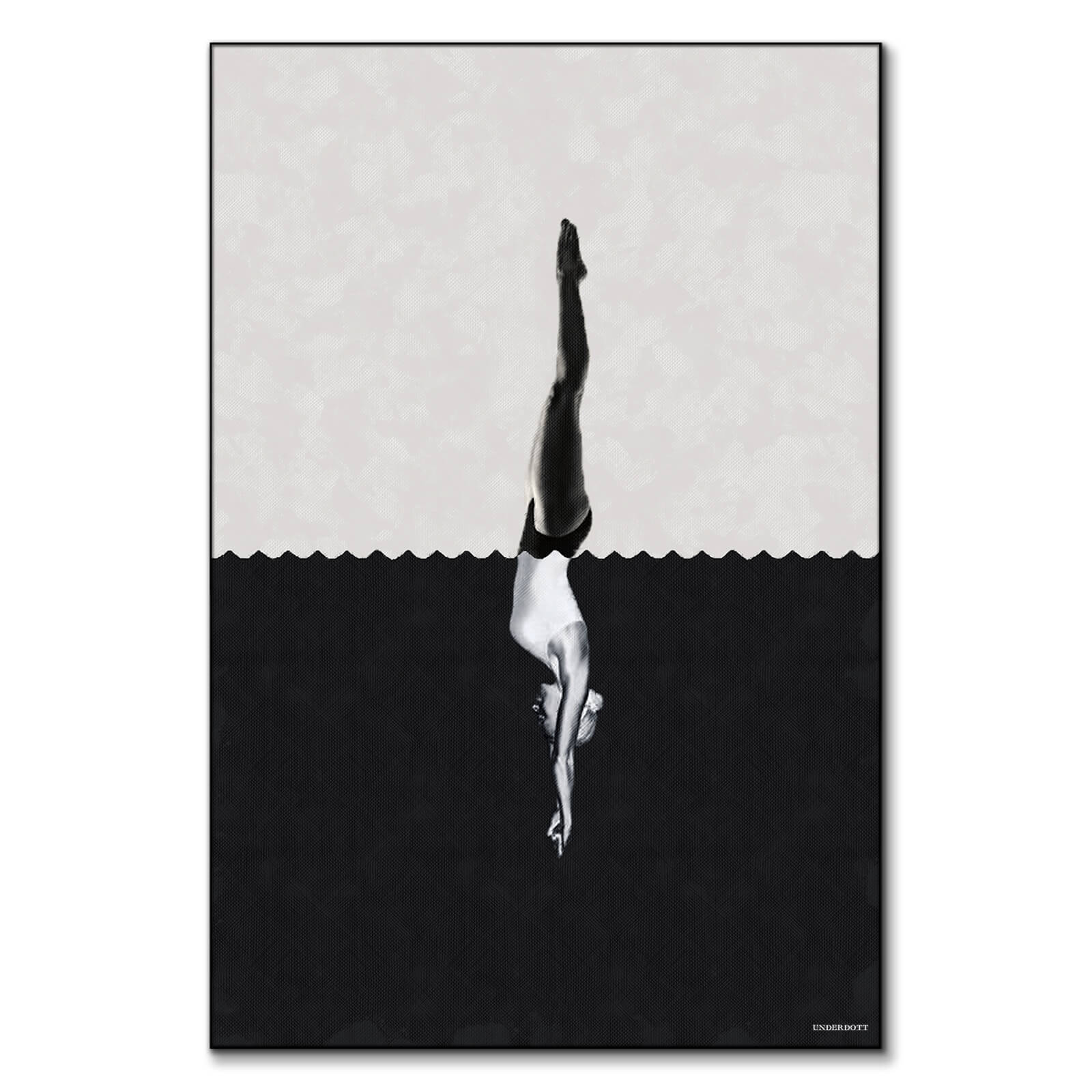 Plunge into the captivating world of black and white art with “Dive Deep” by Underdott. This piece elegantly balances minimalism and surrealism, portraying a female figure in an inverted dive, creating a sense of symmetry and tranquility. The contrast between the gray tones and the black-and-white design forms a visually striking image. This unique vertical artwork fits seamlessly in both bathroom wall art and office wall art settings, offering a calming yet rebellious ambiance.