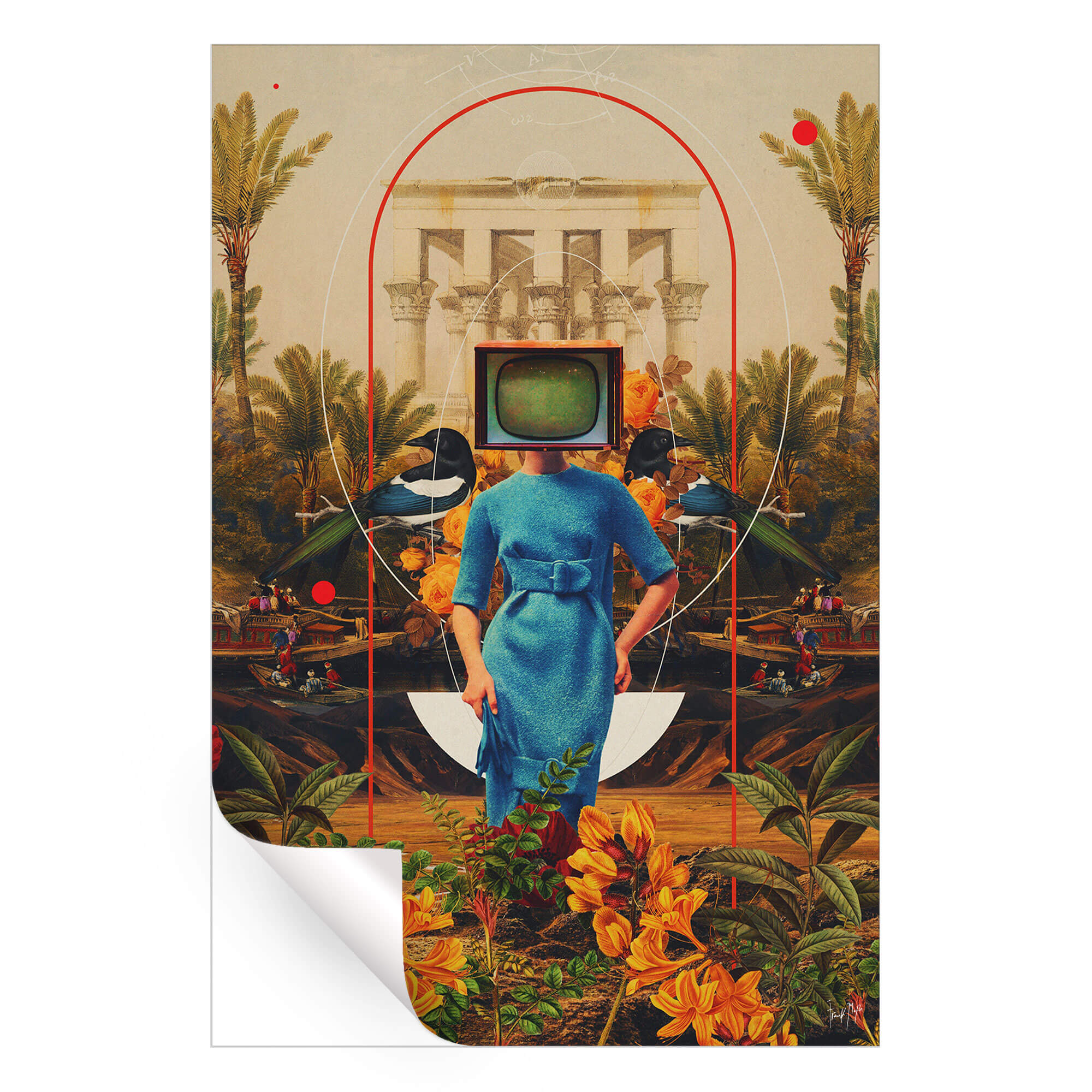 This imaginative collage blends mid-century elegance with surreal symbolism. A woman in a bright blue dress stands confidently amidst a dreamlike garden, her head replaced by a vintage television screen. Behind her, lush foliage, tropical birds, and classical architecture merge into a whimsical world that feels both nostalgic and futuristic.