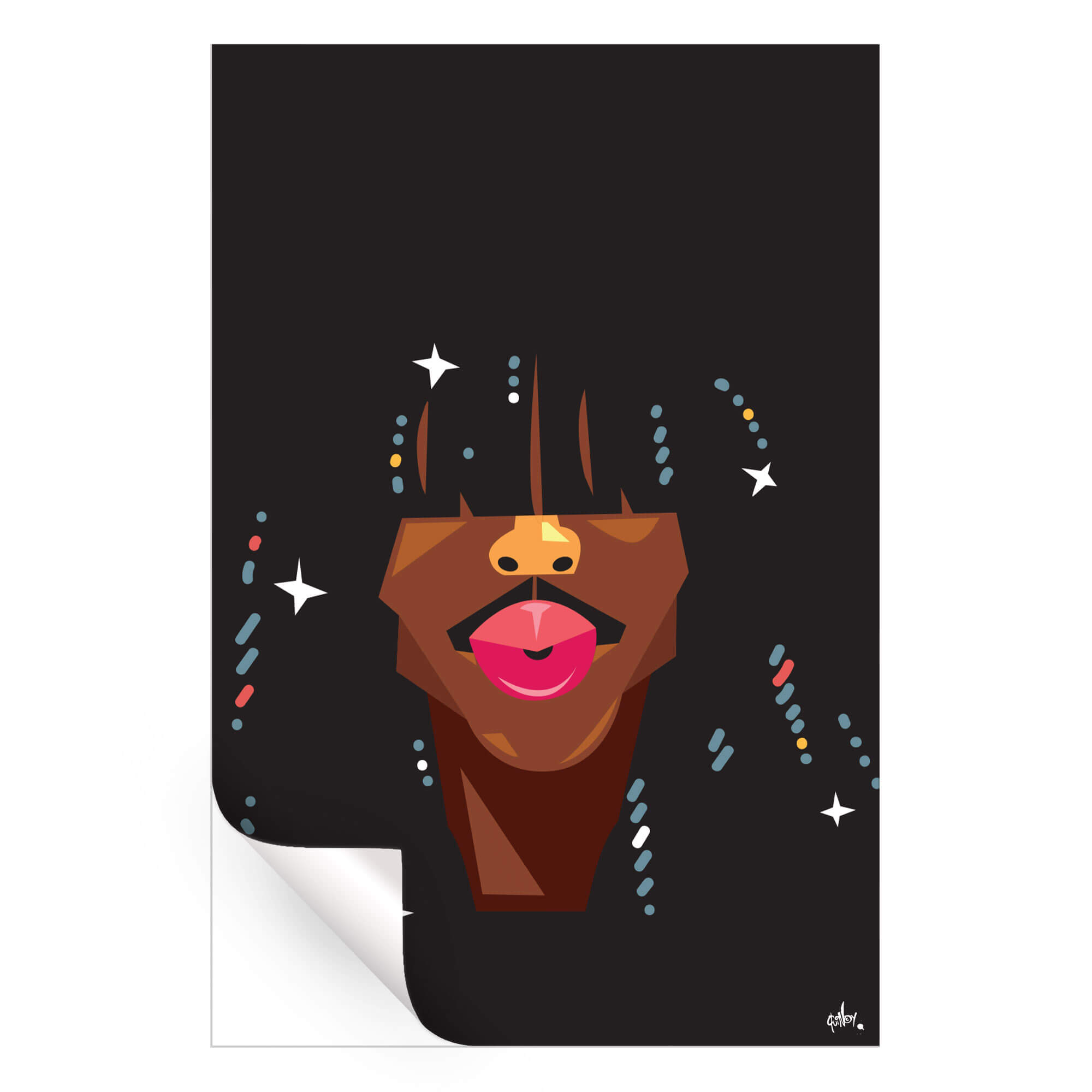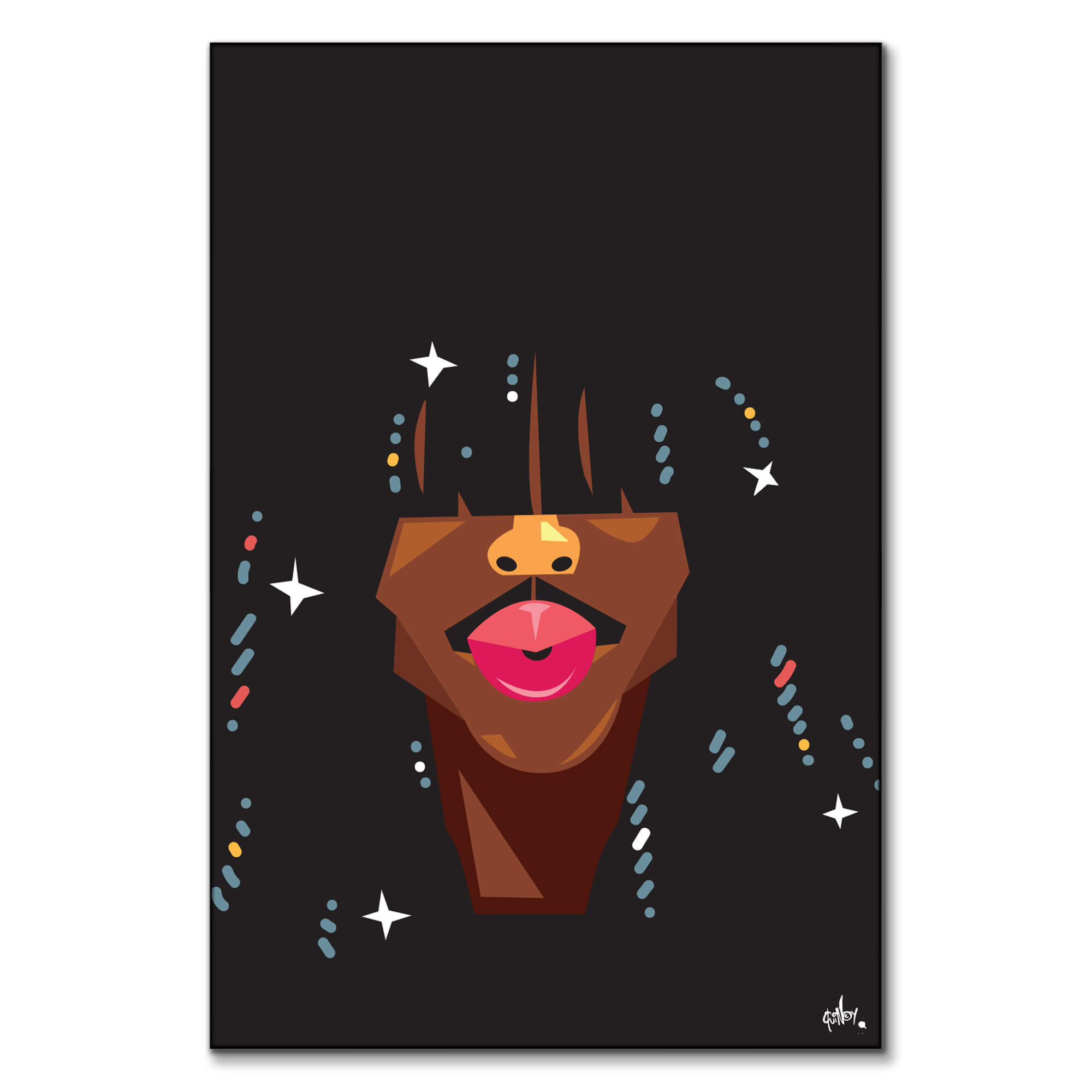 Rick James is set against a dark background, adorned with colorful, sparkling accents that give the impression of a lively, energetic atmosphere. The art style is marked by geometric shapes and a playful use of color, particularly in the depiction of the figure’s bright pink lips and the light reflections that suggest a sense of movement and festivity.