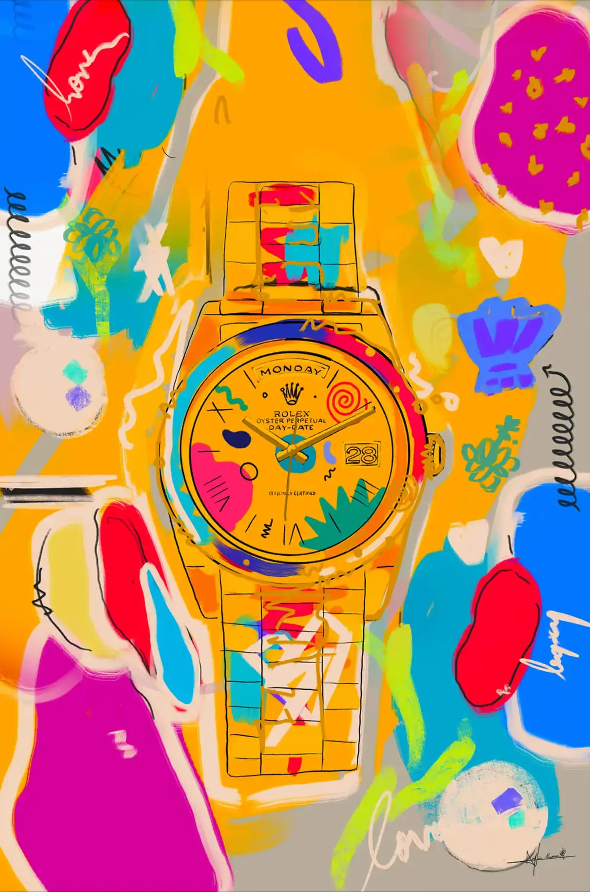 This digital painting showcases a Rolex watch, its face a kaleidoscope of colors set against a radiant background adorned with abstract doodles and everyday imagery. The watch’s intricate details are highlighted in this sea of bold, playful elements, emphasizing the fusion of time-honored luxury with contemporary art.