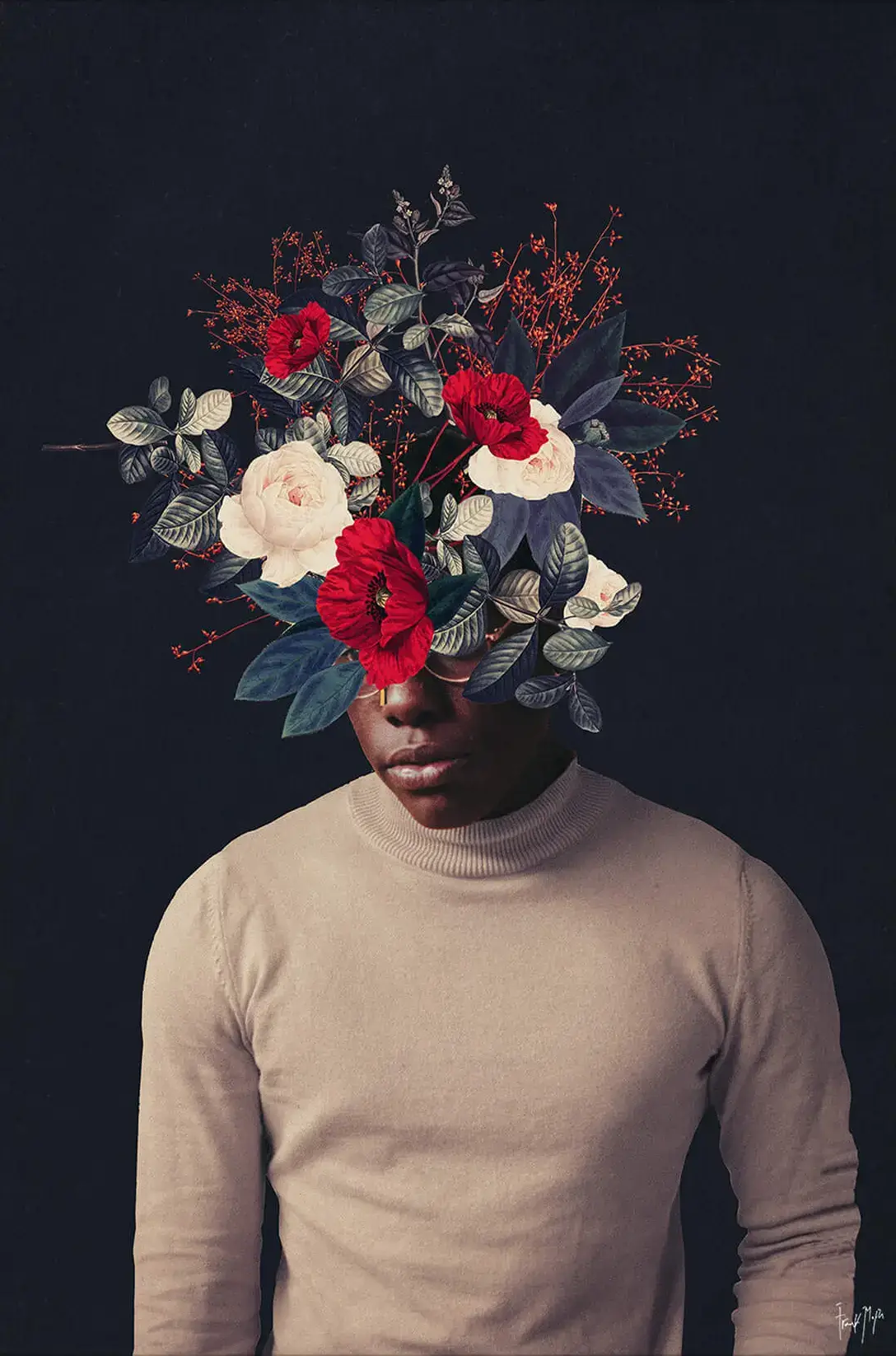 At once blood red poppies and pale roses pop out of the black background and … seemingly the man’s face. The florals instantly strike the aesthetic sense, contrasting beautifully with the black background and blending with the lower half of the face. As the plain beige of the turtleneck perfectly balances out the dark background, it makes the foliage centerpiece stand out even more.