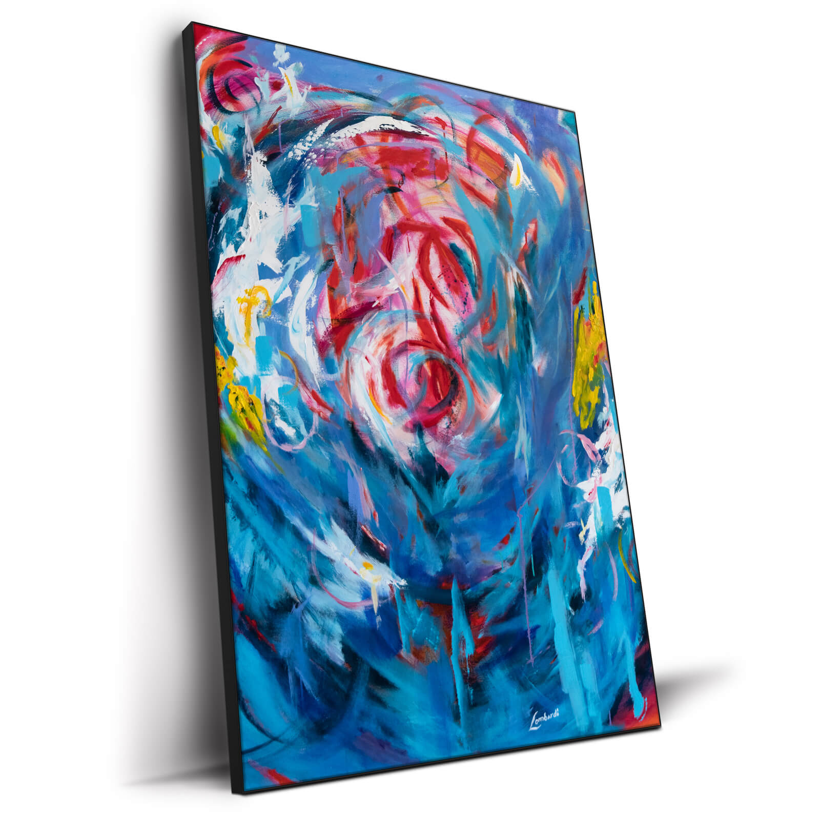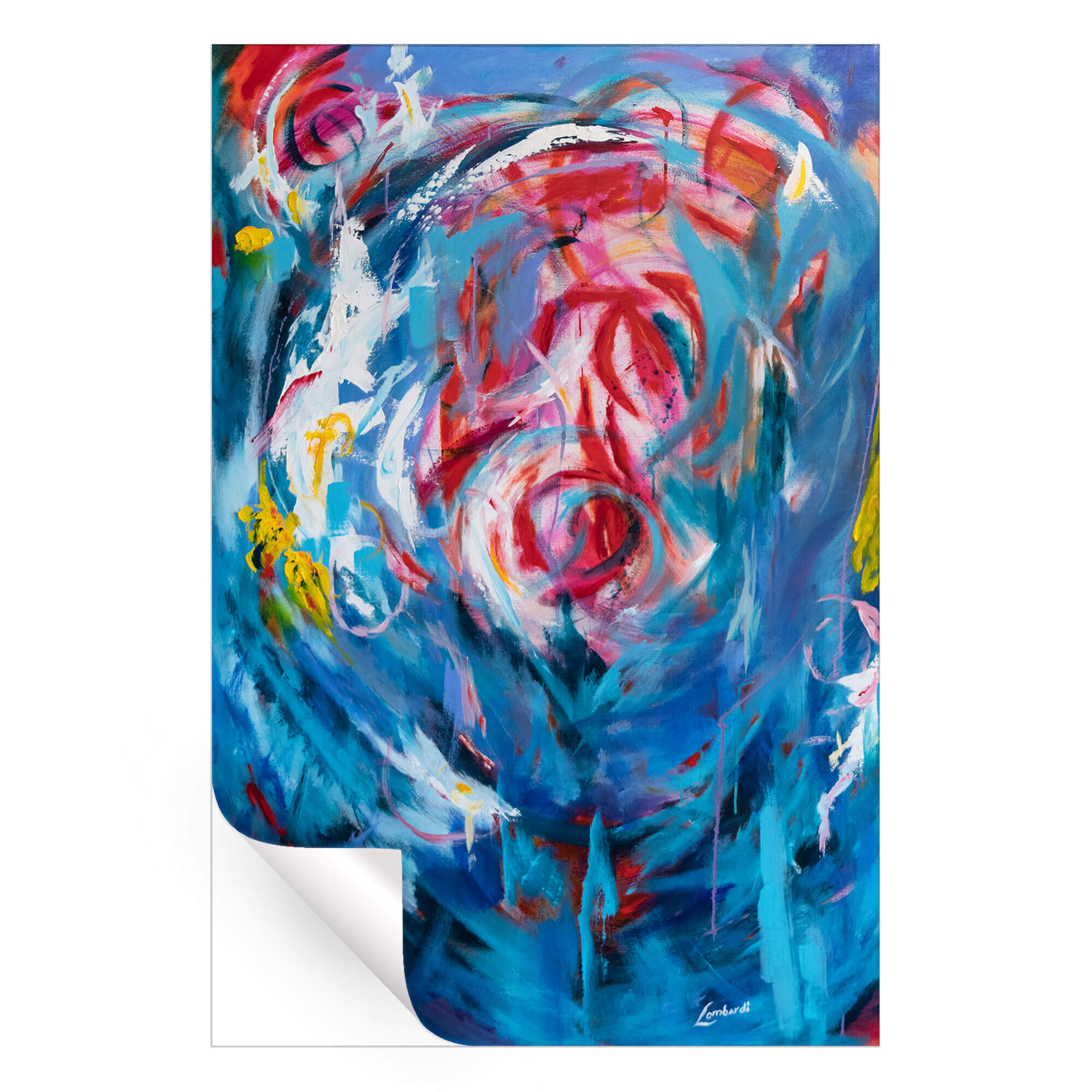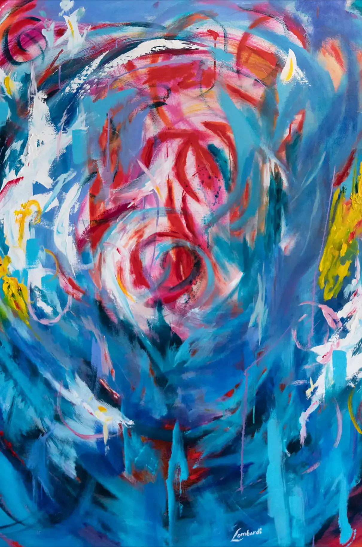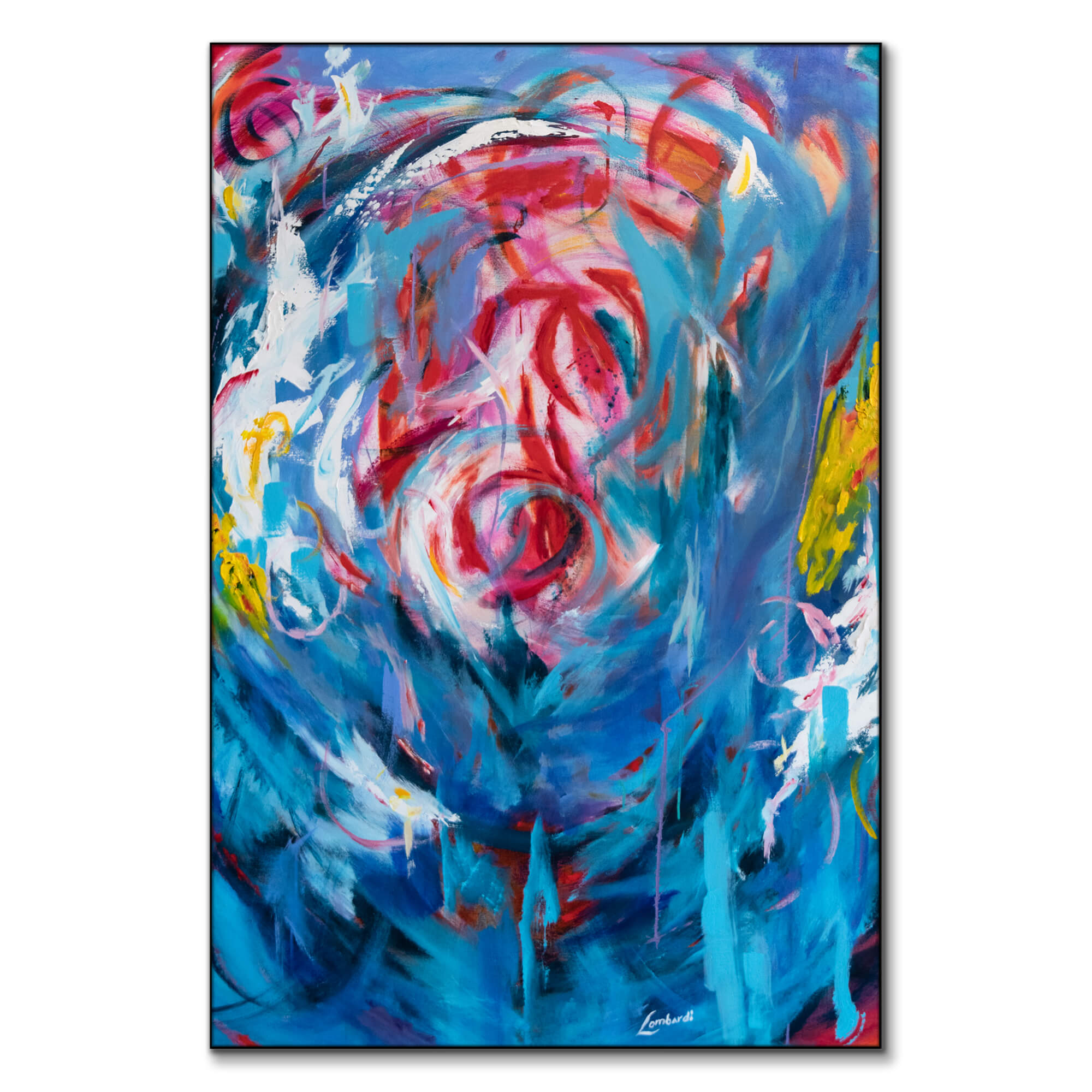 Vivid blues and soft reds swirl together in this piece by Bob Lombardi, creating a sense of depth and fluidity. Strokes of white and yellow cut through the composition, adding layers and highlights that draw the eye in a circular motion.