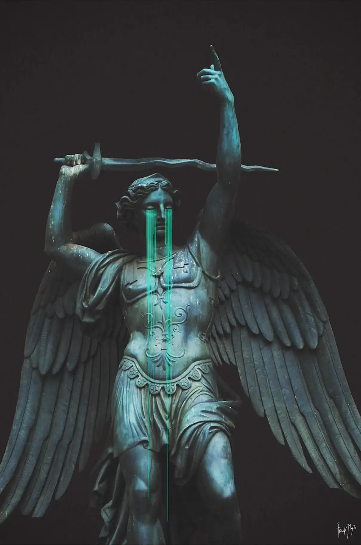 This artwork reimagines a classical angelic statue through a modern lens. The dark background contrasts sharply with the teal neon lines that stream from the figure’s eyes, creating a striking mix of tradition and technology. The statue’s pose—powerful yet sorrowful—adds emotional gravity to the glowing modern elements.