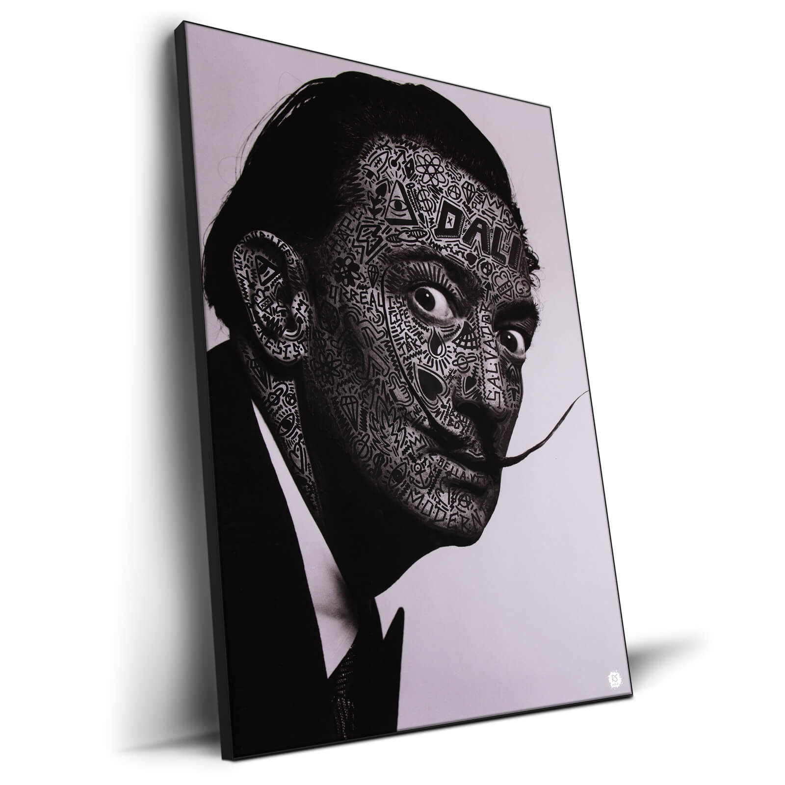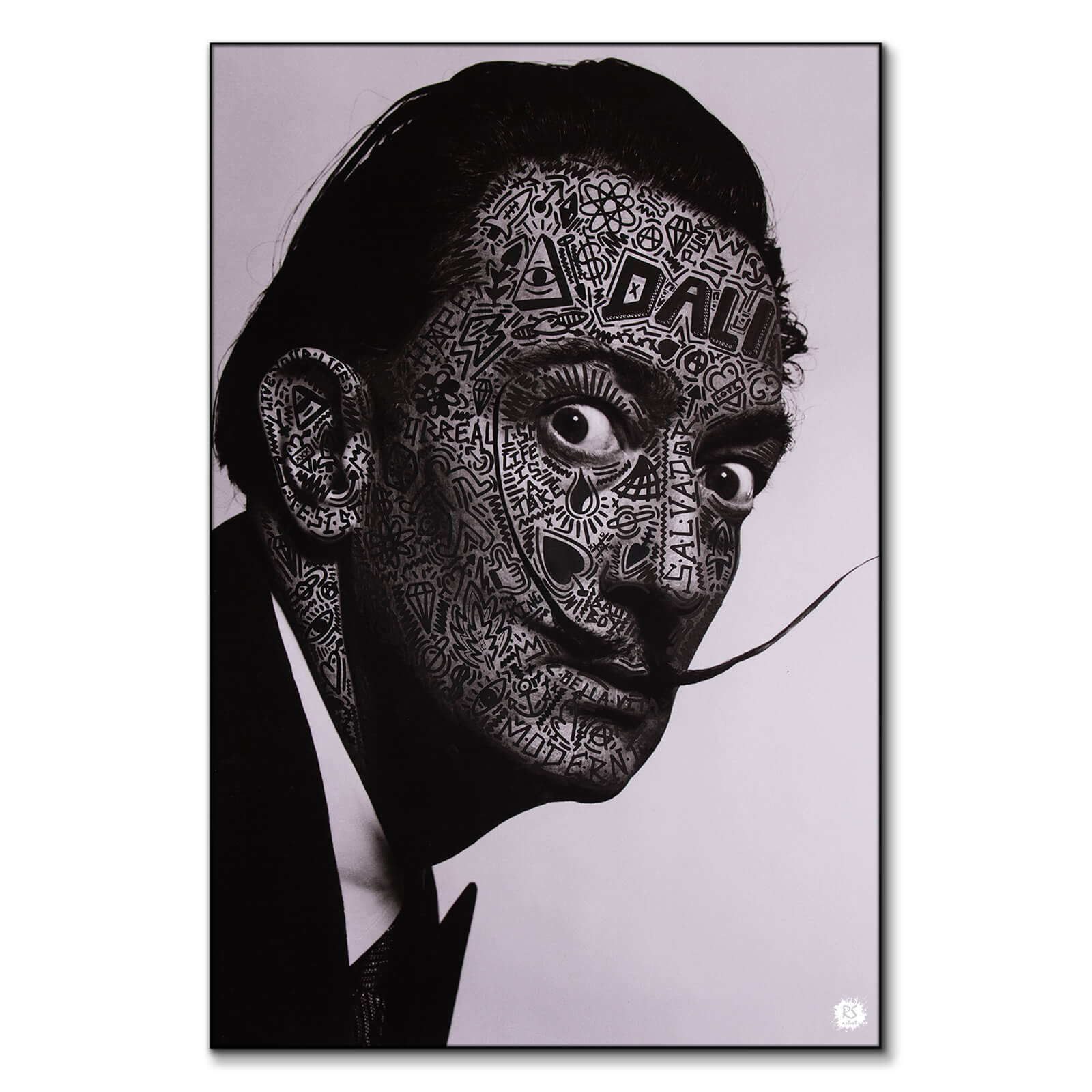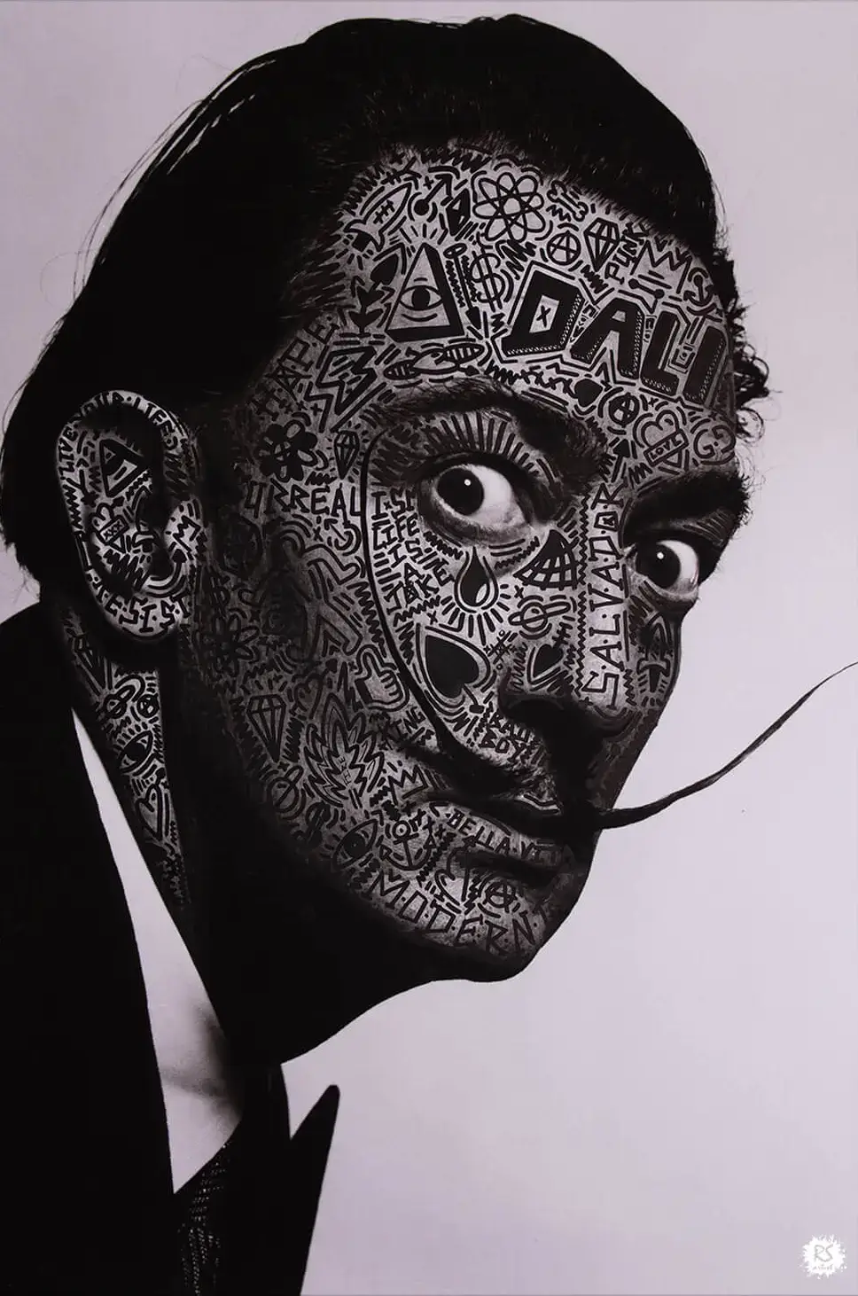 Salvador Dalí’s penetrating gaze is given a new dimension in this striking portrait, where the surrealist master’s face becomes a canvas for intricate symbols and text. The monochrome palette underscores the complexity of the patterns, each line and character a nod to the artist’s own iconic style of enigmatic symbols and dreamlike scenarios. This piece captures the essence of Dalí’s unique vision, offering a thought-provoking addition to any collection.