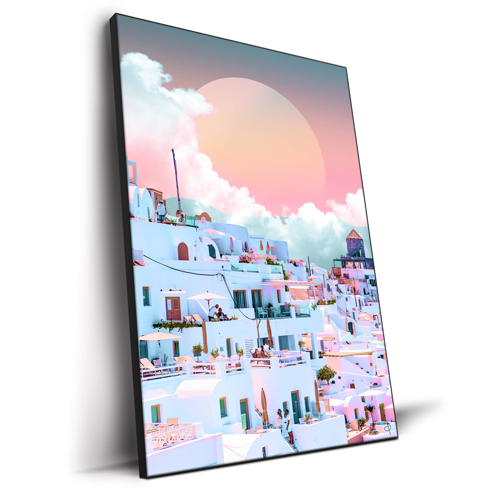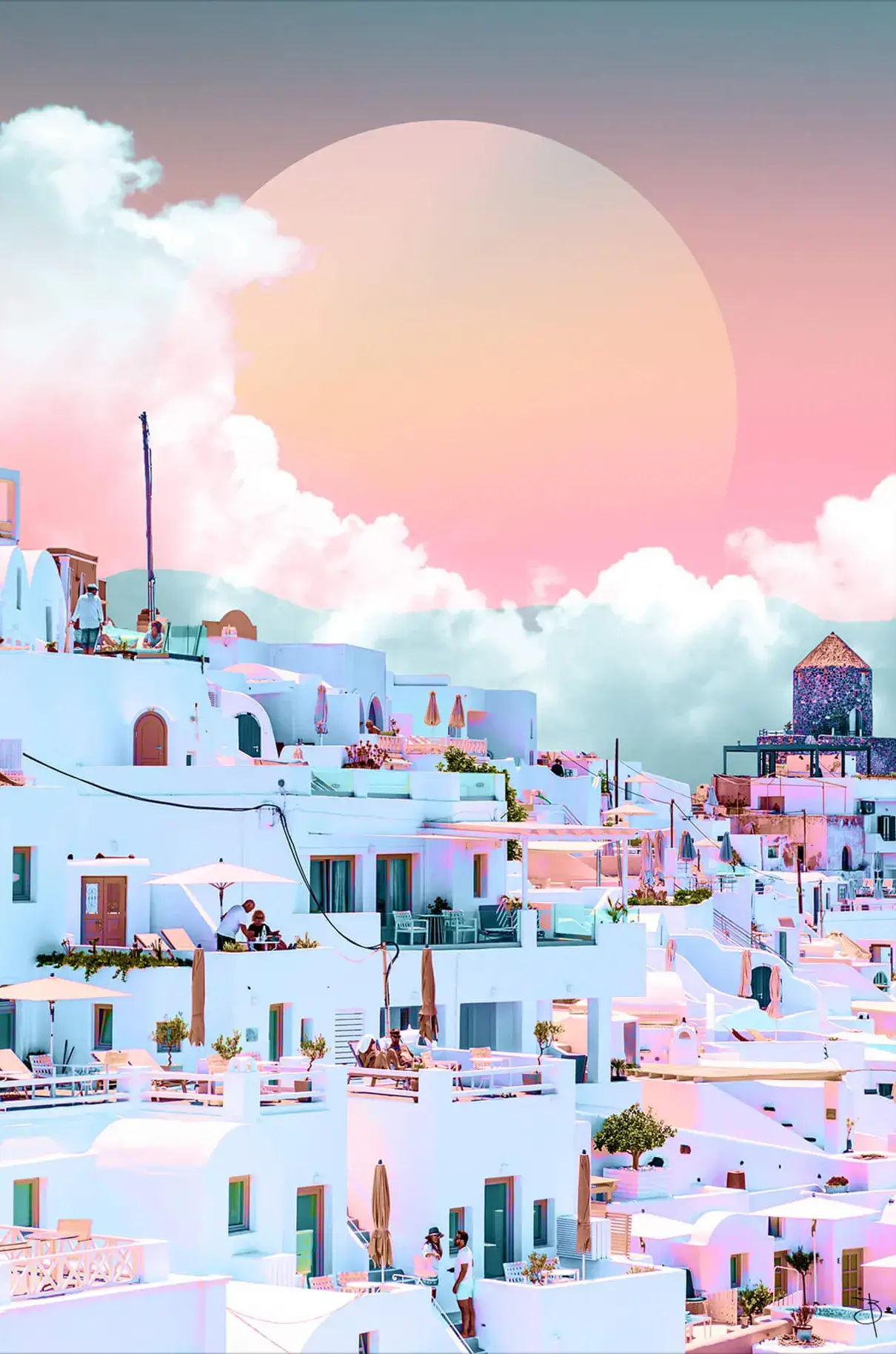 A view of the iconic white-washed buildings of Santorini, Greece. The structures are bathed in pastel pinks and blues, creating a dreamlike atmosphere. A large, soft orange sun hangs low in the sky, casting a warm glow over the scene. Fluffy clouds drift by, enhancing the ethereal quality of the image. It’s a digitally created piece that merges elements of a classic Greek island view with fantasy-like colors.