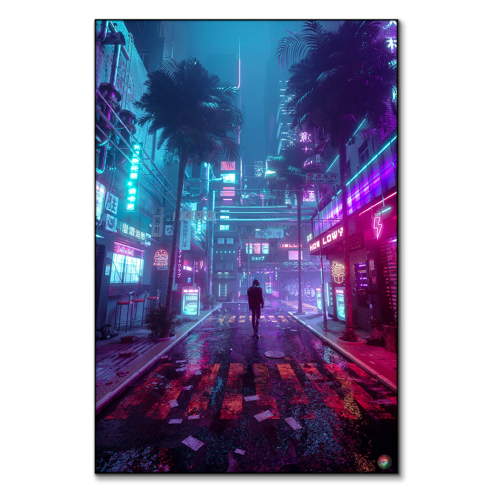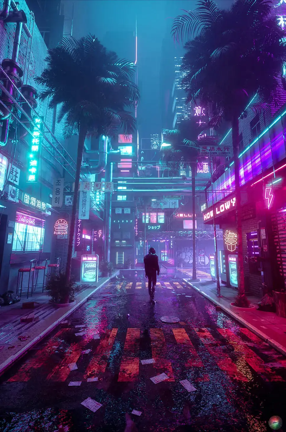 A solitary figure traverses a rain-drenched street, flanked by the neon glow of signs and the silhouettes of towering skyscrapers. Palms sway gently in the urban breeze, and the slick pavement reflects the vivid colors. A snapshot of solitude in the vibrancy of a city that never sleeps.