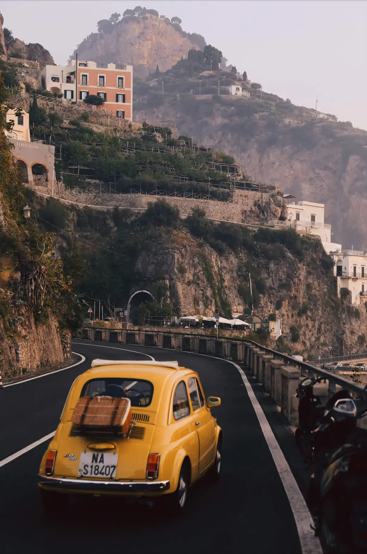 Driving down the Italian Amalfi Coast with Zachary Snellenberger. A yellow car winds down the coastal road, where cliffs rise dramatically from the sea.