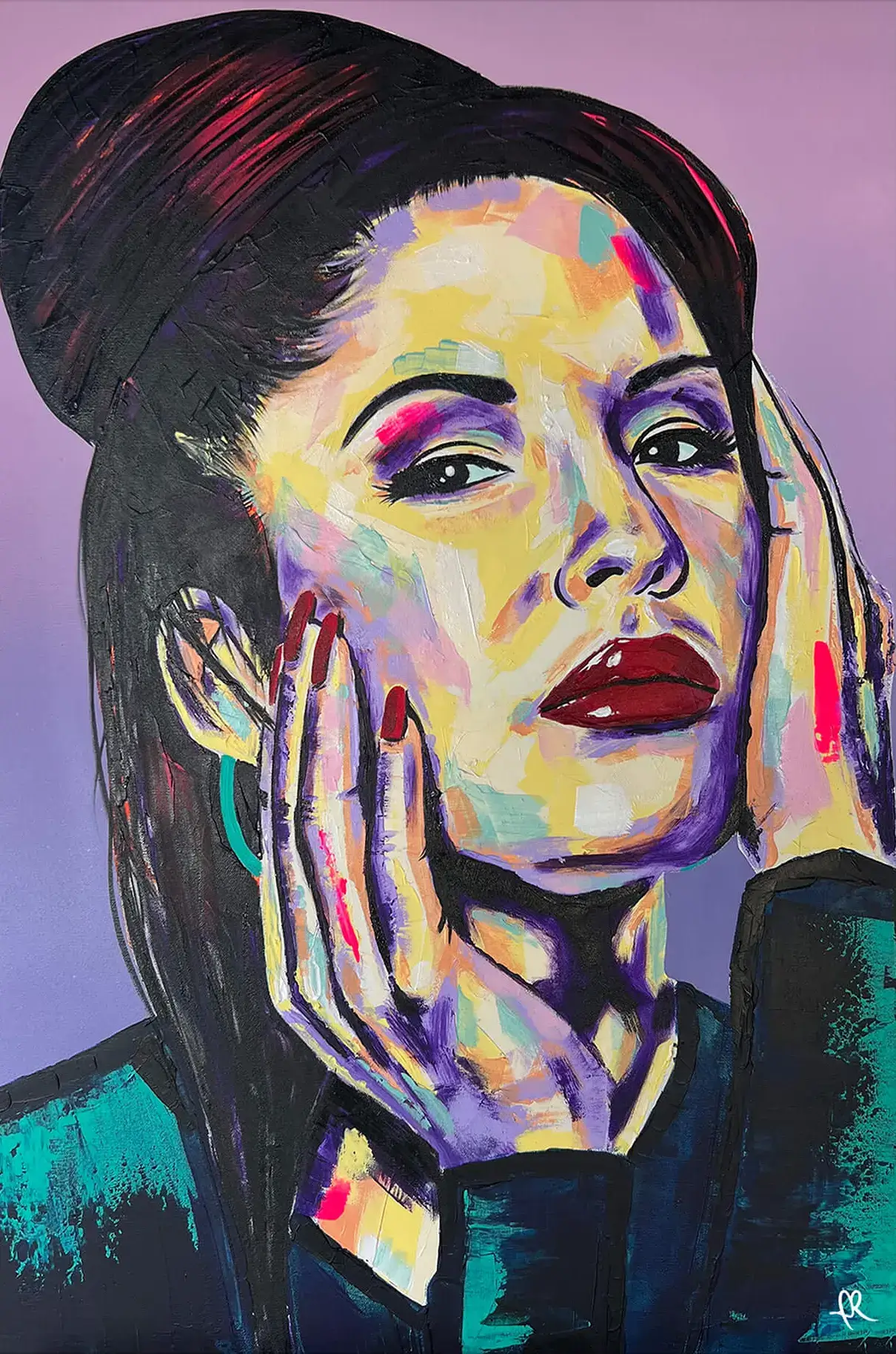 With her hands framing her face, Selena’s expression is both powerful and graceful, as the contrasting colors and brushwork enhance her emotive expression. The portrait exudes her spirit and connection to her music, making it a stunning tribute to the Queen of Tejano.