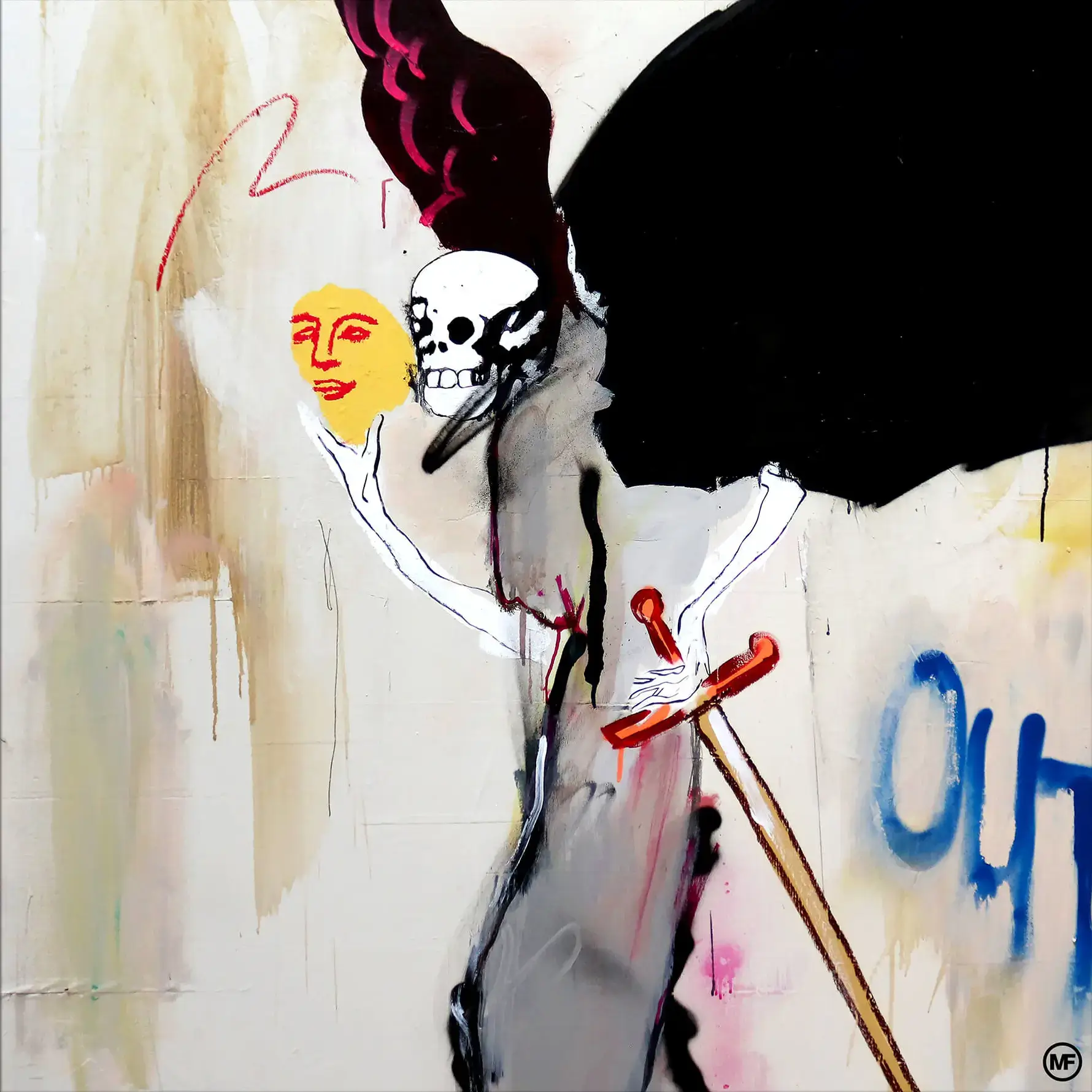 A skeleton wearing a mask and holding a sword creates a striking visual that blends macabre elements with artistic flair. This piece adds a bold and edgy touch to any space.