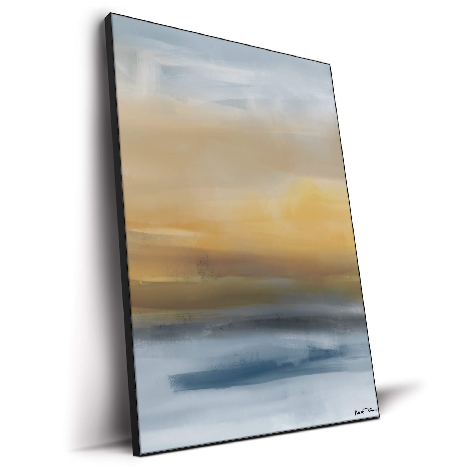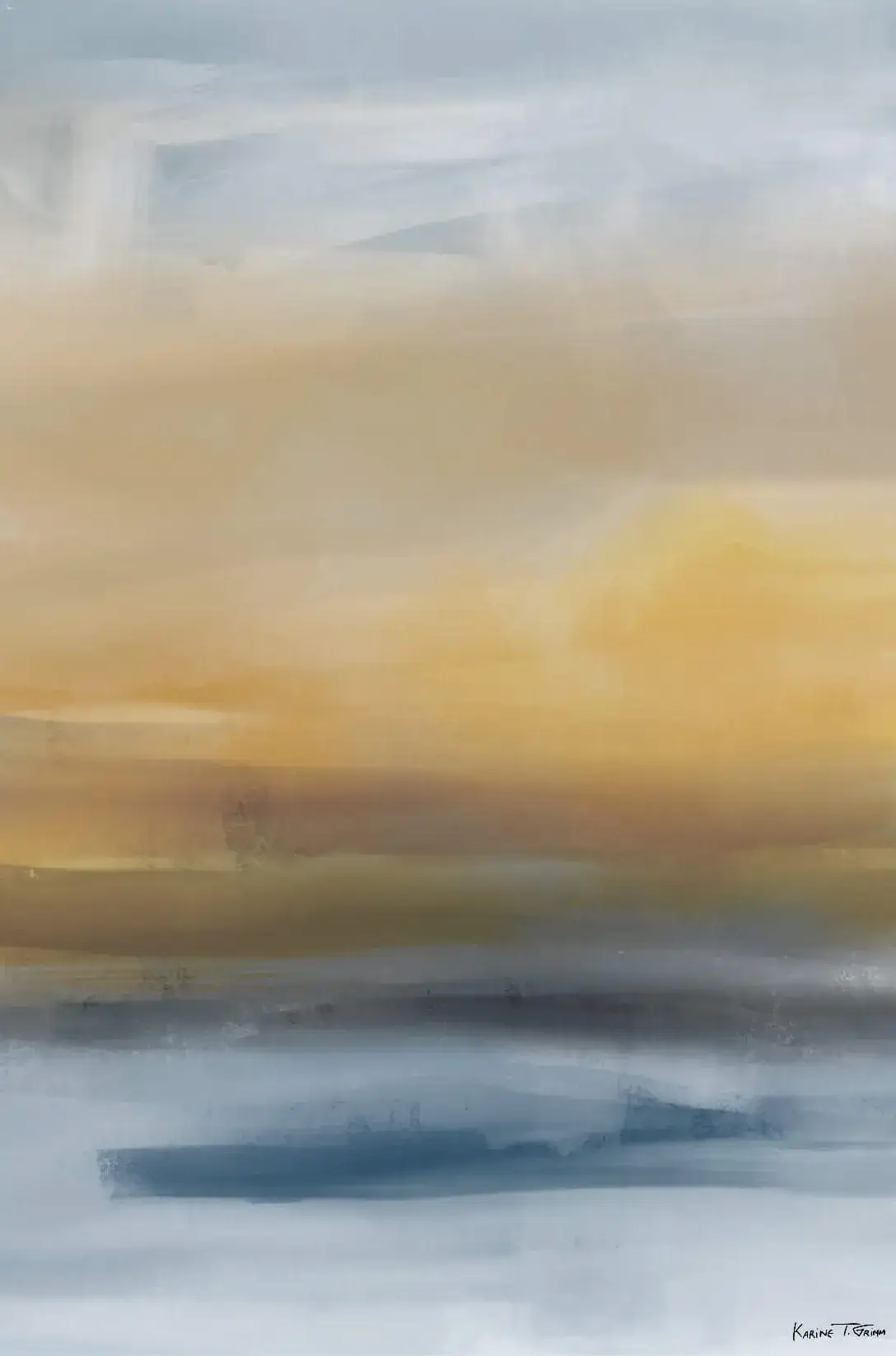 Sweeping strokes of blue and icy white at the lower part of the scene evoke the brisk, open expanse of a frozen landscape. Just above, a warm band of amber and yellow cuts through, a contrast that is reminiscent of a late afternoon glow over a wintry scene. Wispy strokes of white and pale blue at the top soften the transition, suggesting a chilly, overcast sky clearing just before dusk.