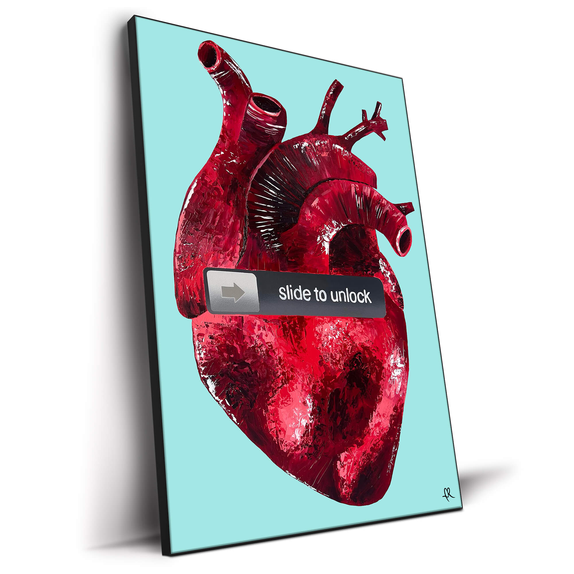 A detailed depiction of a human heart is rendered in rich shades of red, standing out prominently against a light turquoise background. Superimposed on the heart is the familiar “slide to unlock” bar from smartphones, complete with a gray arrow and text, adding a modern, digital twist to the organic subject.