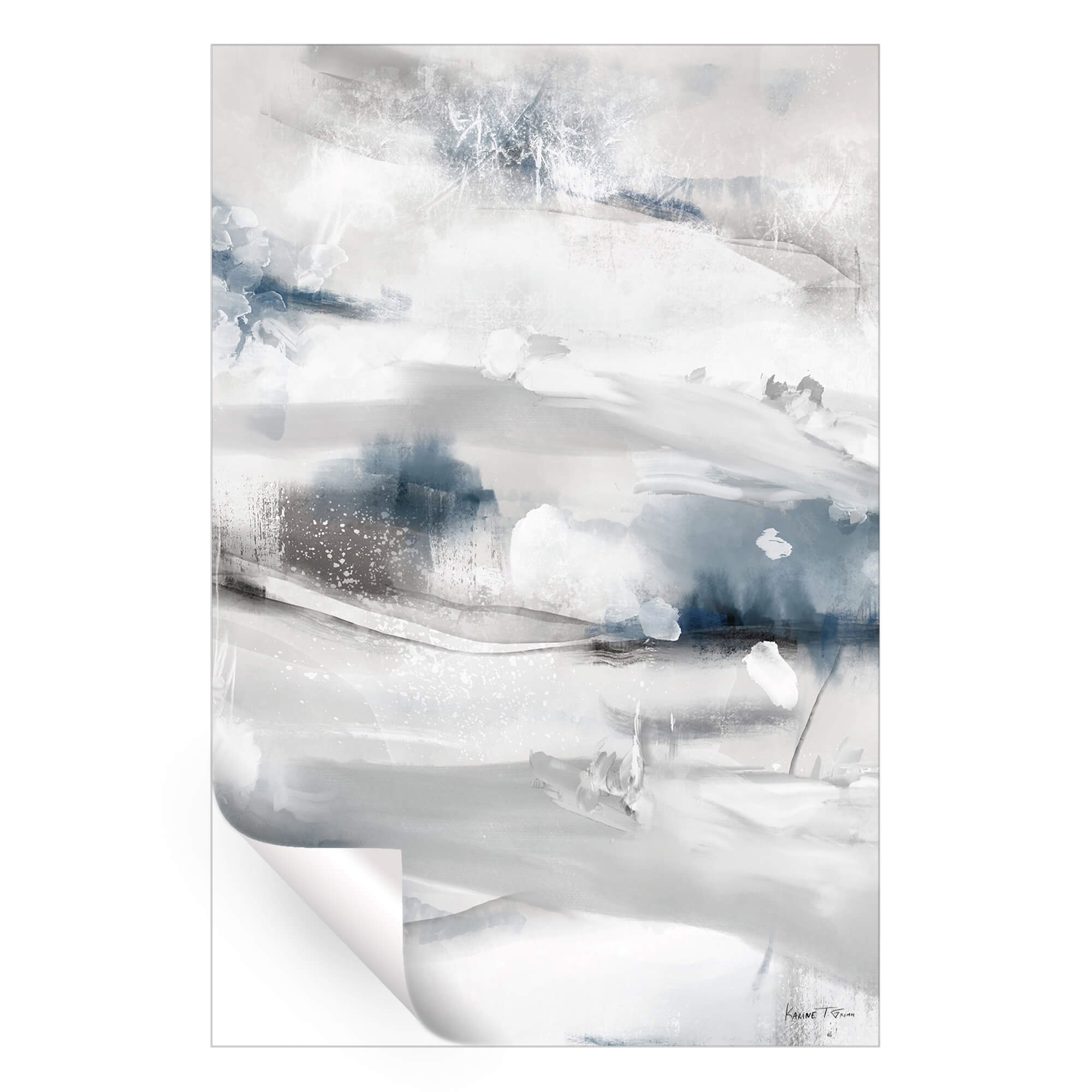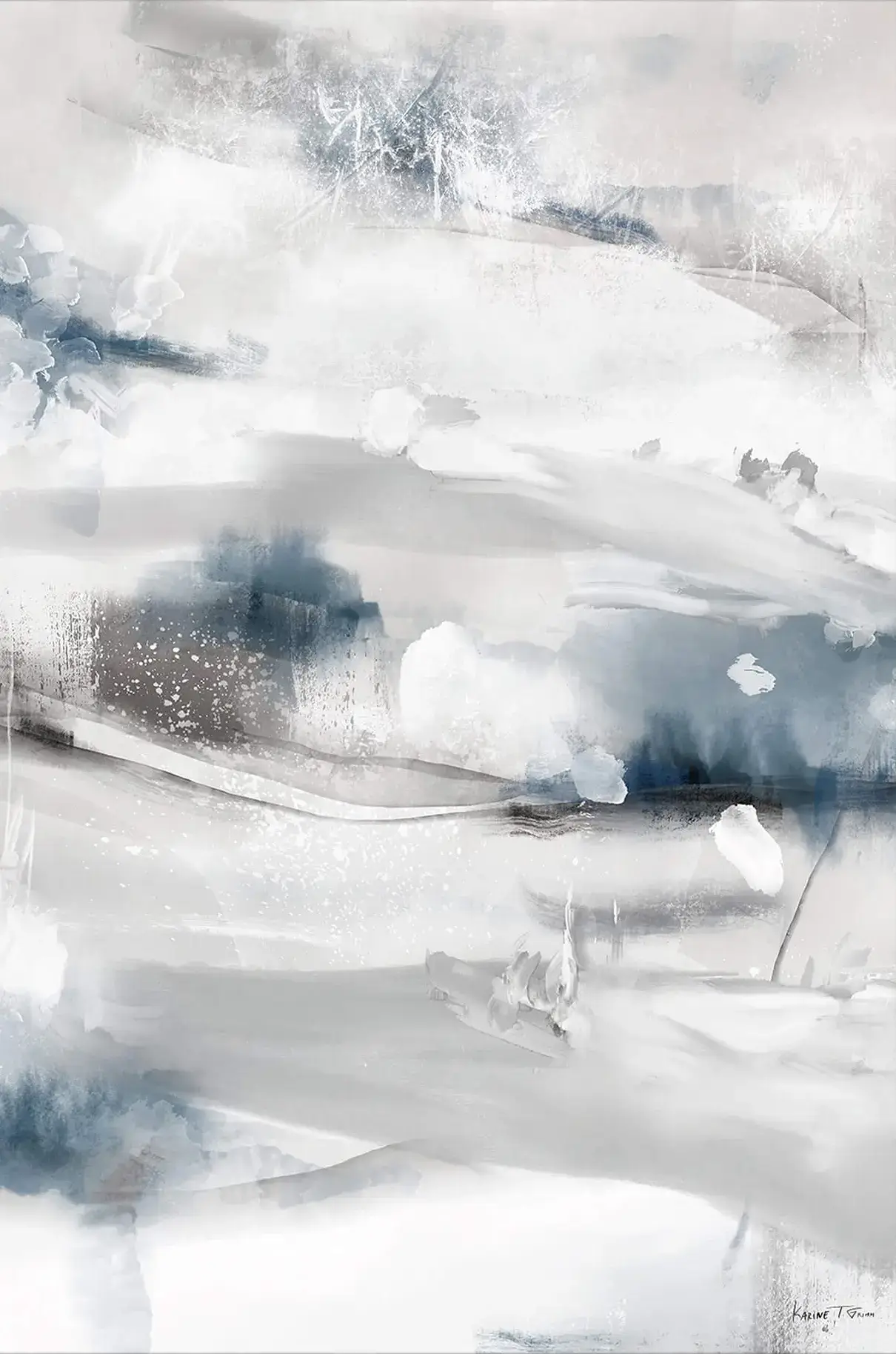 A soft yet impactful depiction of a snowy landscape in this abstract artwork, where cool shades of gray, blue, and white swirl across the canvas. The composition evokes a tranquil winter scene, with subtle texture differences and blurred brushstrokes that suggest the calm after a snowfall.