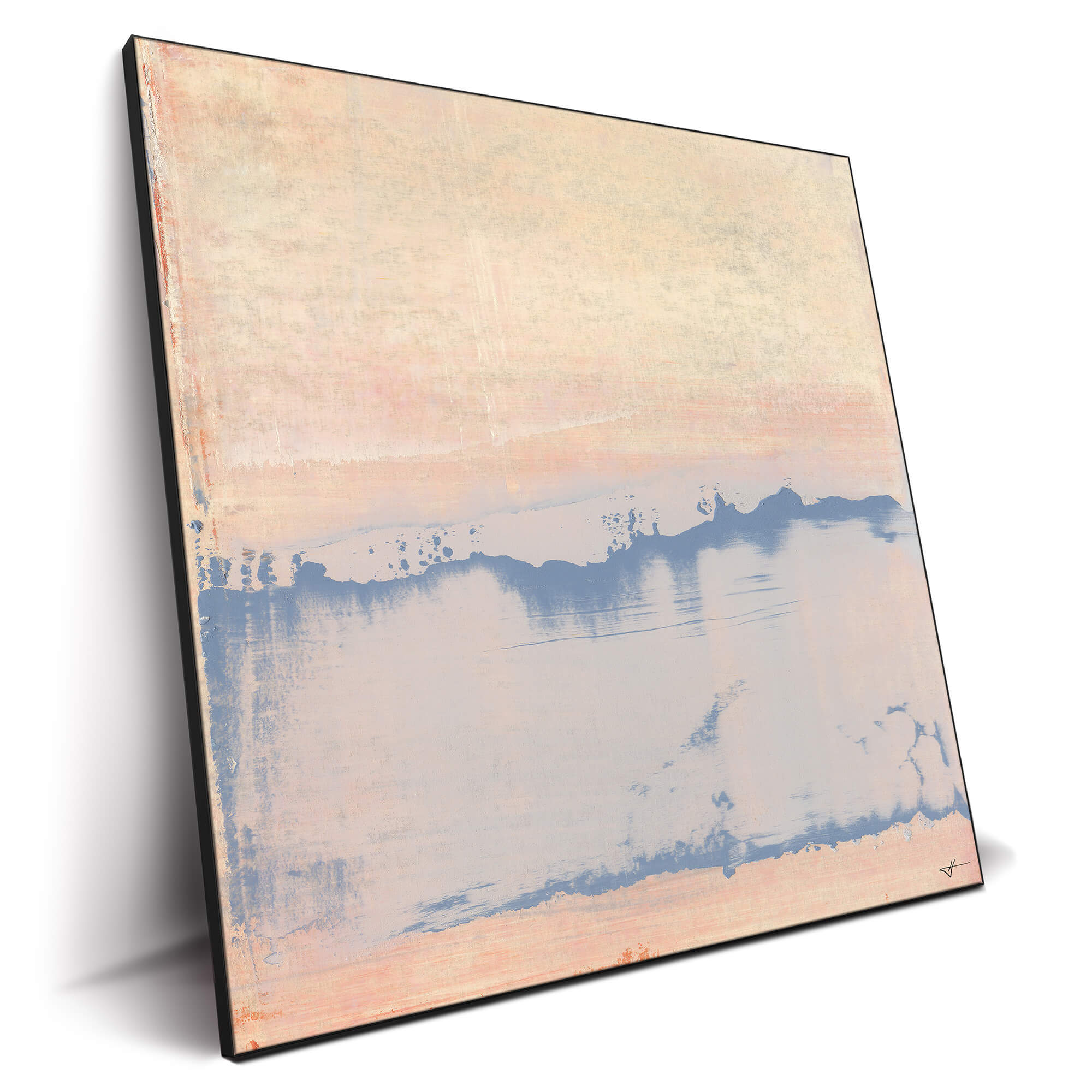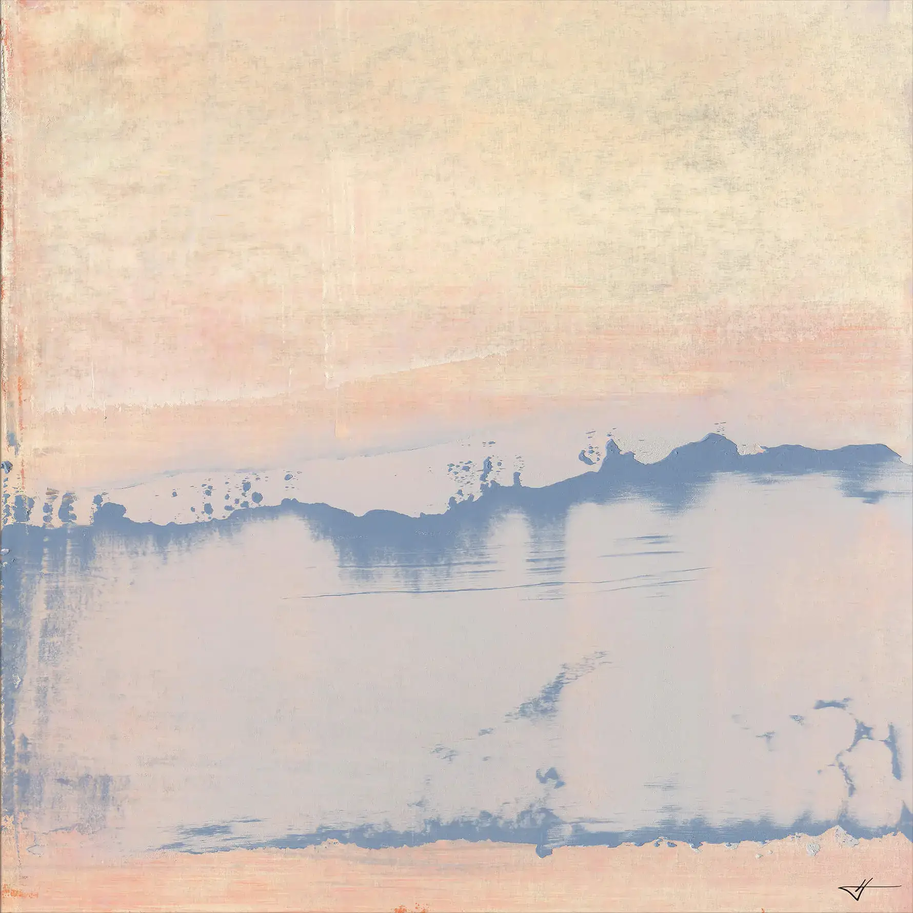 Muted tones of yellow, peach, and blue create a peaceful abstract landscape. Brushstrokes and delicate textures give the impression of a horizon and the soft, blended colors invite a sense of calm and contemplation.