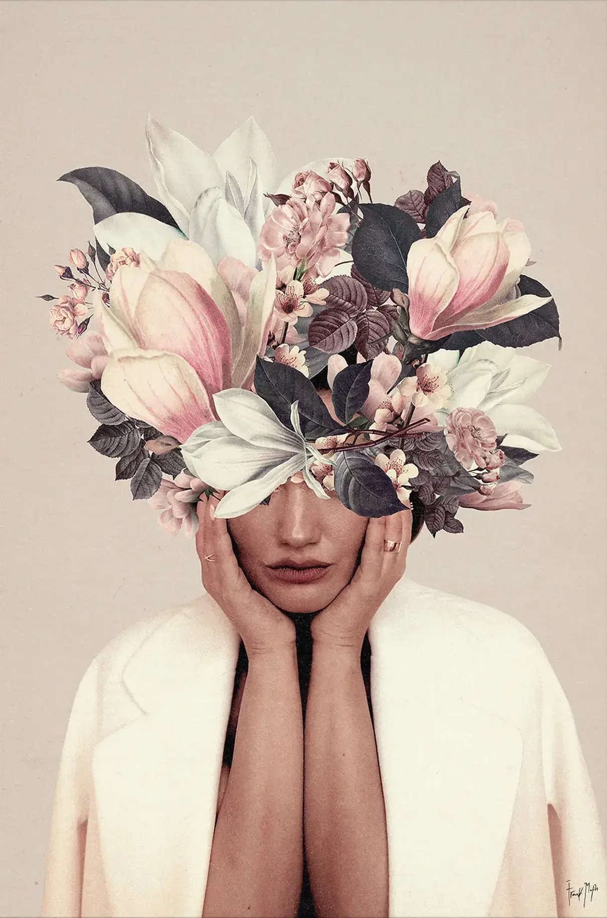 his artwork feels tender and contemplative. A woman rests her face in her hands, her head blooming into an intricate arrangement of pale pink lilies and magnolia petals. The soft lighting and muted beige tones make the image feel calm and intimate—like a visual expression of thought and emotion unfolding at once.