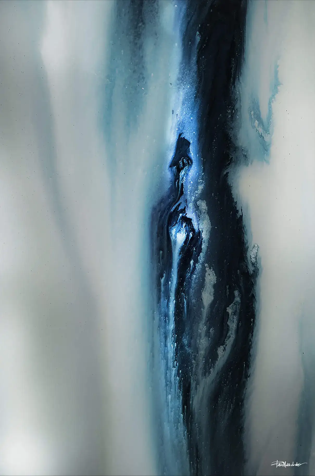 This striking abstract artwork combines deep blues and soft whites, capturing the fluidity of motion with a sense of calm. The gentle gradient of colors flowing from dark to light creates an ethereal atmosphere, while the subtle texture adds depth and intrigue. The composition evokes the natural beauty of flowing water or a misty landscape, offering a serene and sophisticated aesthetic. Printed on high-quality materials, this piece brings elegance and peaceful energy to any room, perfect for modern and minimalist interiors that crave bold yet calming art.