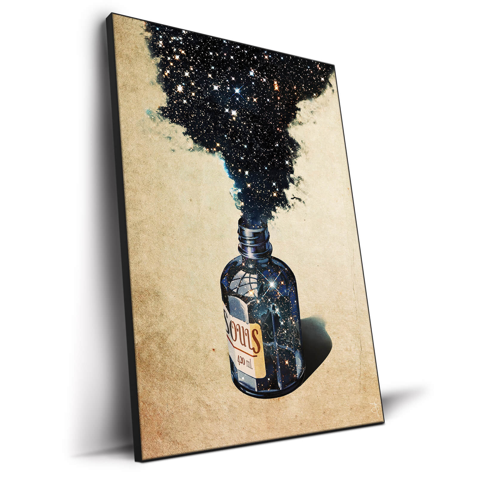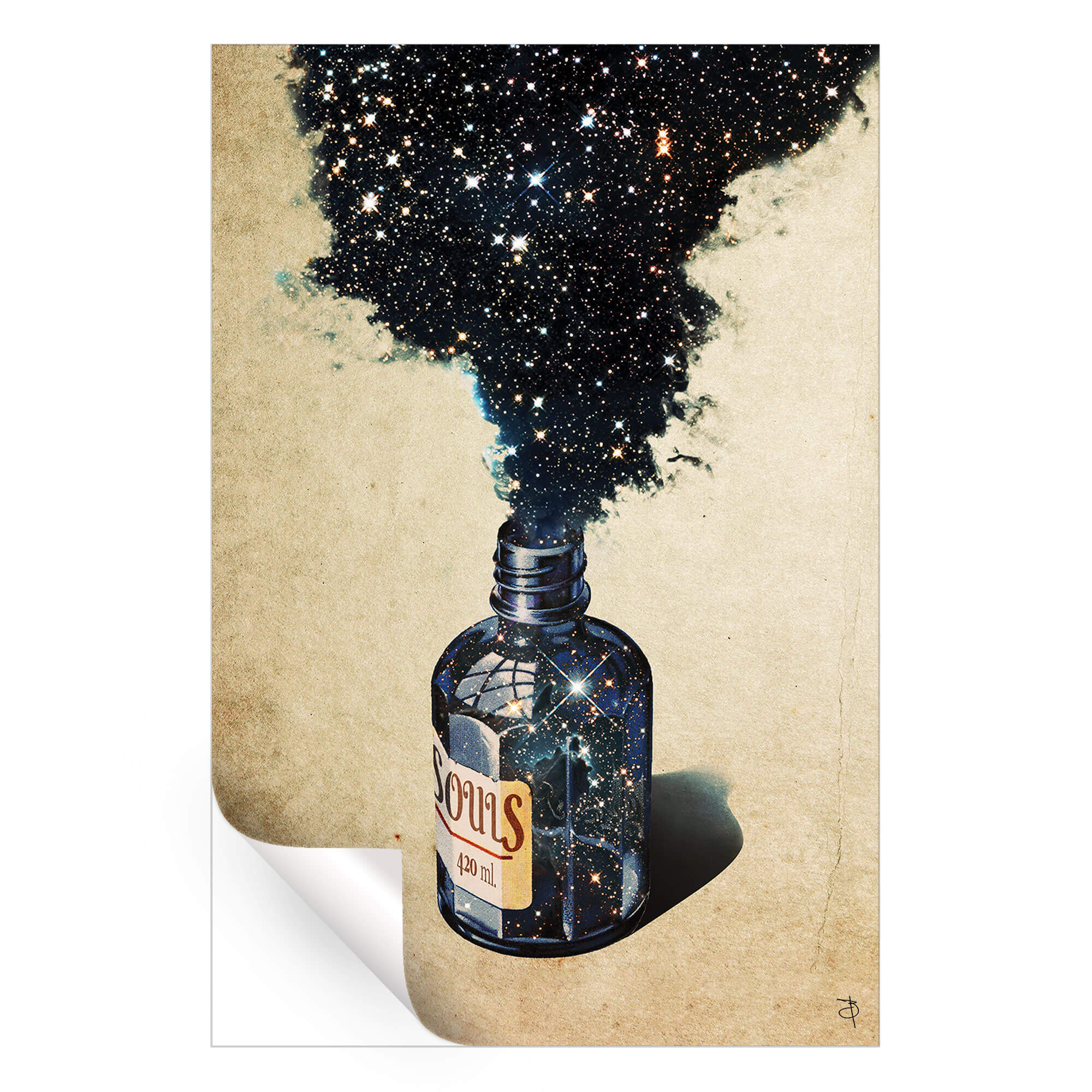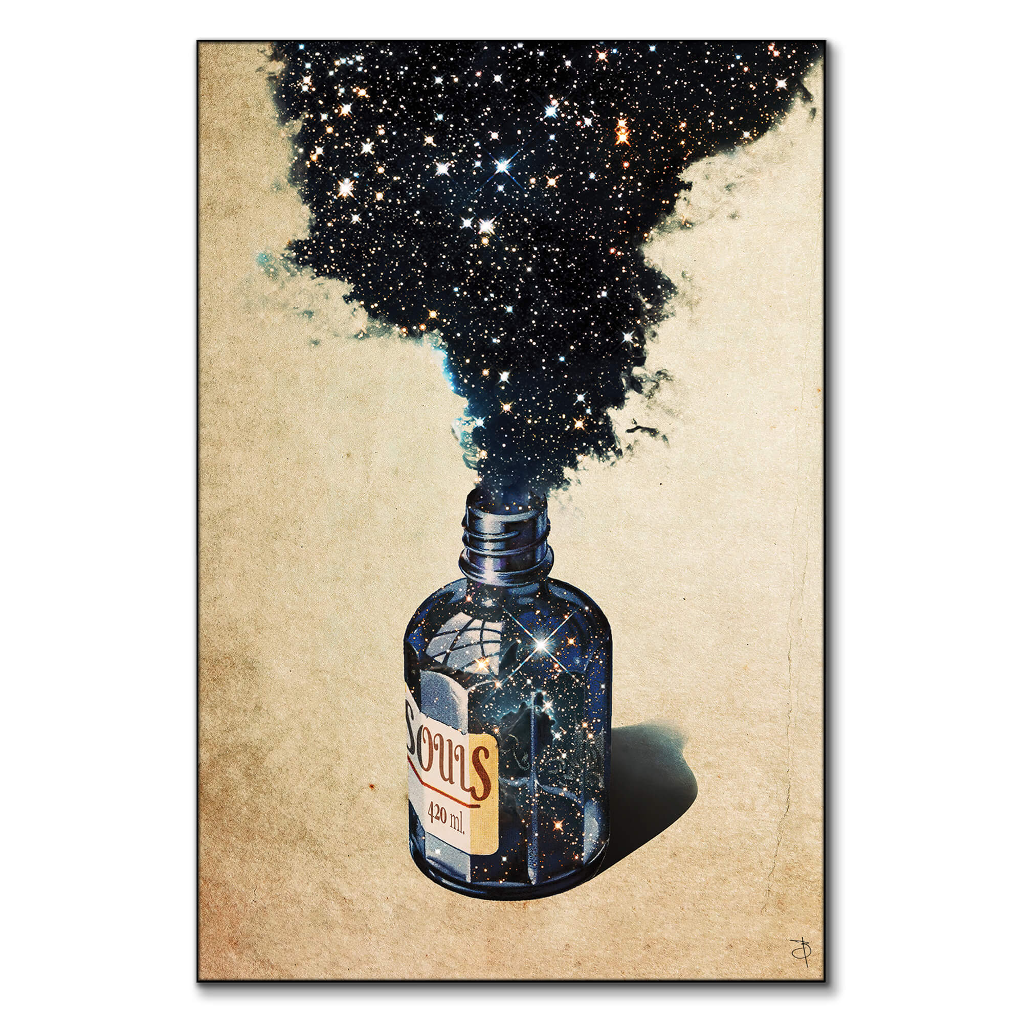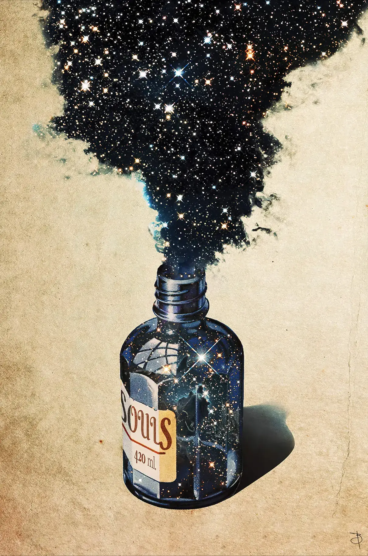 An ink bottle labeled “Souls” spills a galaxy, stars escaping into the vastness of space from its open top. The image marries the everyday with the cosmic, creating a surreal visual that suggests the containment and release of something infinite. Set against a textured, parchment-like background, the piece evokes a vintage feel, reminiscent of a collage.