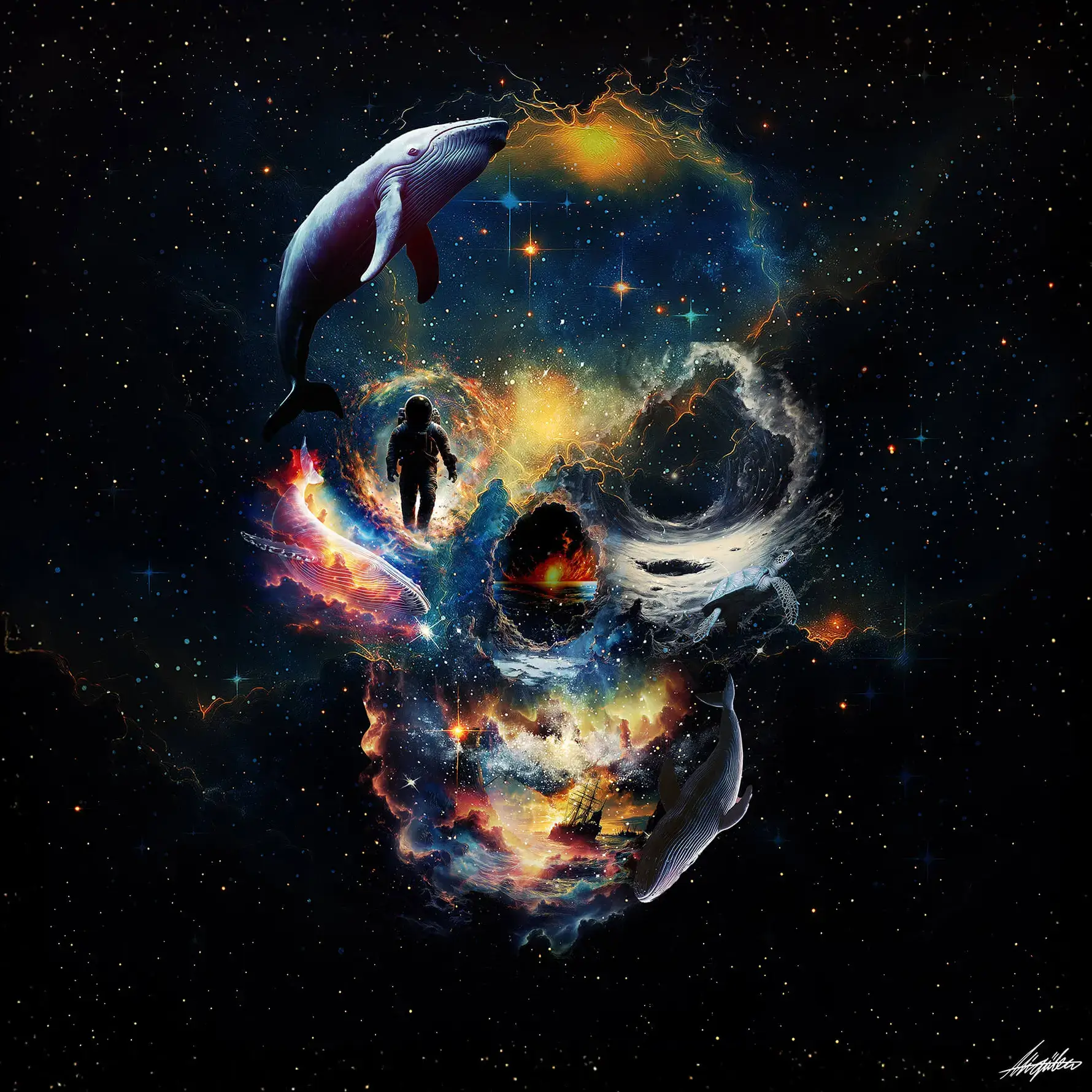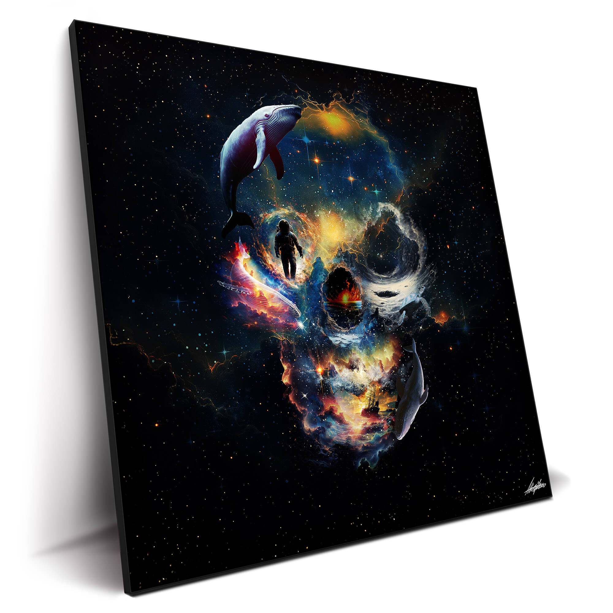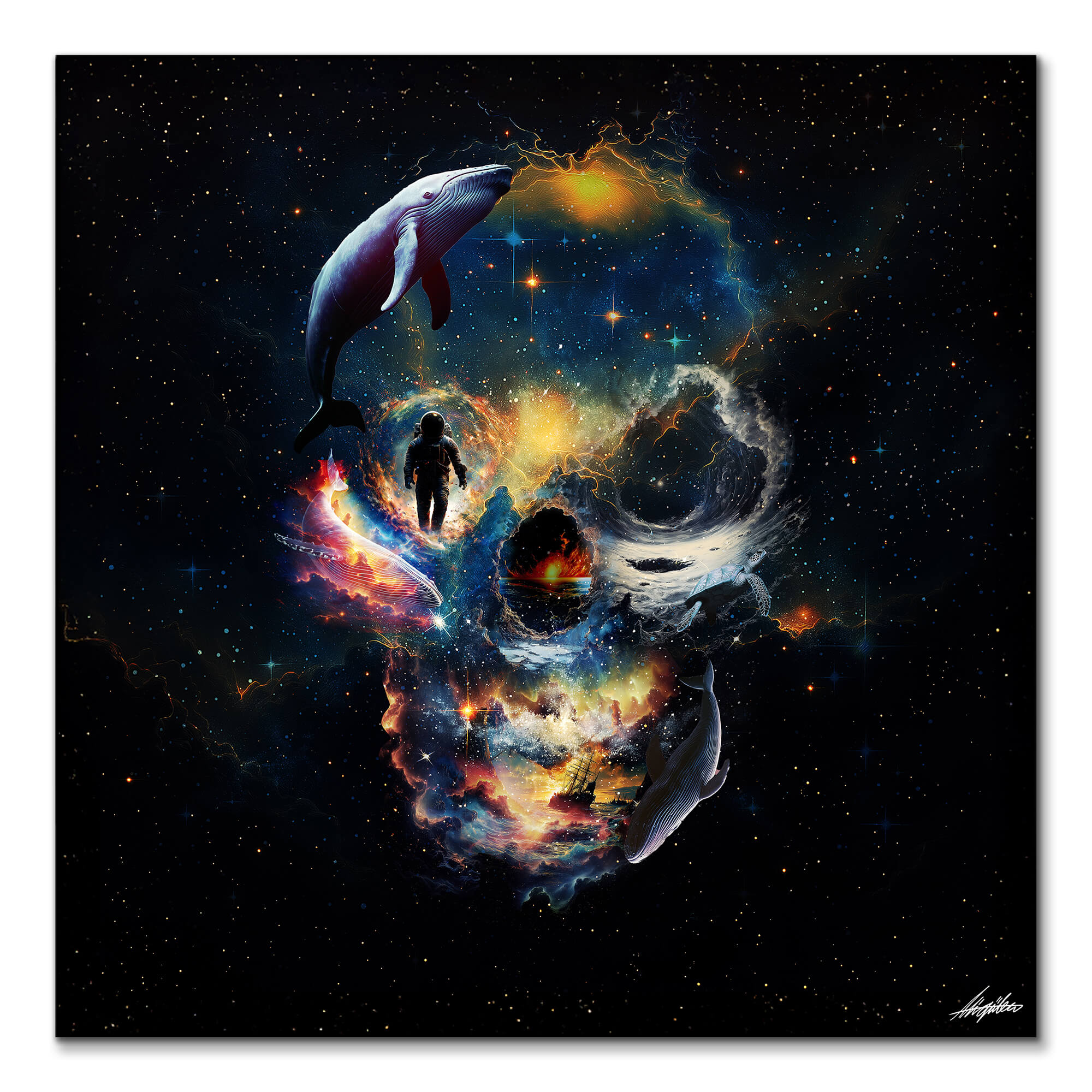 Experience a mesmerizing fusion of color and mystery with the “Portal Skull” artwork. This piece captivates with its surreal blend of space and skull motifs, creating a euphoric and psychedelic atmosphere. The bold colors and intricate details draw you into a world where the macabre meets the cosmic. Explore more in our surreal wall art and skull wall art pieces.