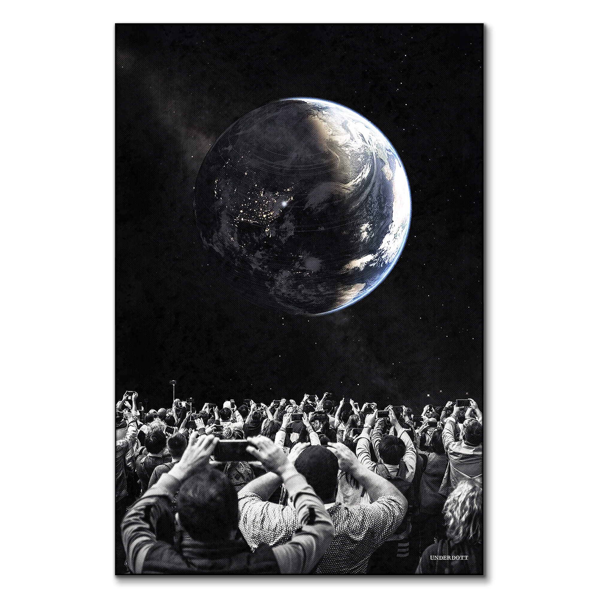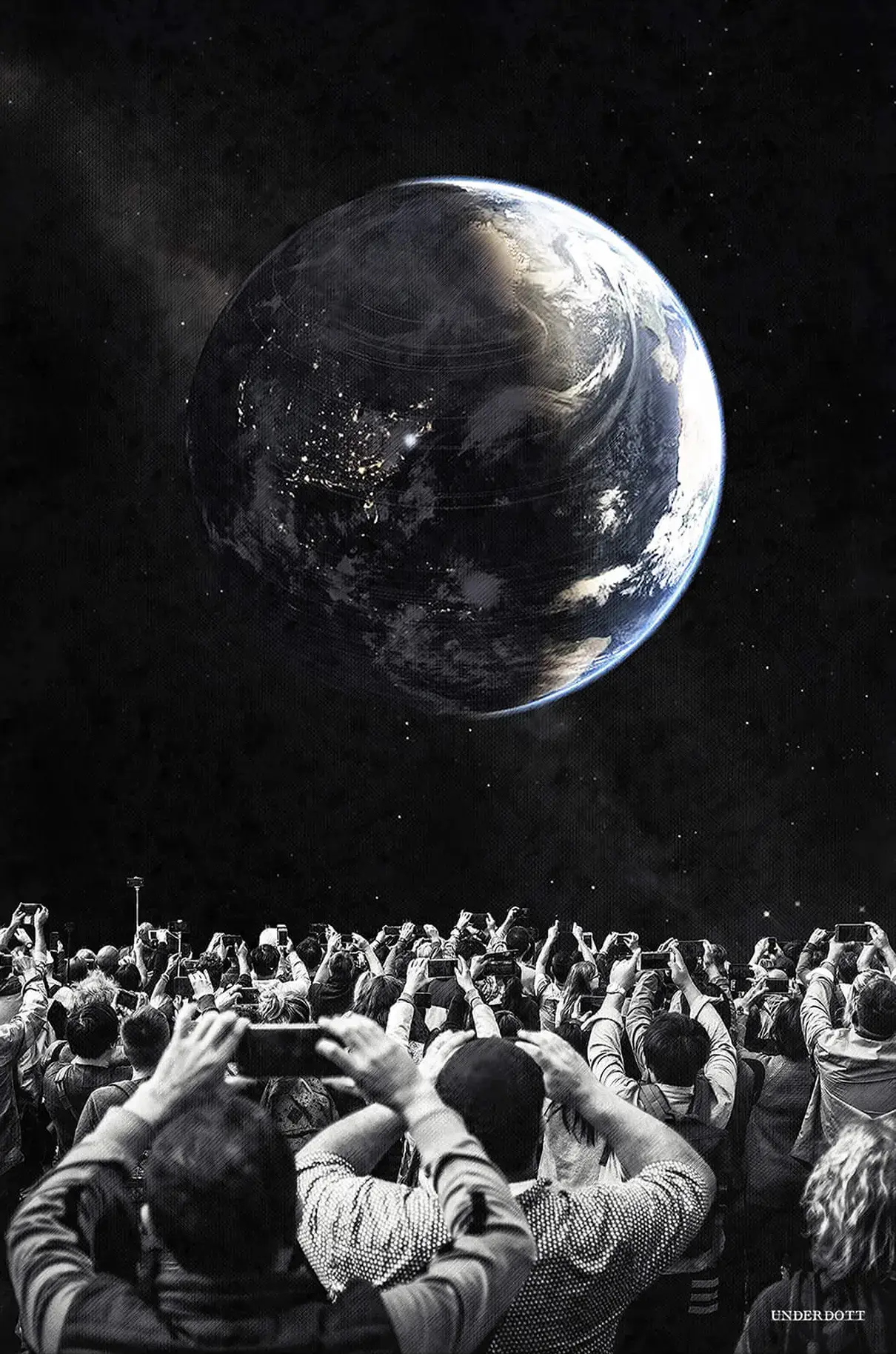 Hundreds of onlookers raise phones toward a night sky that seems too close to touch. Floodlights of tiny screens halo their upturned faces while the crowd itself melts into grainy blacks and silvery whites. Above them, a luminous Earth rotates against a velvet void, its city lights sparkling like distant constellations. Tiny wisps of cloud sweep across the oceans and faint stardust radiates around the planet. The contrast between the feverish spectators and the silent world overhead feels both euphoric and ominous. Each figure is rendered in crisp monochrome, pushing the vibrant blue rim of the globe forward. Stark negative space deepens the sense of height and infinite distance. Every detail invites viewers to question whether they are witnessing reality or a dream.