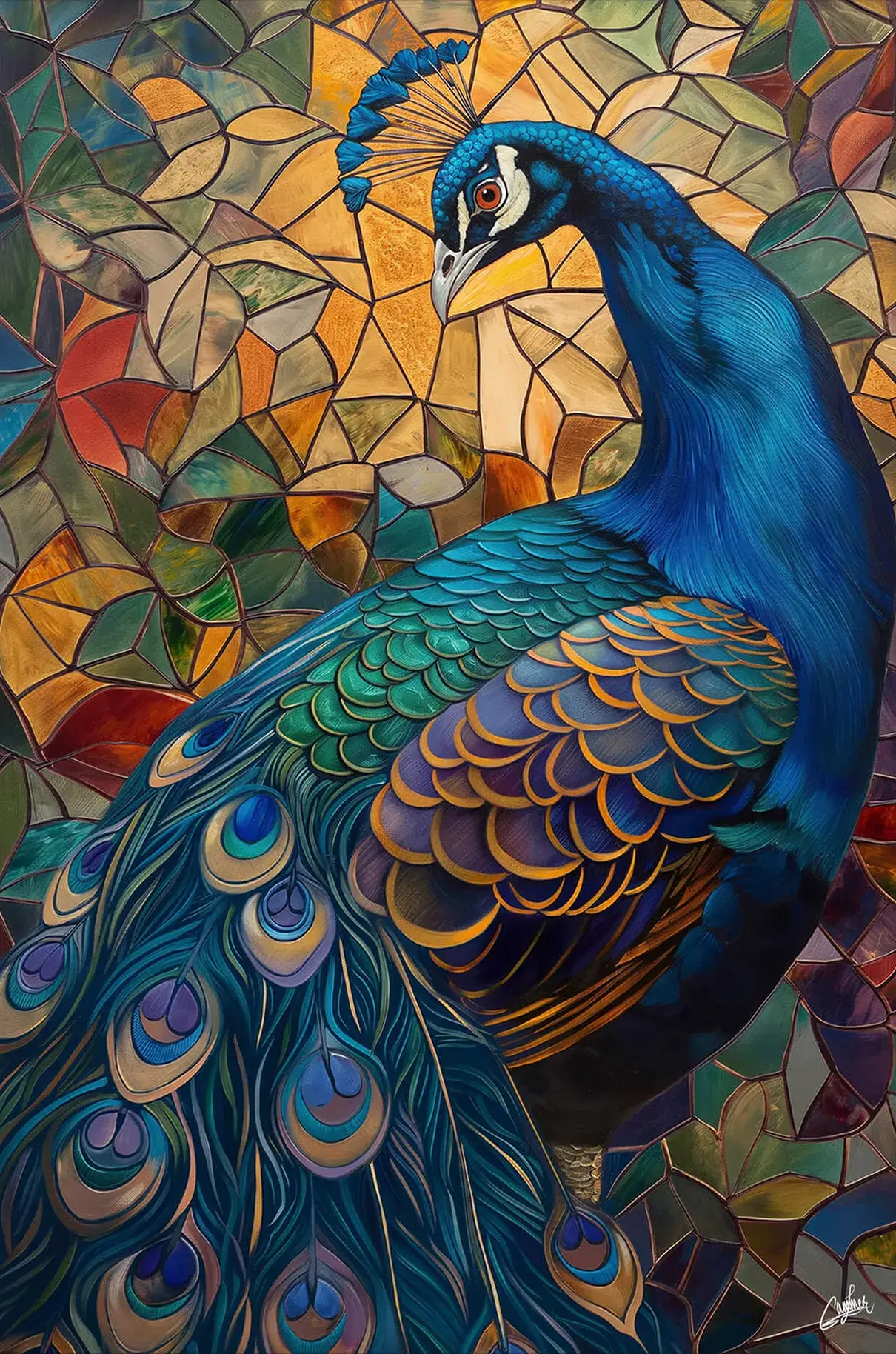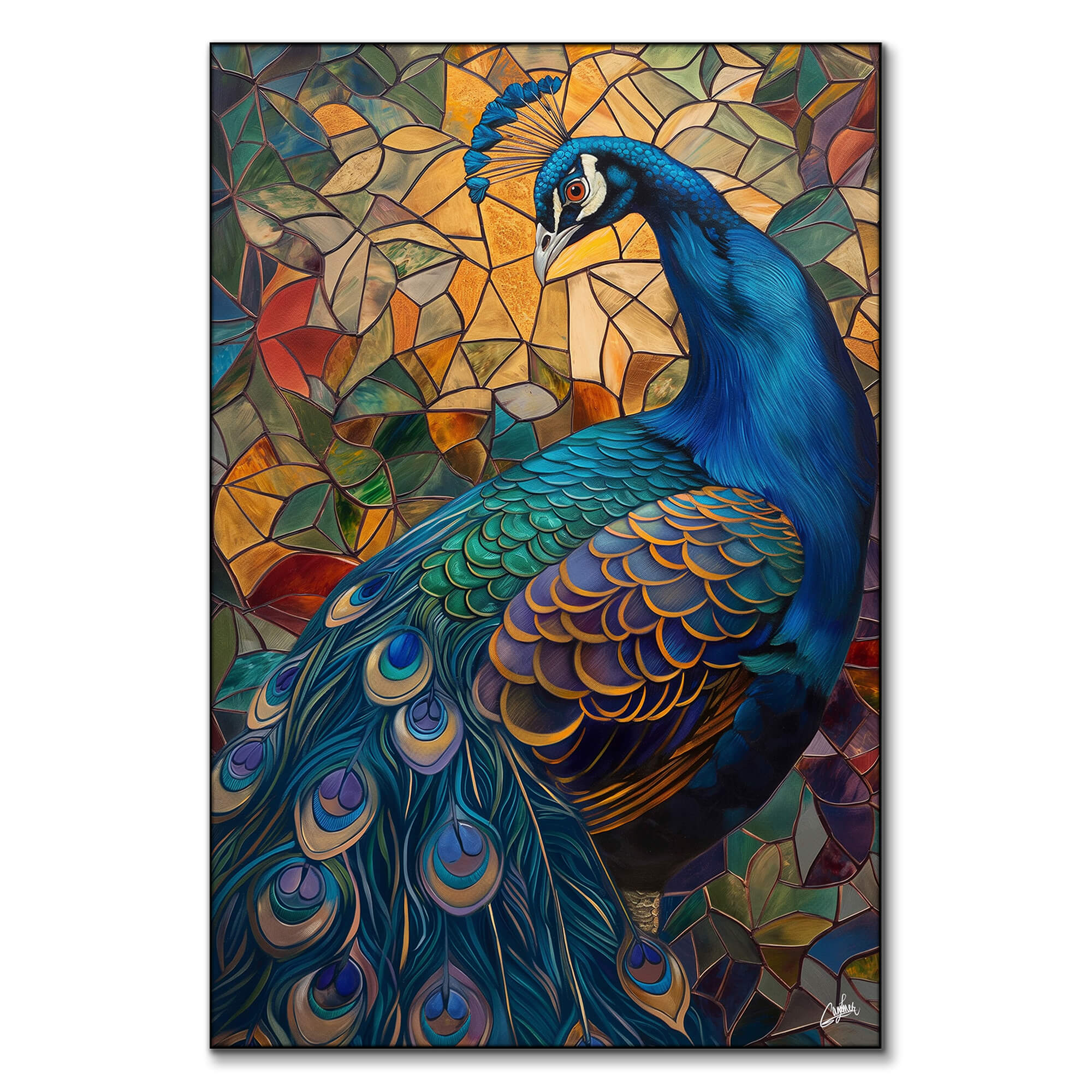 This vibrant collage features a striking leaded glass design of a peacock, showcasing a rich array of colors and textures. The intricate patterns and vivid hues create a dynamic visual experience that captures the essence of this majestic bird. Ideal for anyone looking to infuse their home with artistic flair and lively energy.