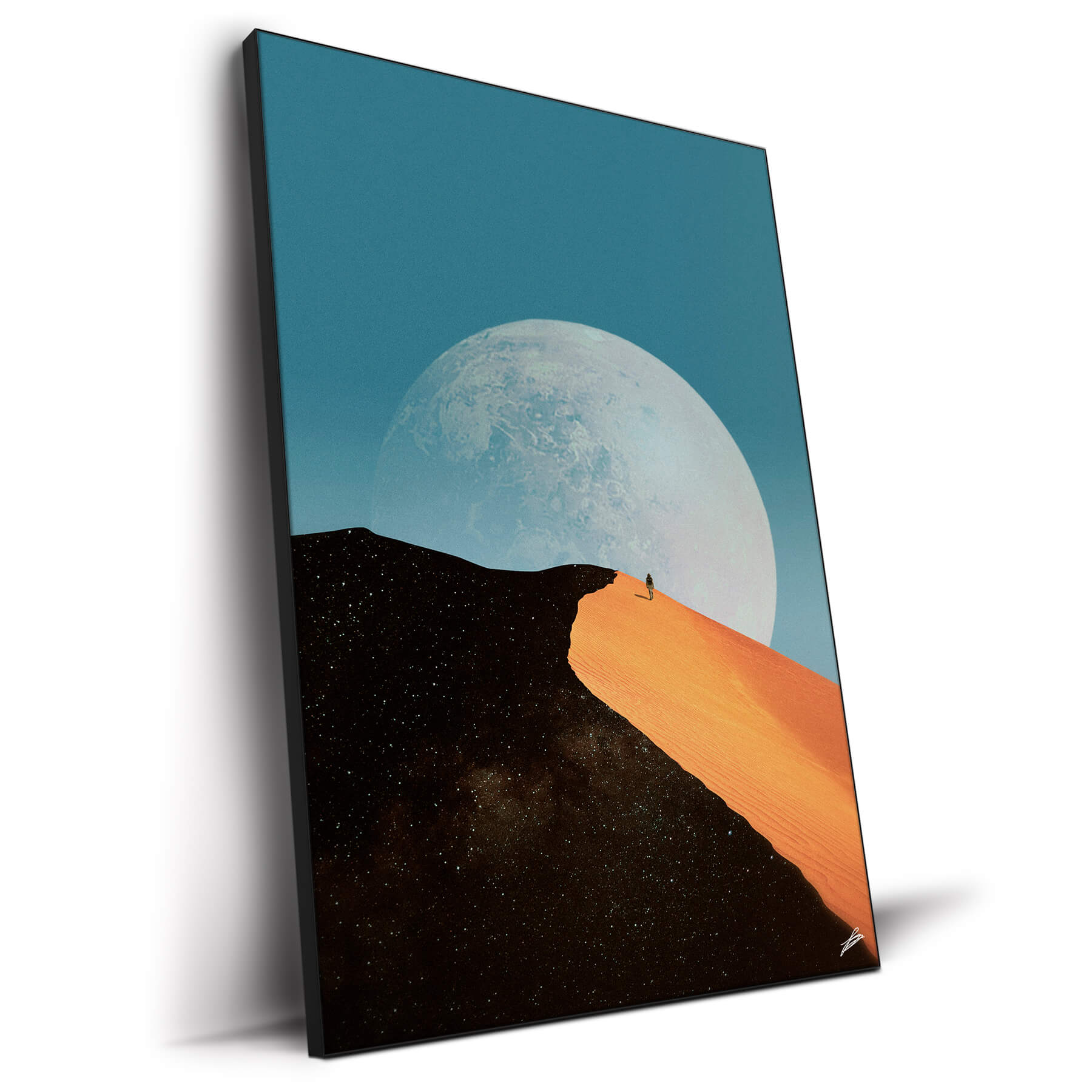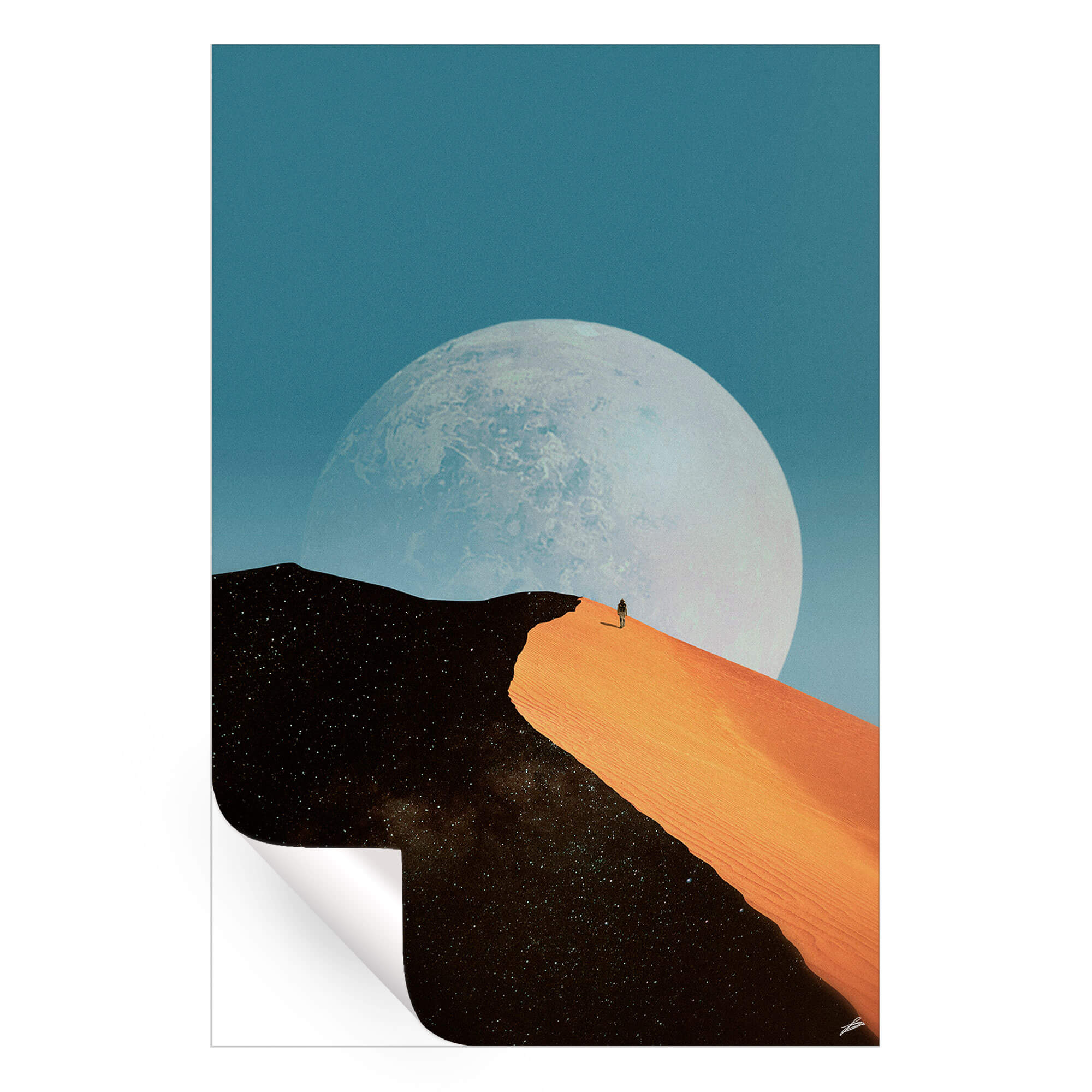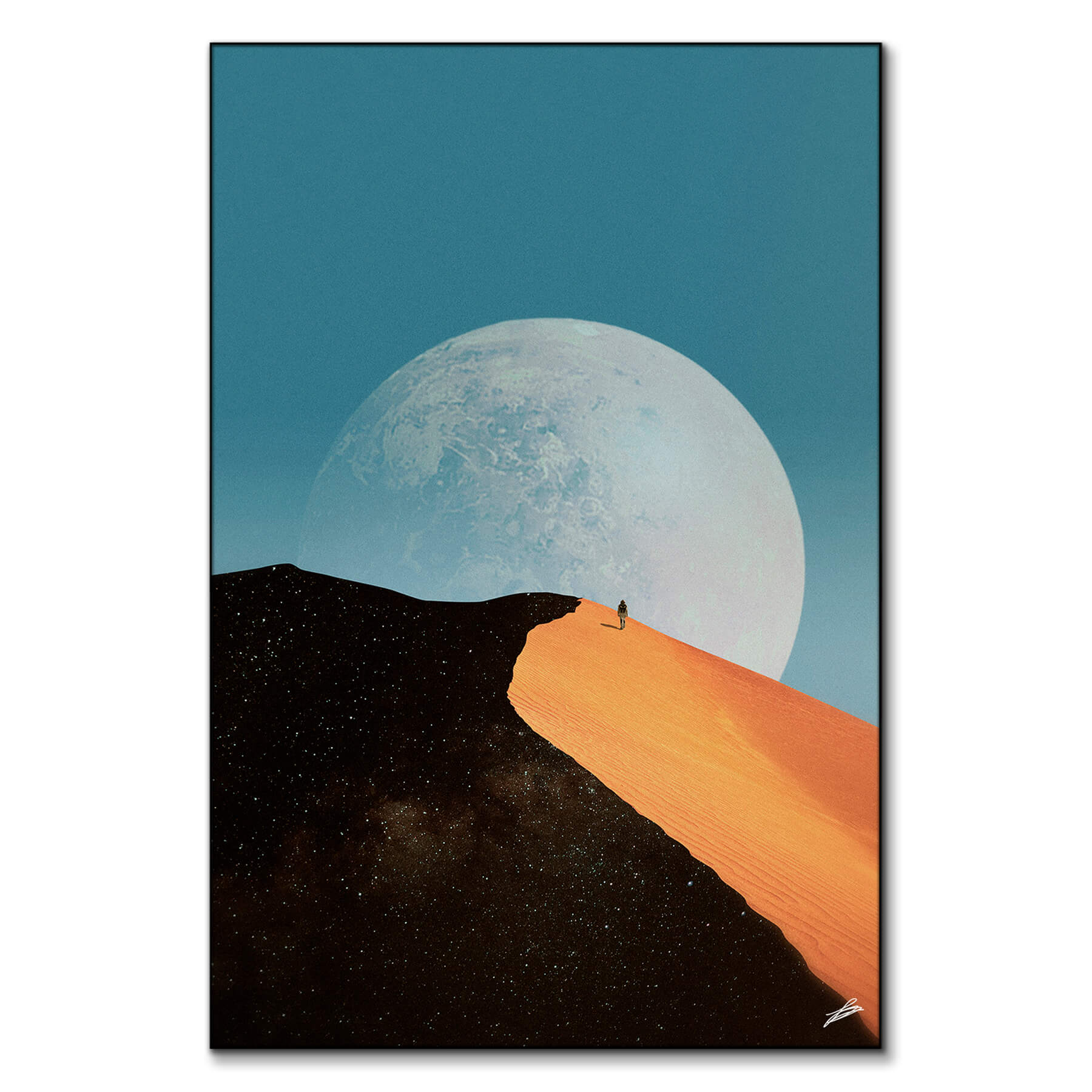 A surreal interpretation of a desert scene, where the familiar becomes fantastical. A colossal moon rises above a stark dune, with a river of molten lava flowing down its slope, blending the barren with the celestial.