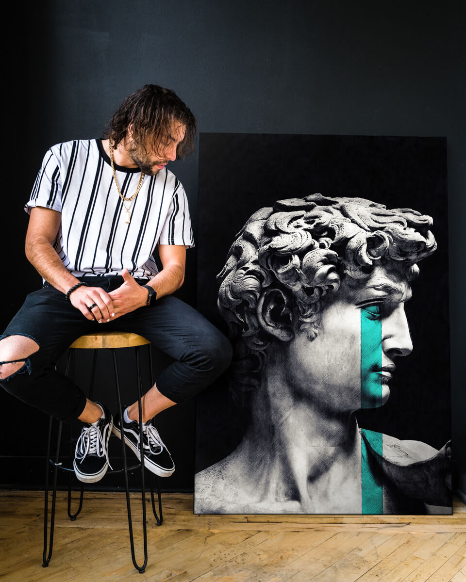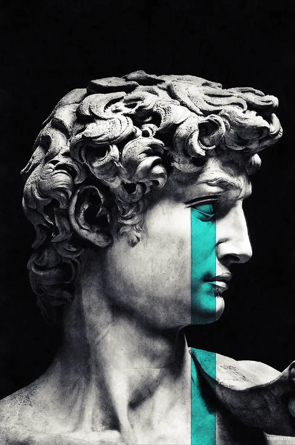A creative blend of classical and modern art, Michelangelo’s David is overlaid with a cyan-colored that is reminiscent of tears.