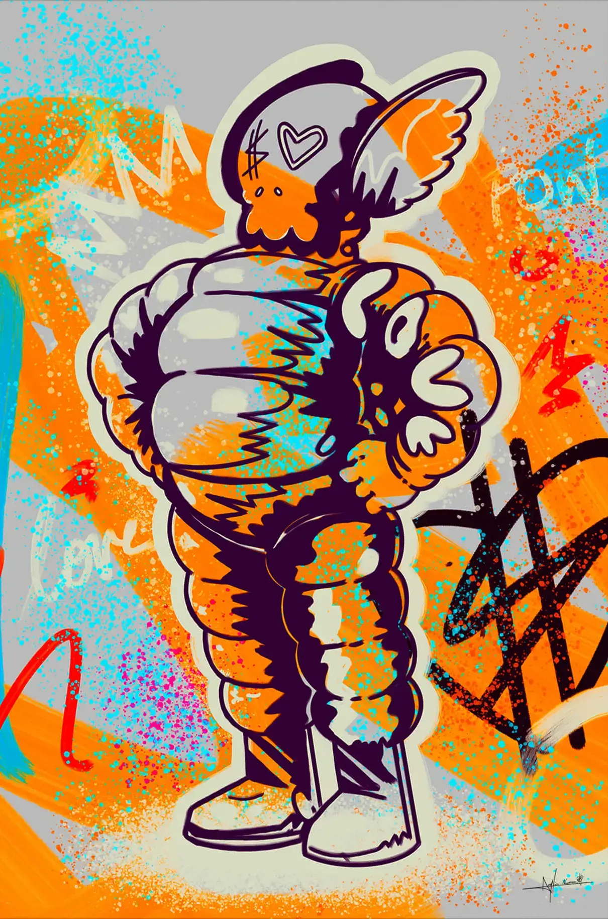 A caricatured figure with an oversized, muscular build, set against an abstract, vibrant orange backdrop. The character wears a baseball cap with a heart emblem, oversized shoes, and is striking a confident, hands-on-hips pose. Energetic splashes of color and graffiti-like scribbles add a playful, urban edge to the piece.