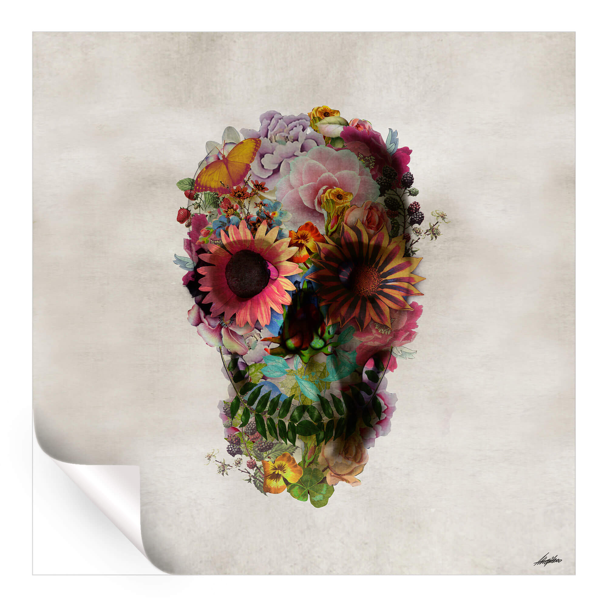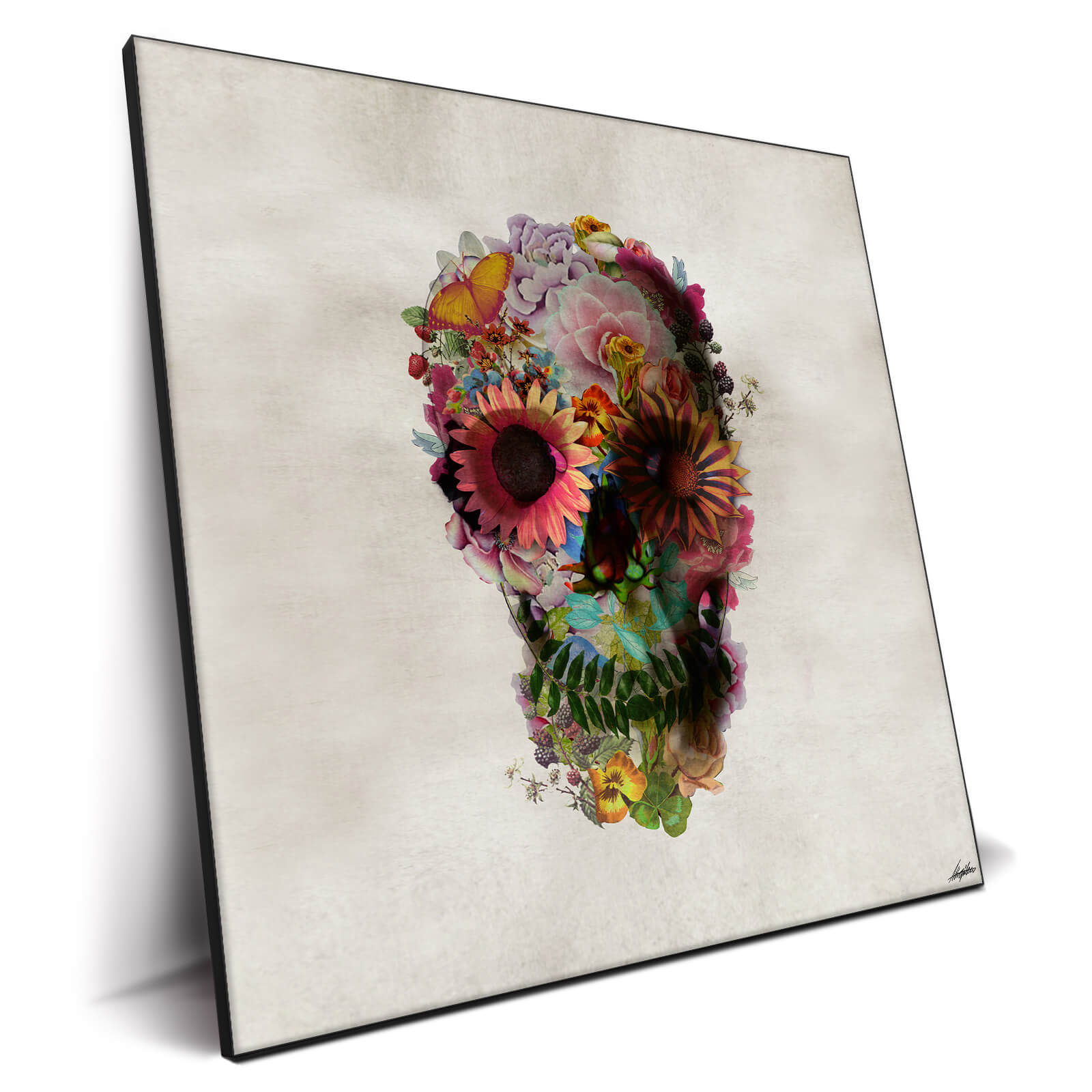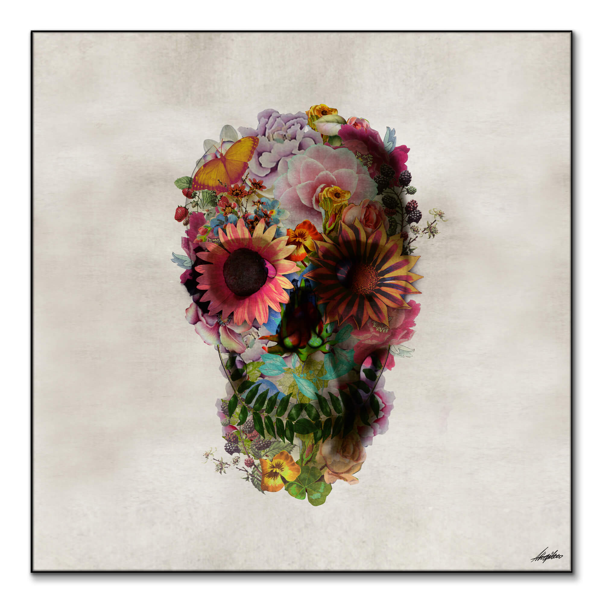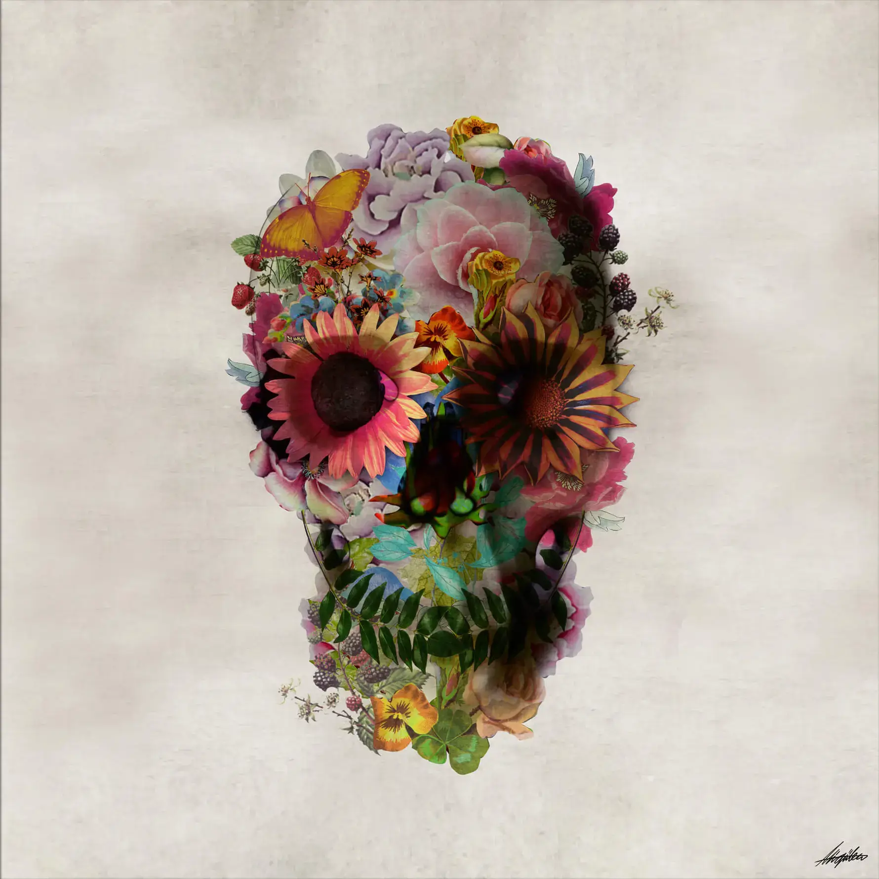 Sunflowers and delicate blossoms come together to form a peaceful skull, where the cycles of nature and the artistry of imagination intertwine.