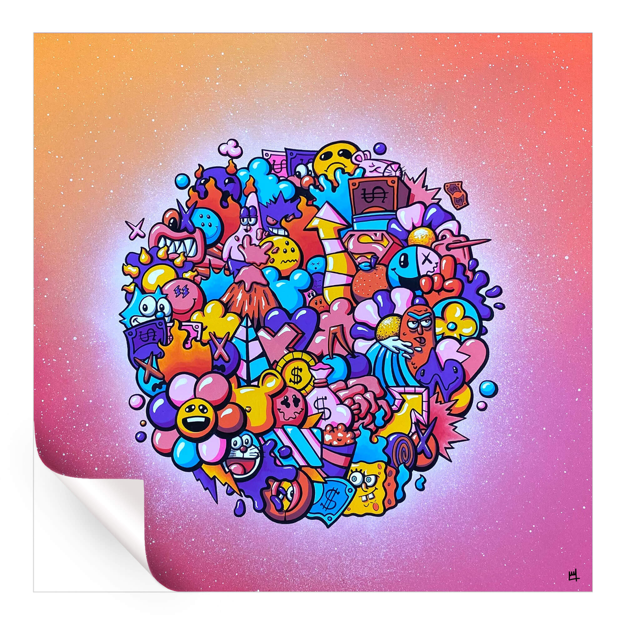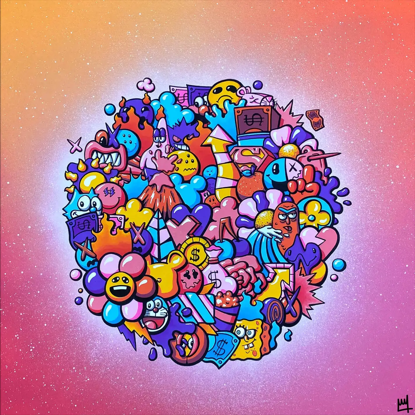 A vibrant cluster of animated characters and symbols forms a nebulous heart at the center of this artwork. The cartoon doodle characters vary in expression and form, creating a rich tapestry of cartoonish imagery that seems to pulsate with life. The surrounding space is rendered in a gradient of warm hues, reminiscent of a sunset, which transitions into the cool speckle of a starry night sky, framing the central explosion of color and giving the composition a cosmic feel.