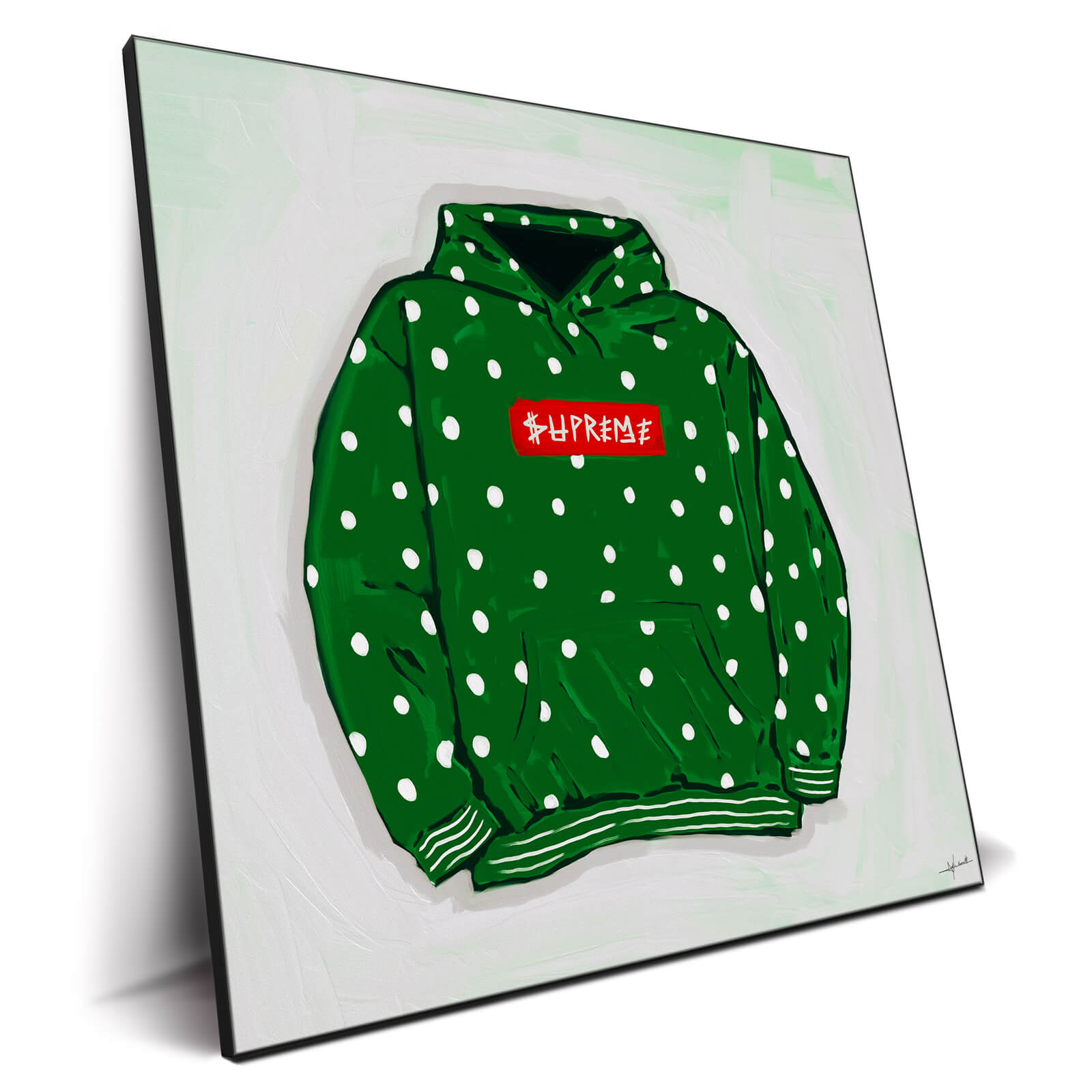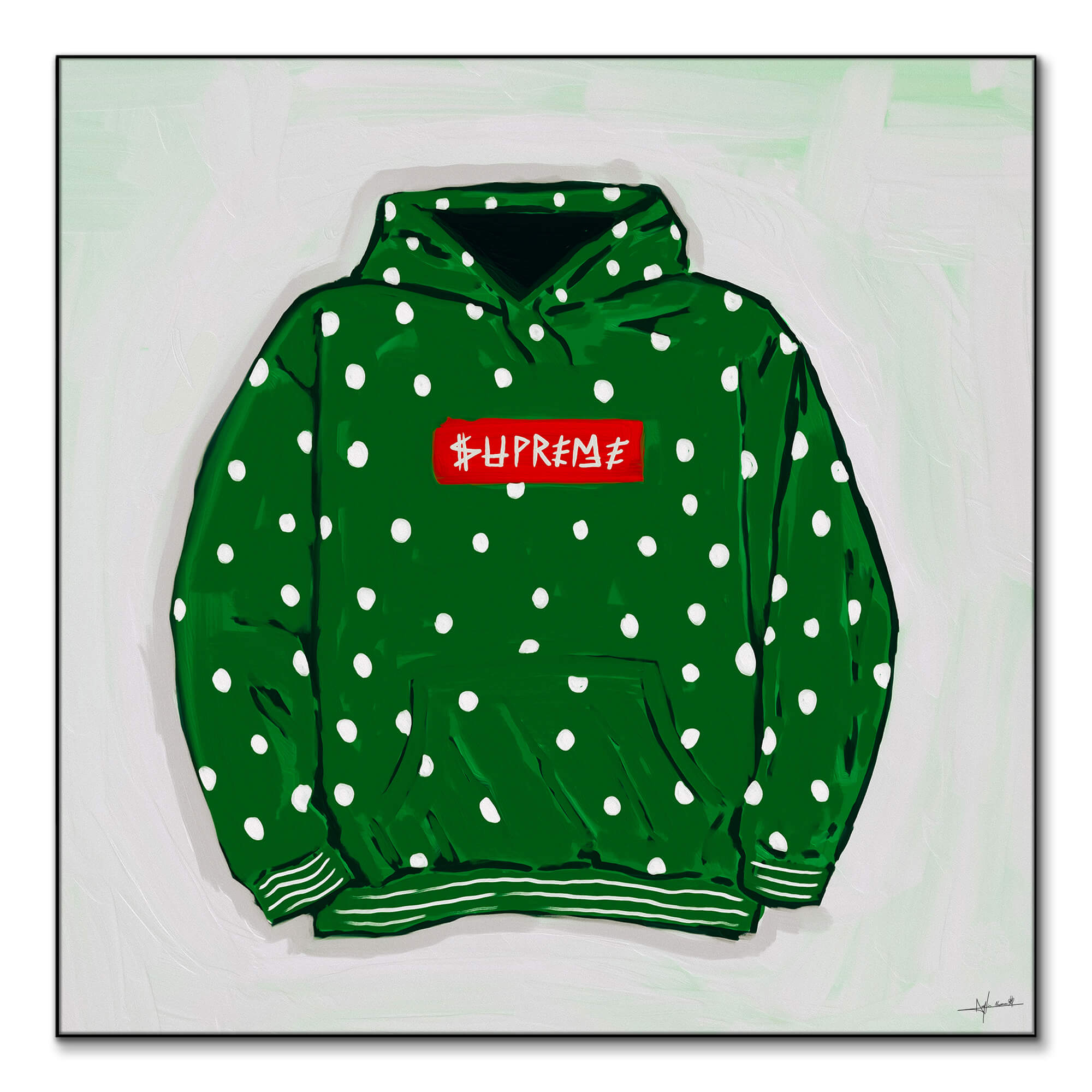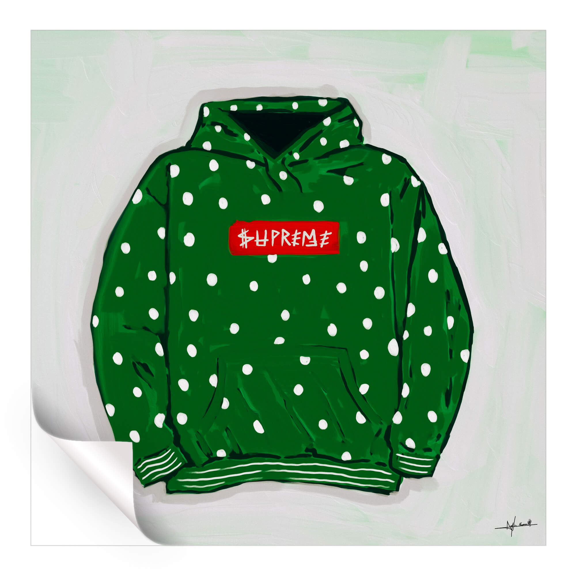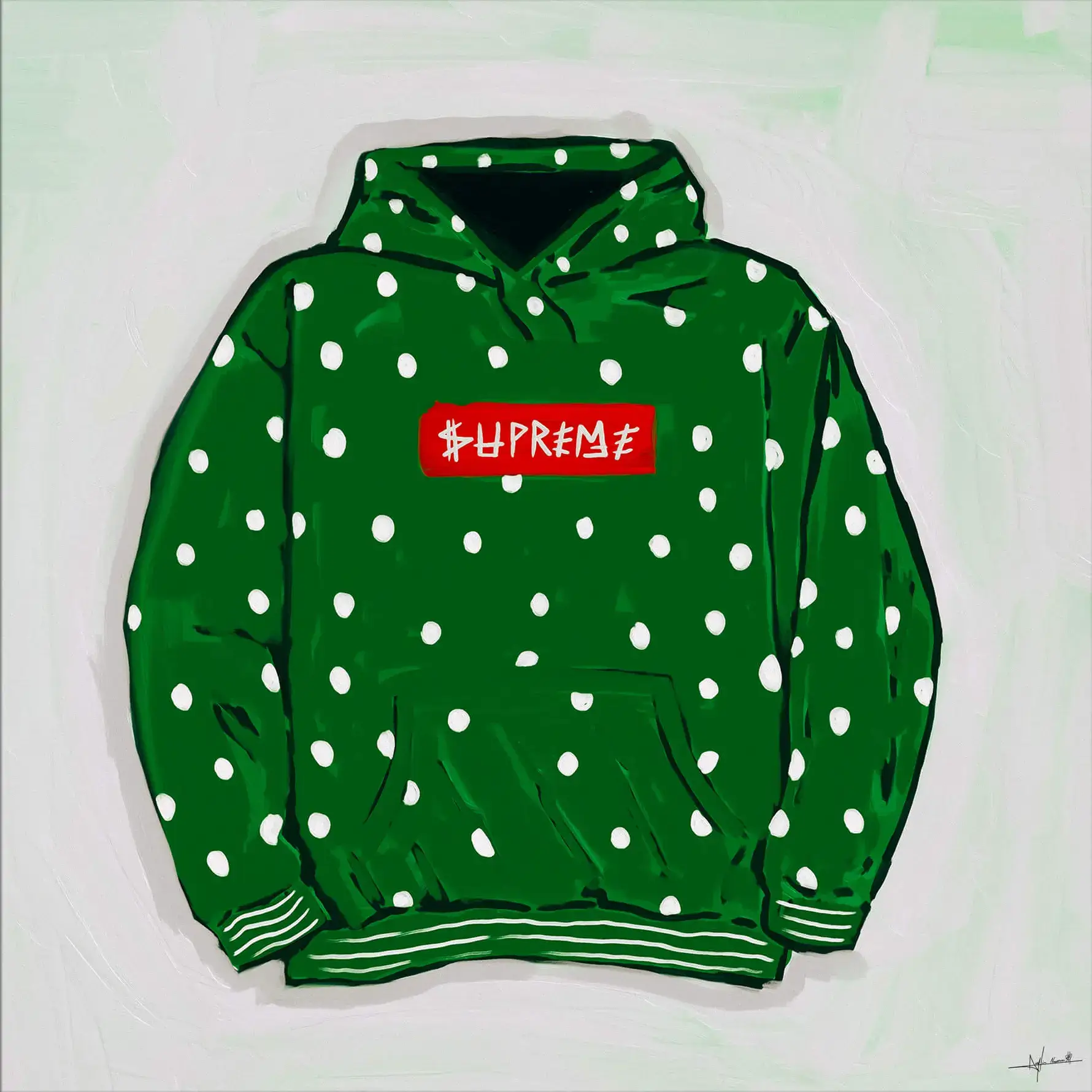 Centered in the piece is a green hooded sweatshirt with a distinctive white polka dot pattern. The iconic red Supreme logo across the chest stands out against the green, making a bold statement. The sweatshirt is depicted with a sense of volume and texture, giving it a lifelike appearance on a clean white background.