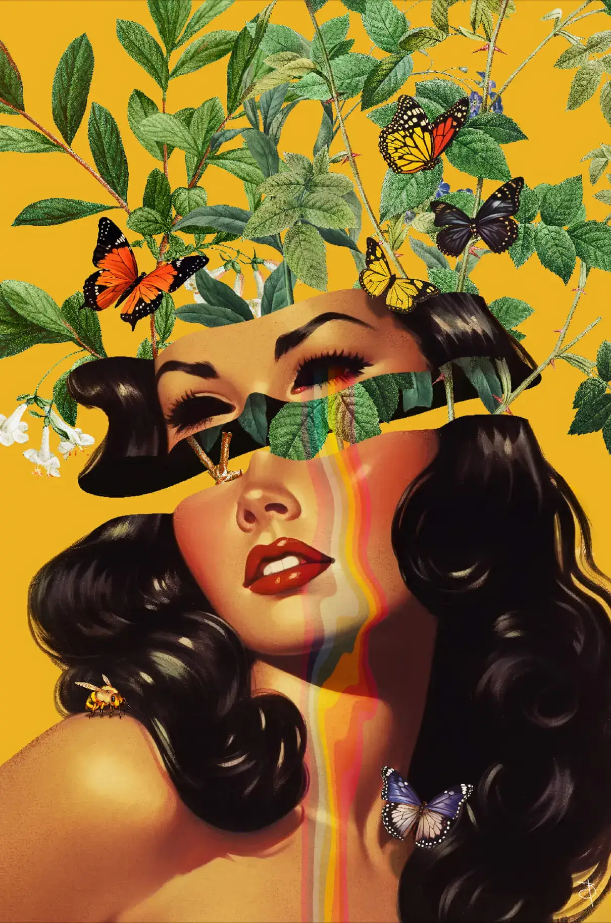 Vivid butterflies alight on leaves and float around the woman, whose eyes are closed in a serene expression. The artwork blends a classic portrait style with modern, abstract elements, creating a striking and imaginative piece.