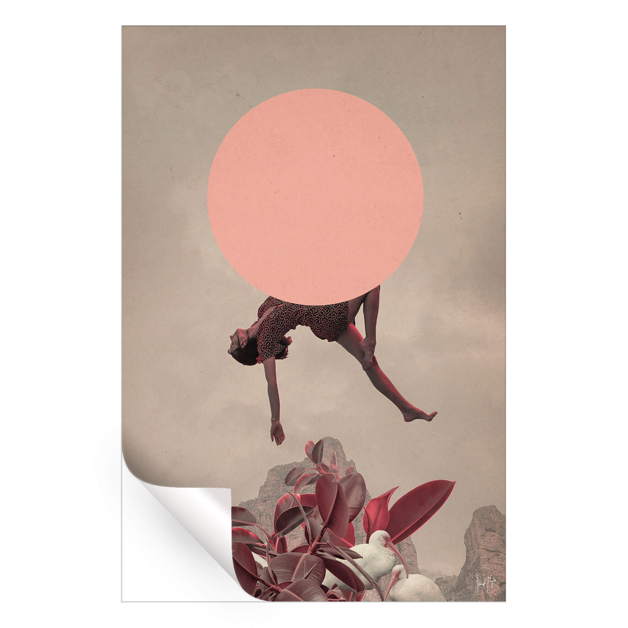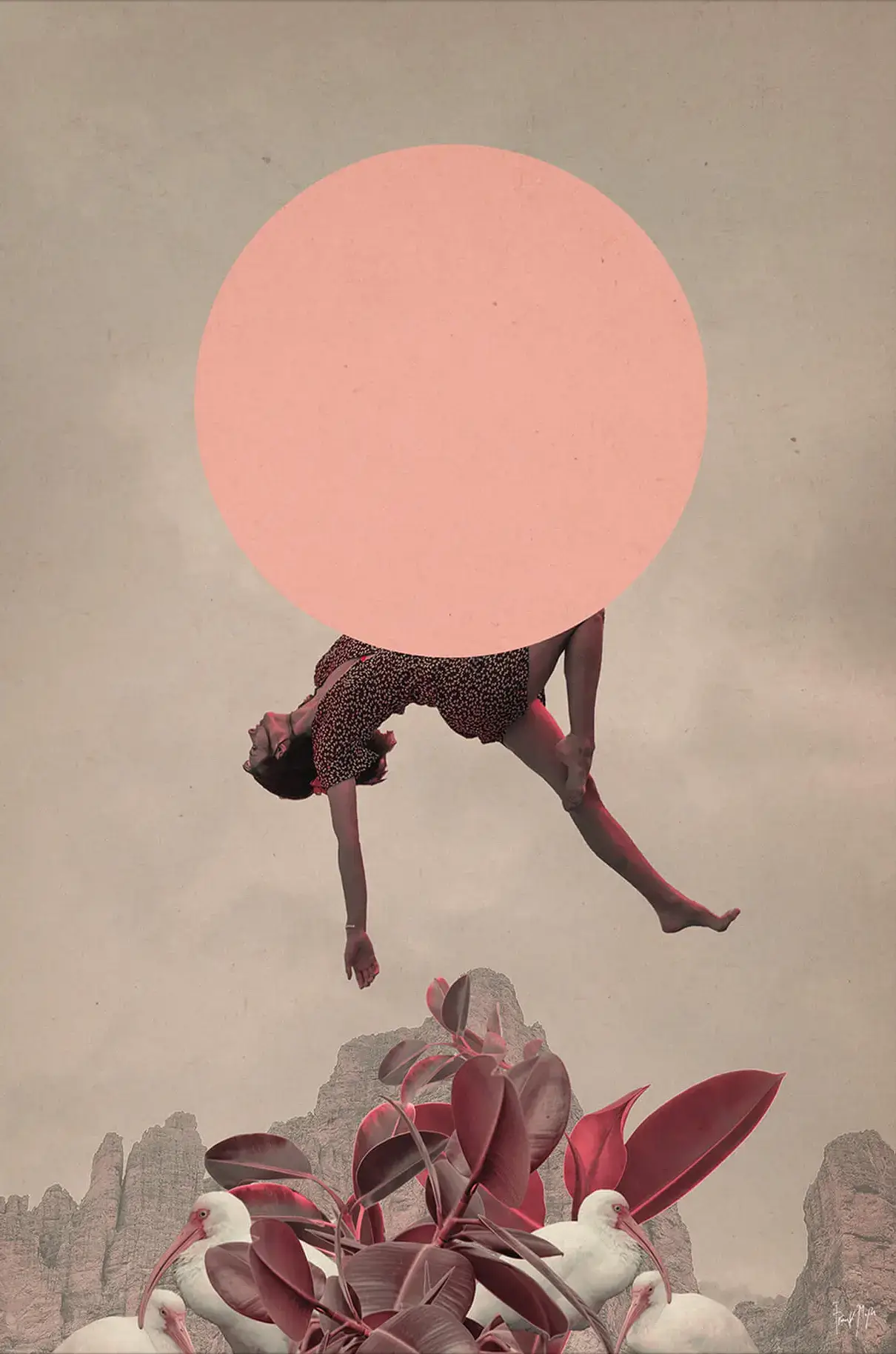 This surreal collage explores freedom and transformation through movement and color. A woman drifts effortlessly above desert peaks, balanced between a pale pink orb and abstract botanical forms below. The soft, neutral palette and minimal background make the floating figure feel weightless—like a dream caught midair.